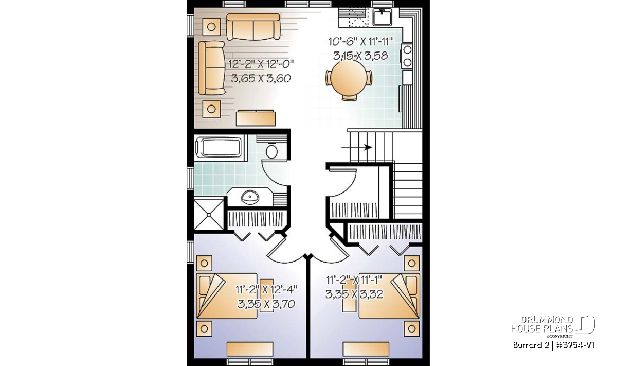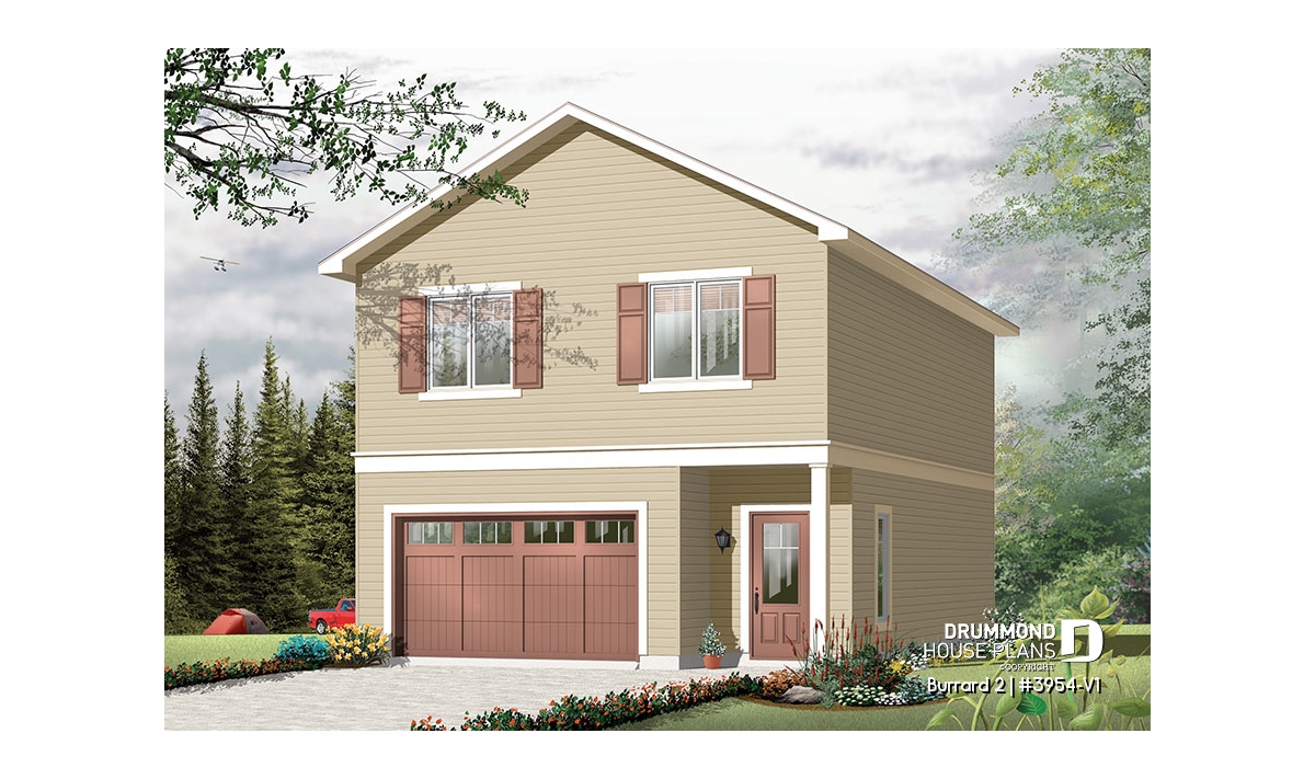 Popular as a cottage with room for “toys”, as an interim dwelling while the main house is being built or as a guest suite or mortgage helper, this little dwelling unit packs a lot of features into a small footprint. The ground floor features a nice size garage with workshop, laundry and interior or exterior access to the staircase. At the top lies an open concept living area with a eat-in kitchen and living room. Two bedrooms share a bathroom with bathtub and separate shower. In high-density areas, this is an excellent design including all expected amenities and an attached garage.