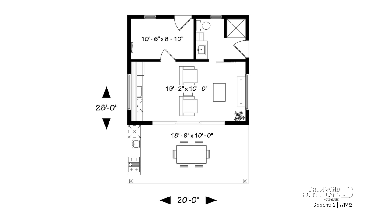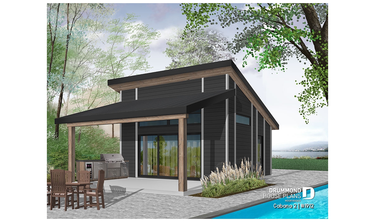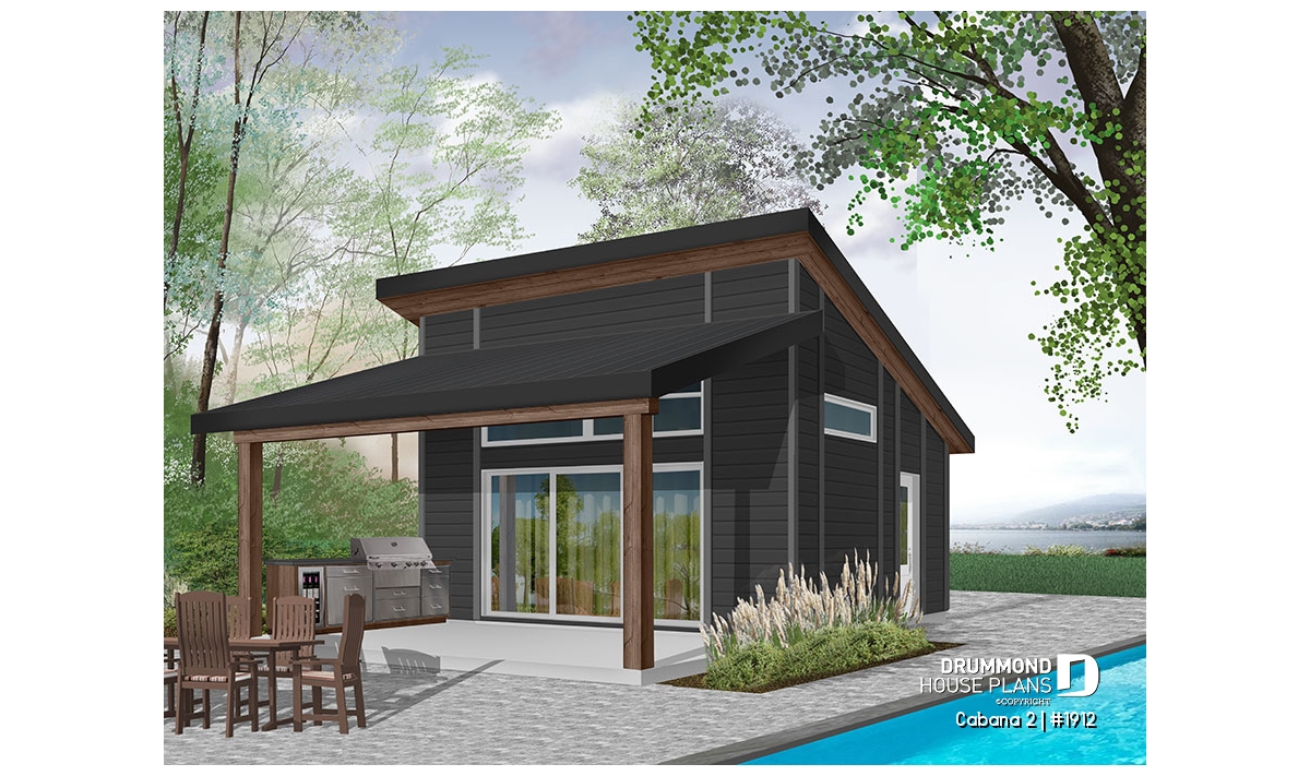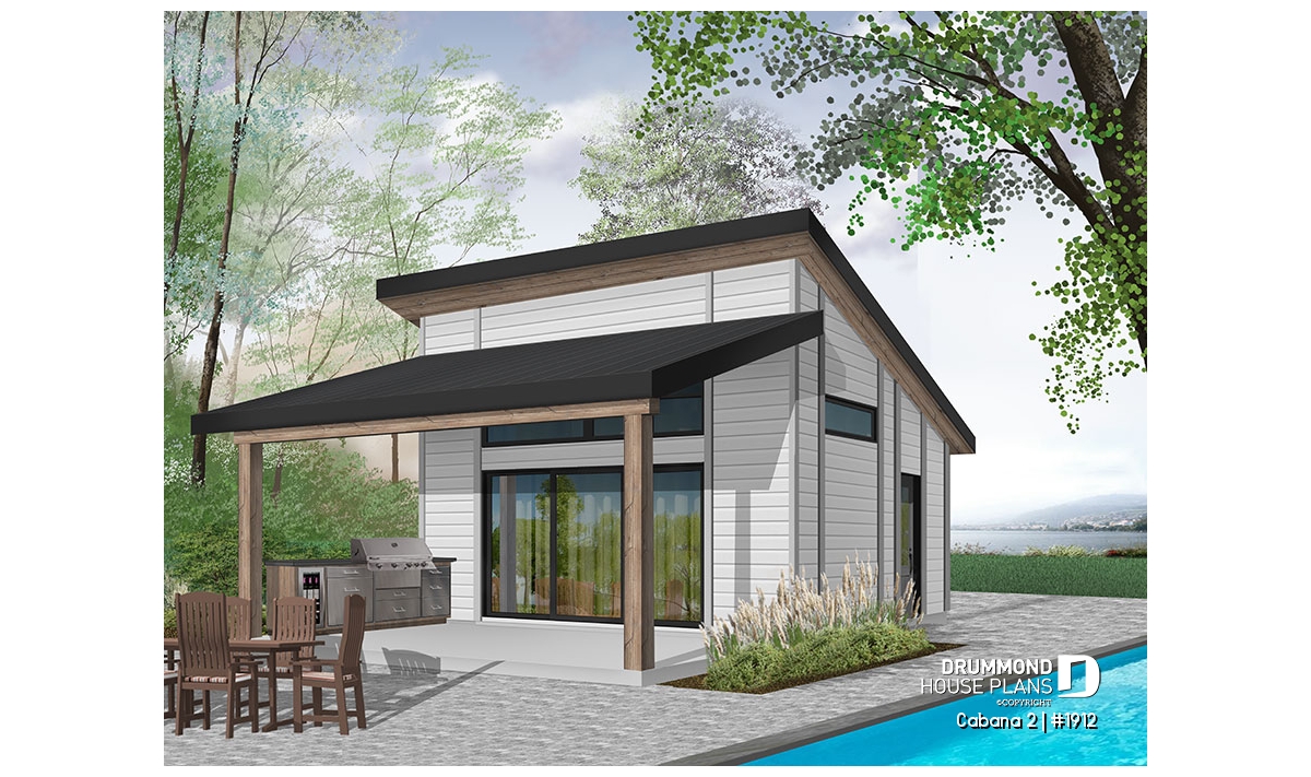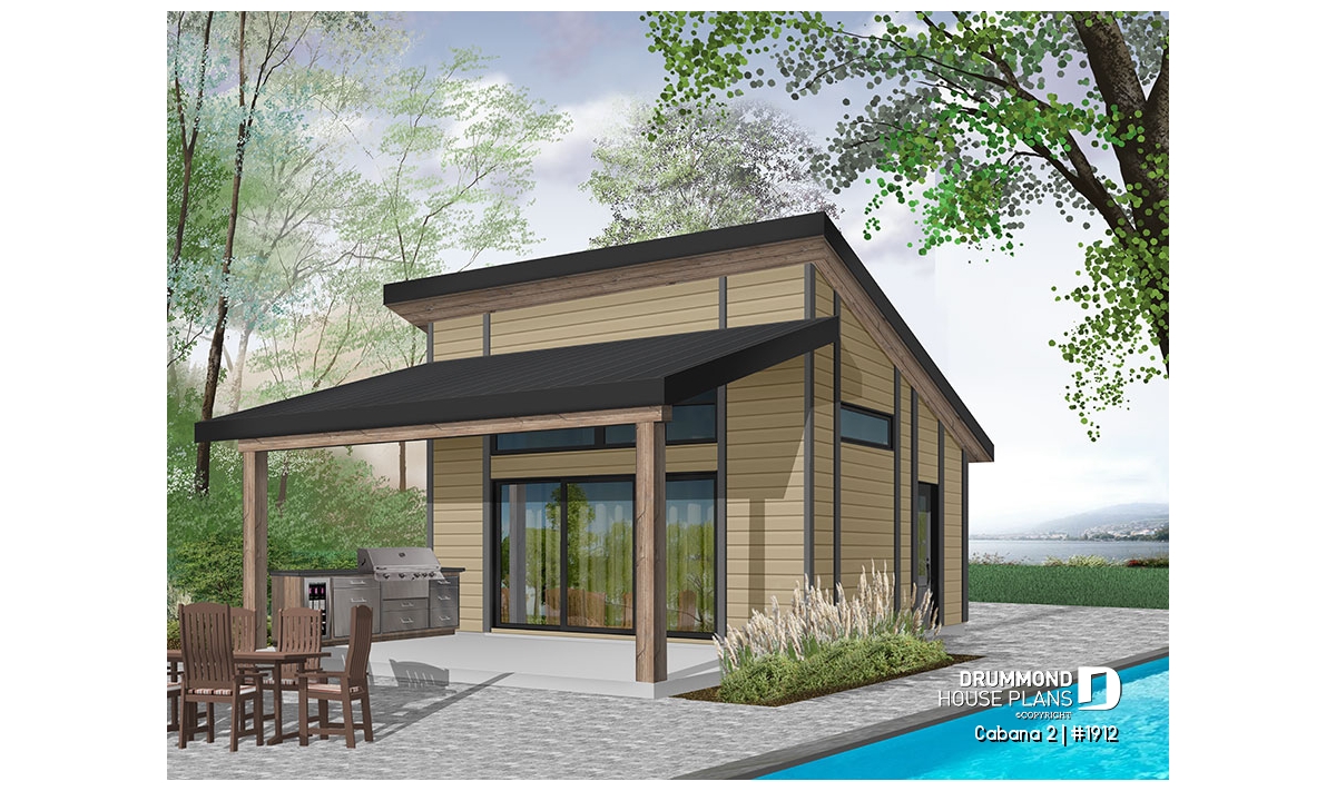 This new pool house plan or large cabana plan, will provide you with additional living space and storage during the summer season. Indeed, this new model of pool house, "Le Cabana" or plan # 1911 by Drummond House Plans, offers several conveniences not to be passed over in silence, like its large covered terrace. The latter is large enough to hold a kitchen area with BBQ, sink and refrigerator. In addition, an outdoor dining area, with enough space to accommodate a table of 6 to 10 people. A television could even be installed outside and lounge furniture could replace the table, it's up to you!