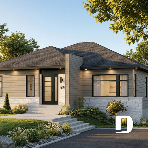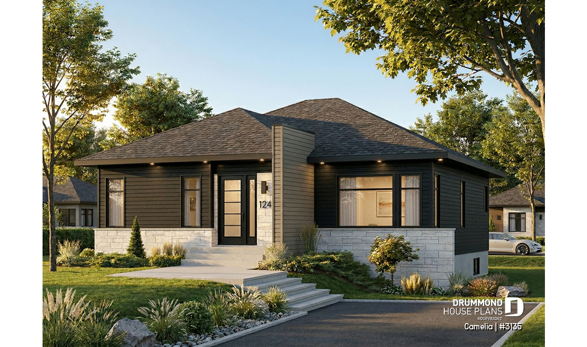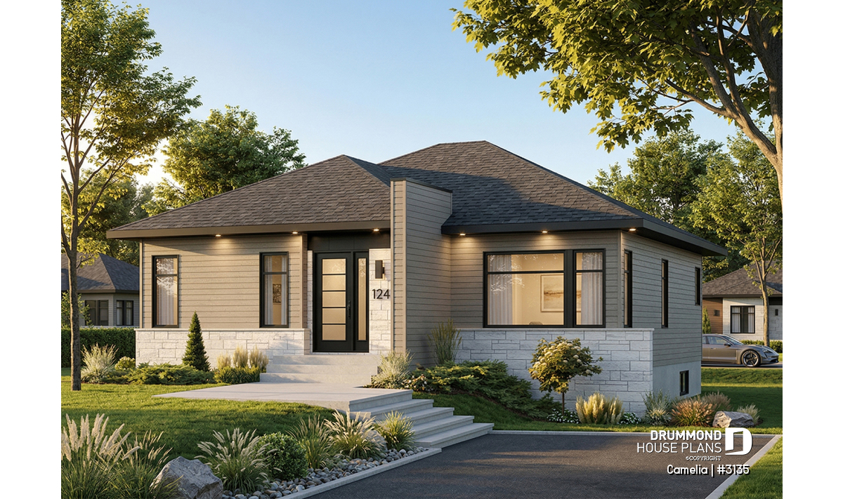 A simple roofline, architectural entry accent and modern windows result in an exciting update to the basic bungalow.