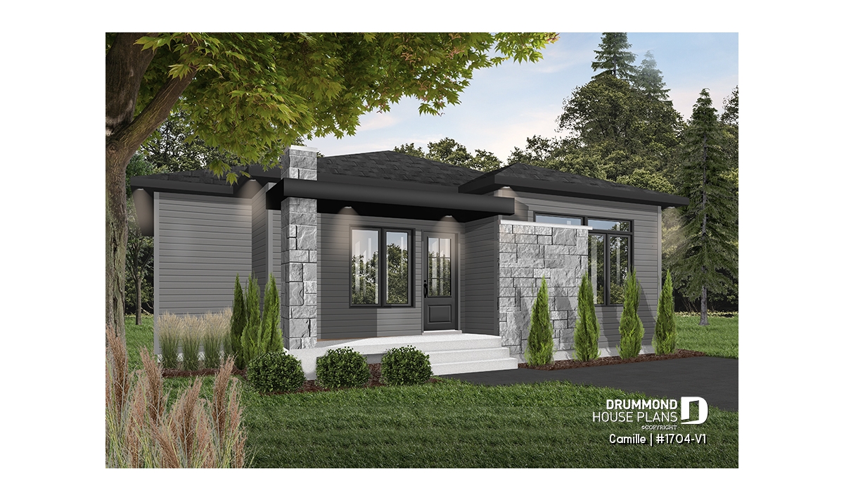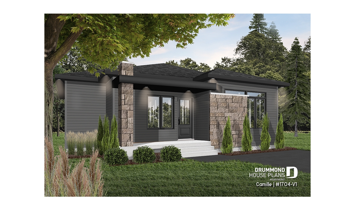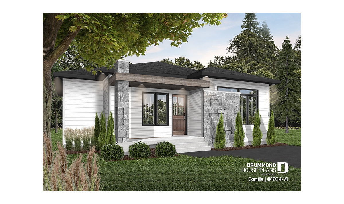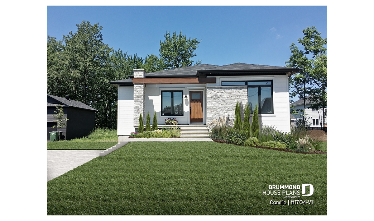 The Camille house plan (#1704-V1) stands out with its mid-century modern style, offering clean lines, timeless appeal and a layout perfectly suited to today’s lifestyle. Designed to deliver comfort from day one, this home features 1,178 sq. ft. on the main floor, with an equally sized basement, providing excellent potential for future expansion.