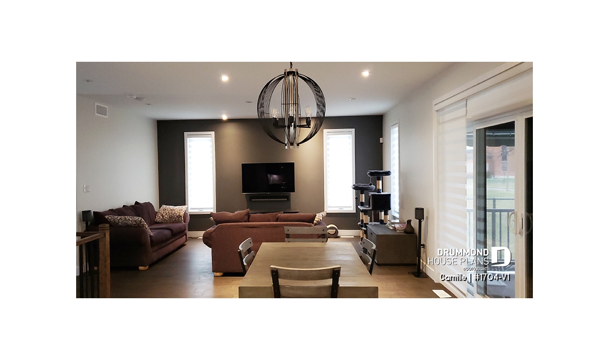 Open to the living room, the dining area benefits from abundant natural light thanks to generous window placement. This open-concept layout promotes fluid circulation and creates an inviting environment for family life and entertaining.