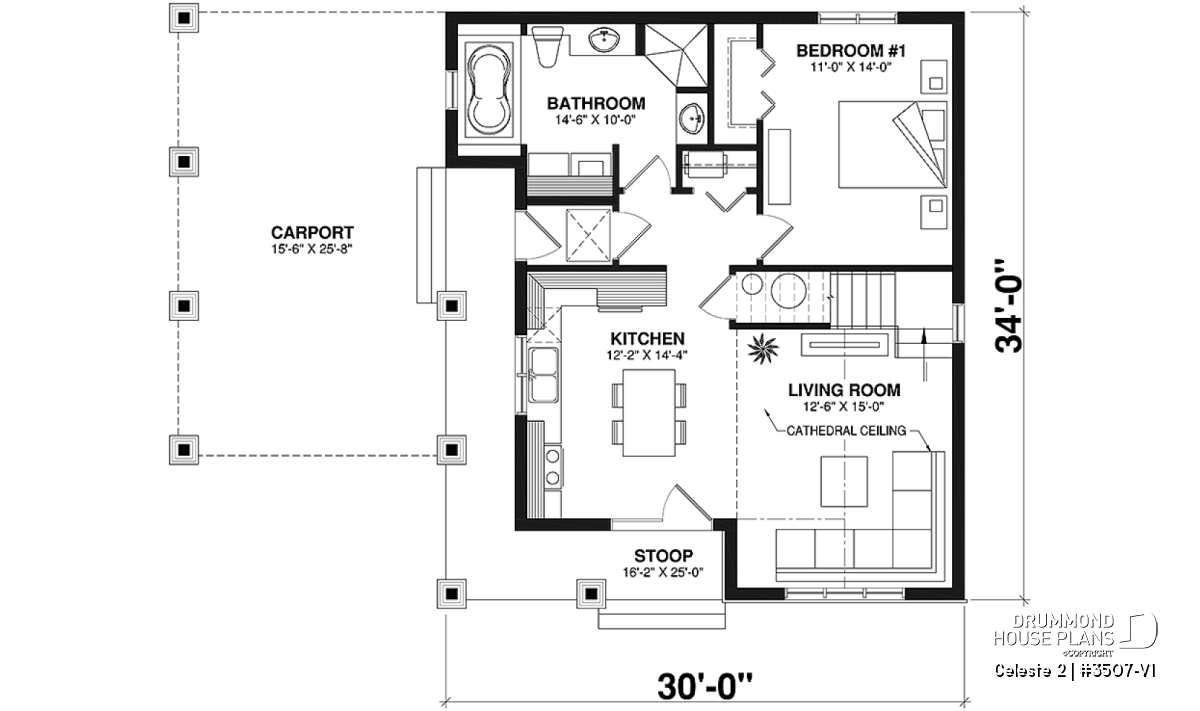 Cathedral ceiling in the living room. Master bedroom on main level. Mezzanine or bedroom #3 on 2nd level with a view on the living room. Bonus space above the carport, which can be converted to a family room or large bedroom #4. Washer-dryer on the main floor.