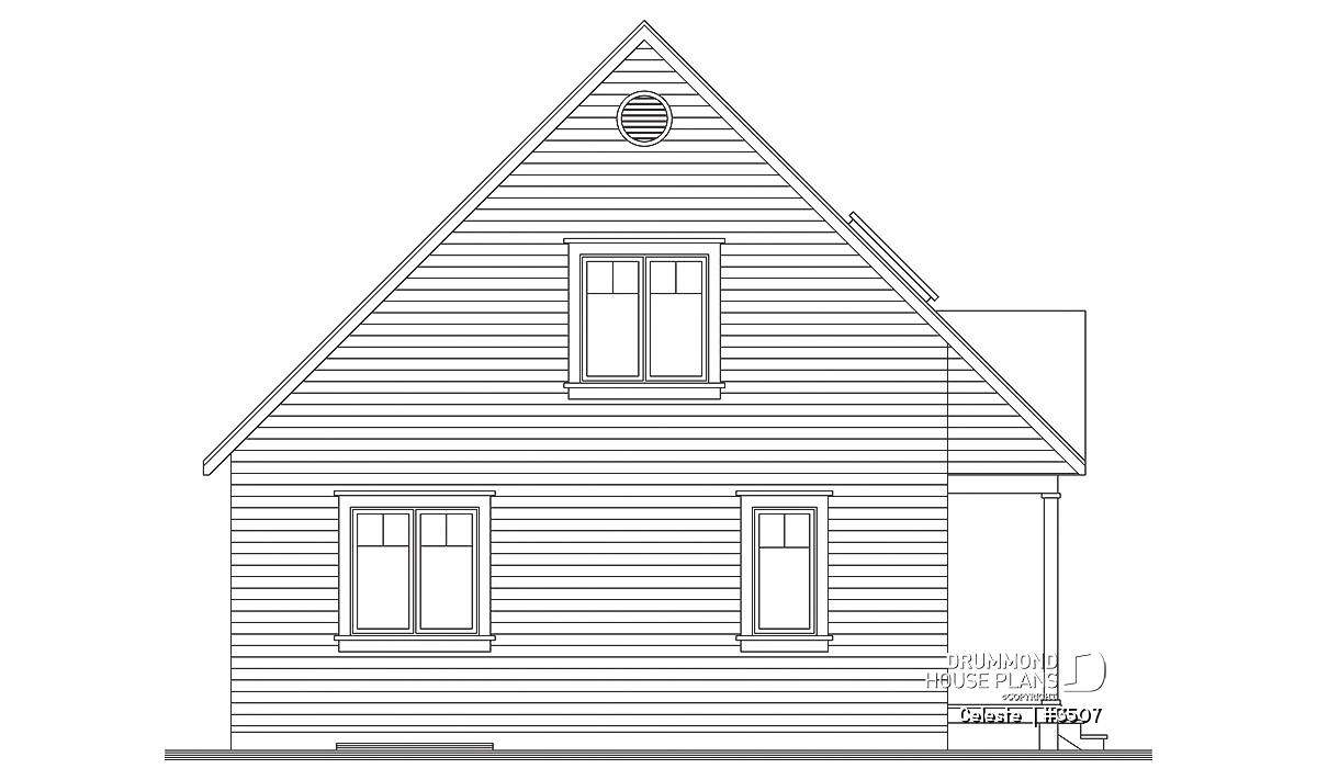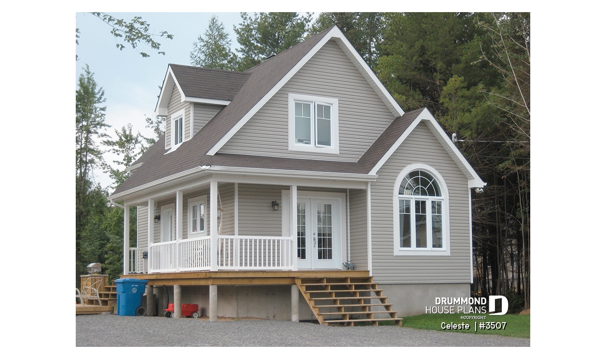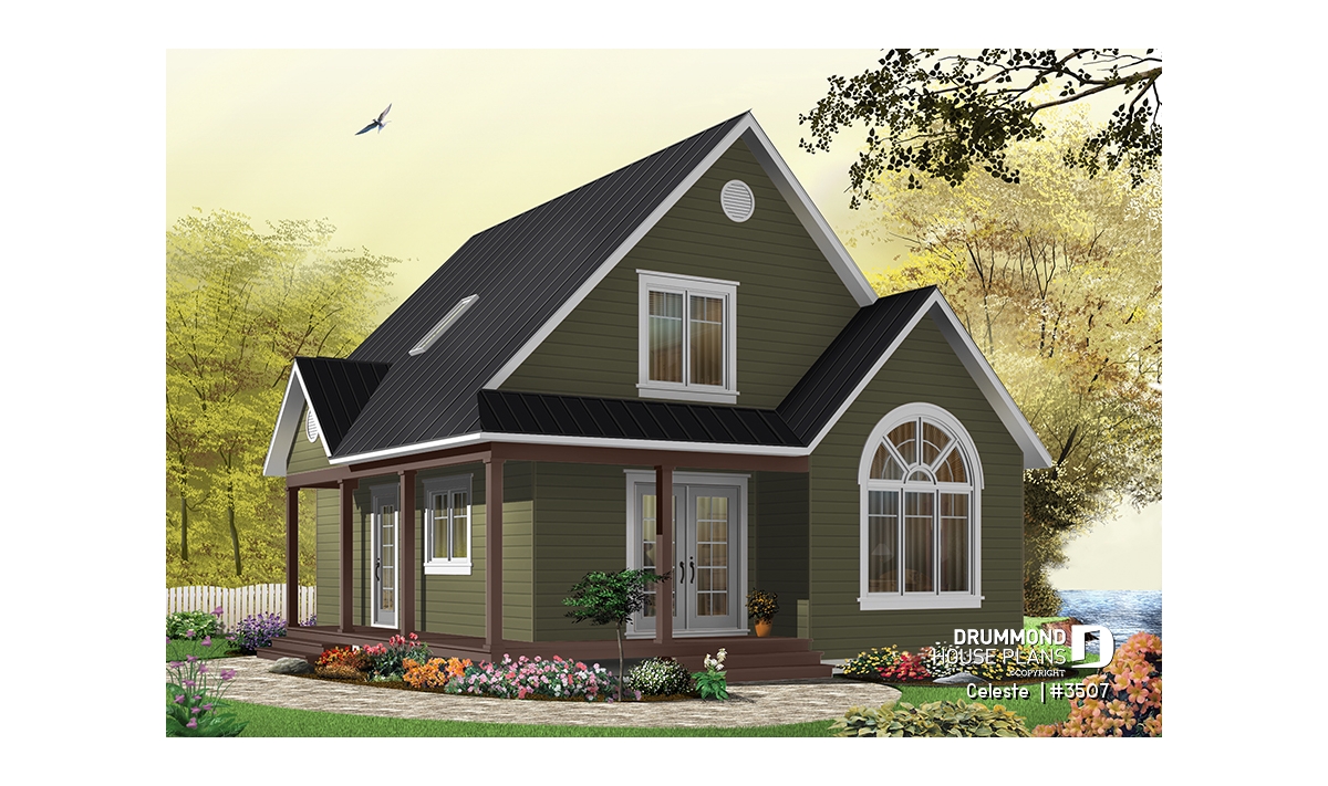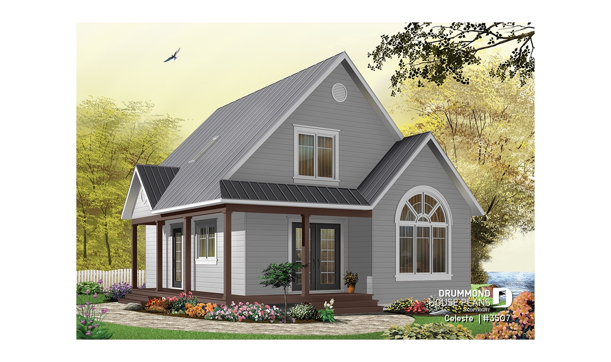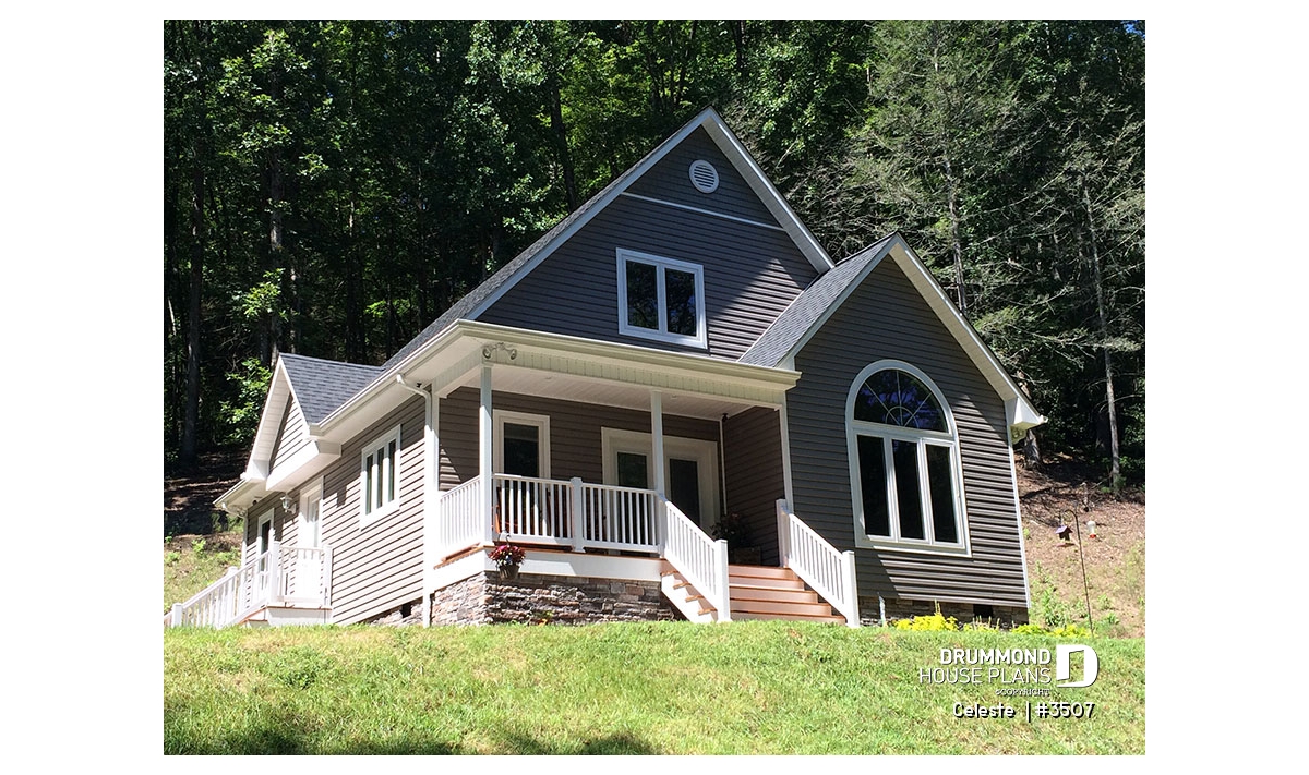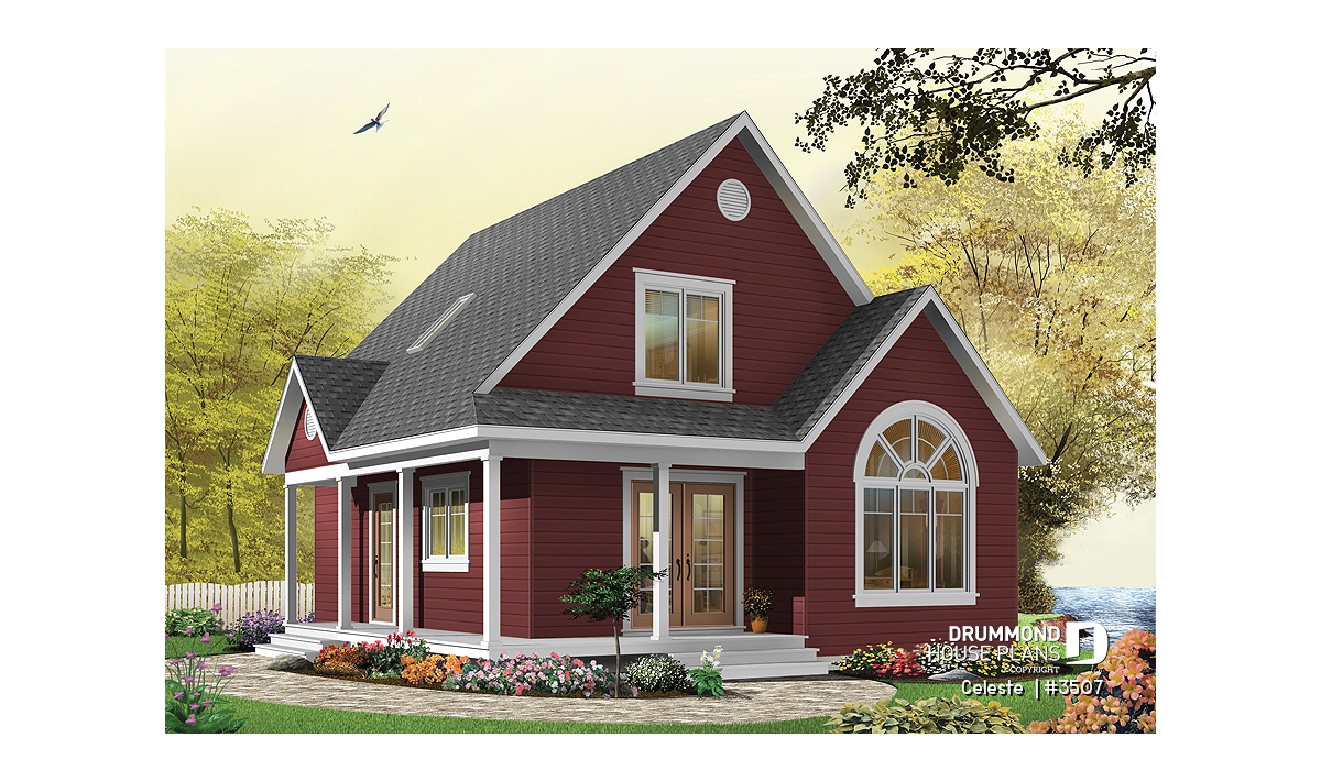 As with 2597, plan 3507 proposes a wraparound porch on two sides with an arched window that reveals a cathedral ceiling in the living room. The simple lines of this model offer surprising affordability to its many attractive features.