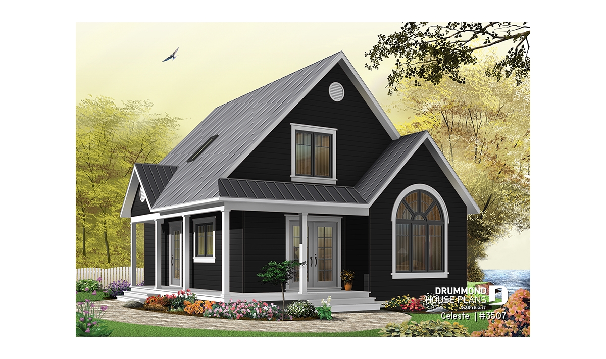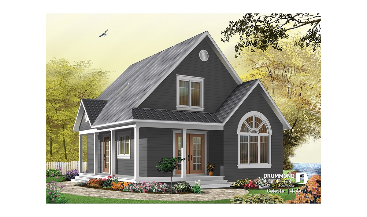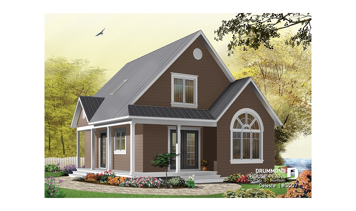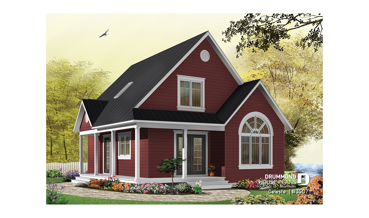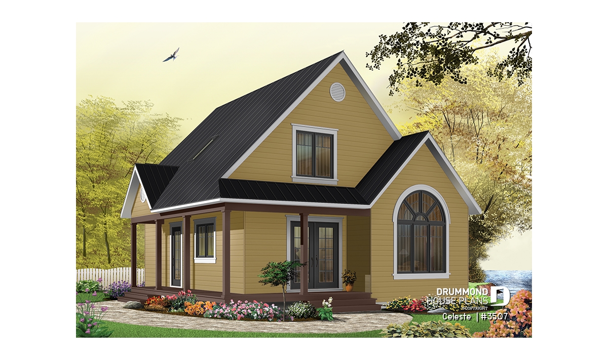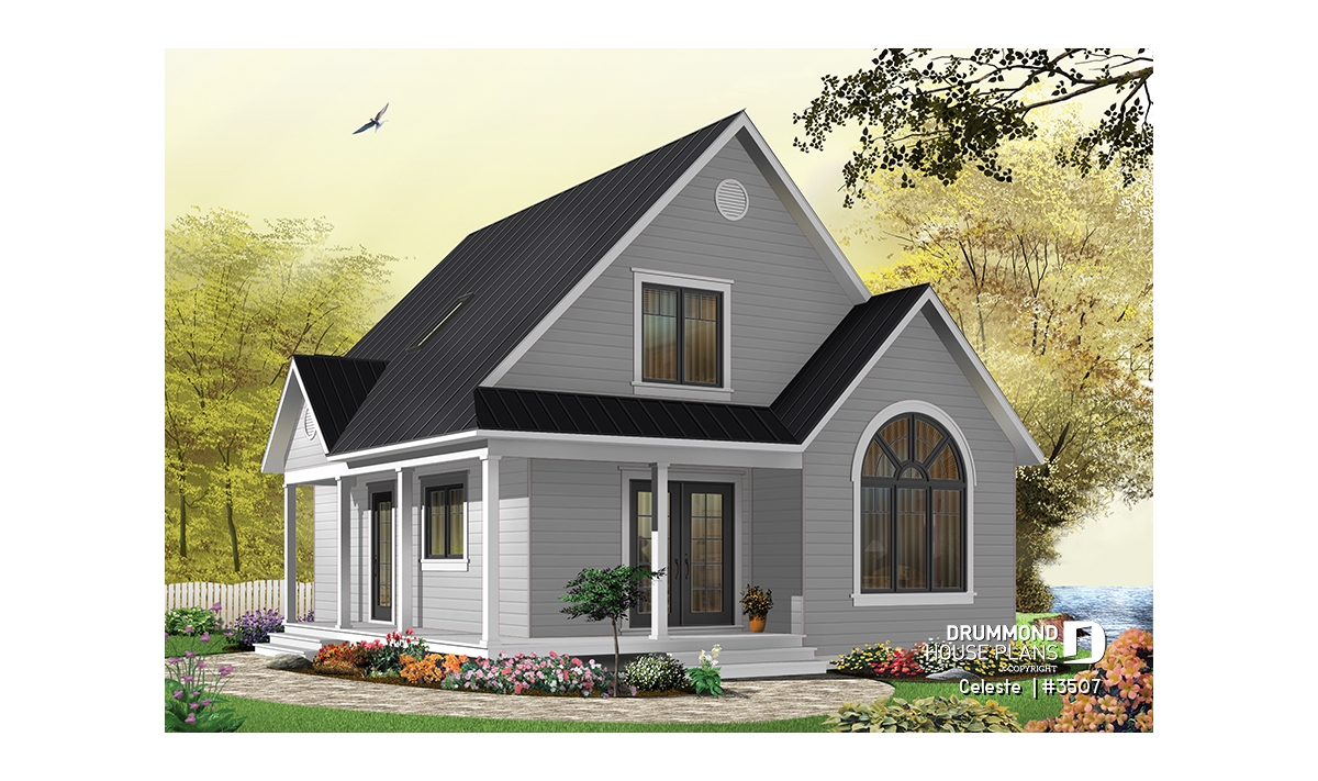 As with 2597, plan 3507 proposes a wraparound porch on two sides with an arched window that reveals a cathedral ceiling in the living room. The simple lines of this model offer surprising affordability to its many attractive features.