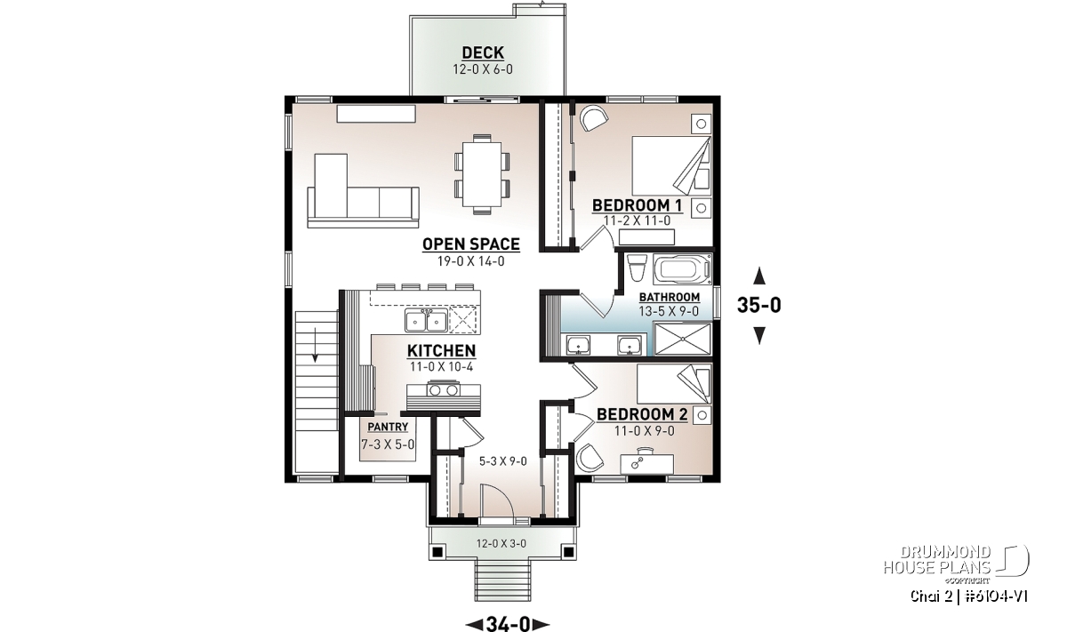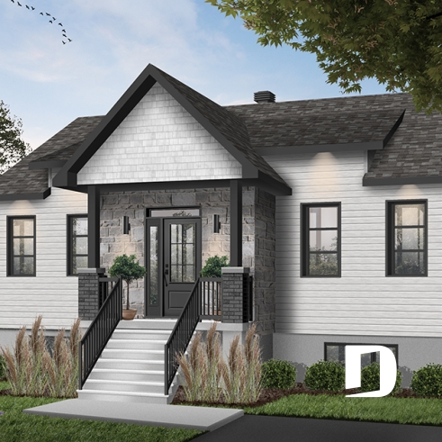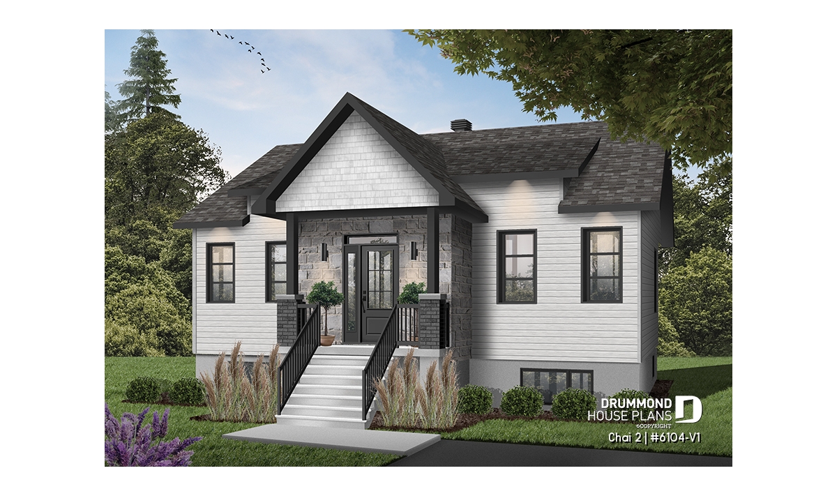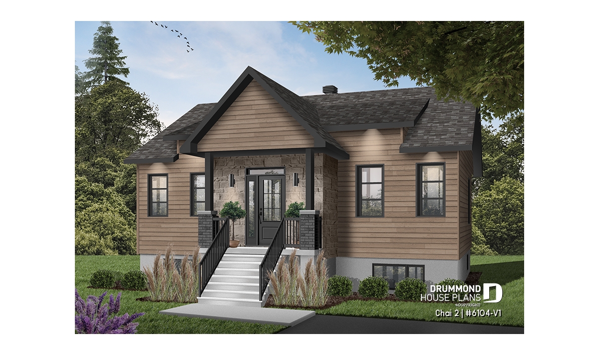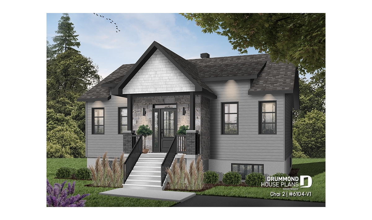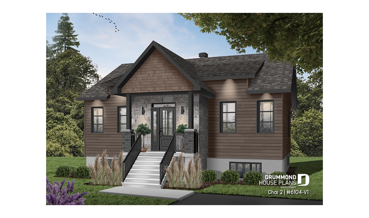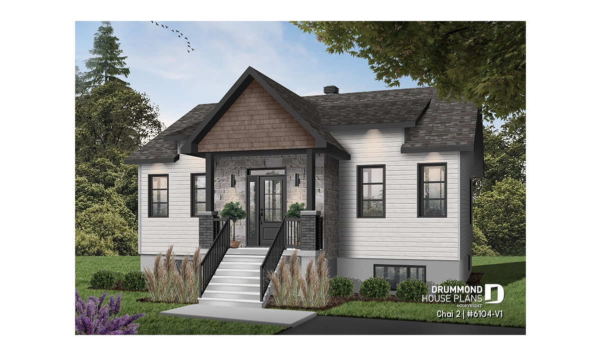 This bungalow, CHAI 2 (6104-V1), is a modern and rustic 1,102-square-foot house offering 2 bedrooms and 1 bathroom. The interior architecture has been designed to give an effect of space to this small plan. With 9’ ceilings throughout the main floor and the open layout, the challenge is successfully done.