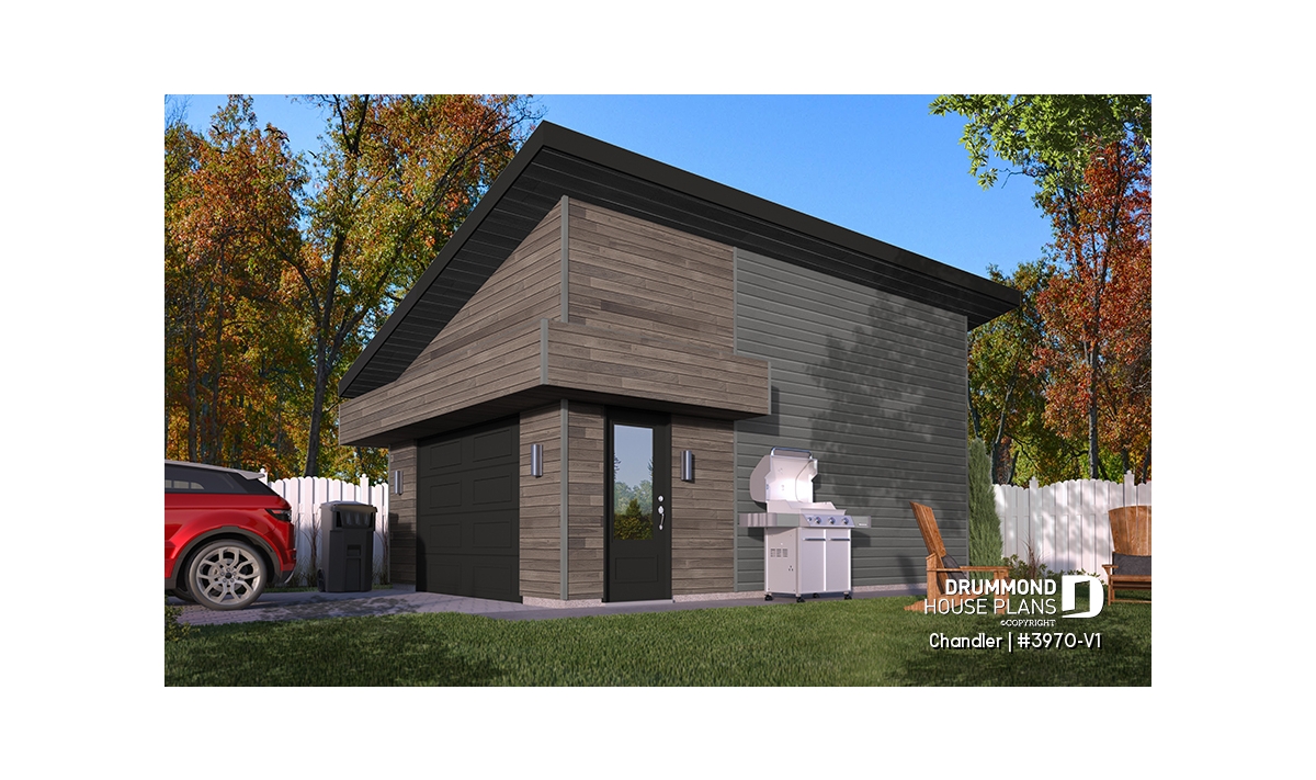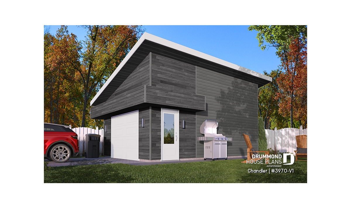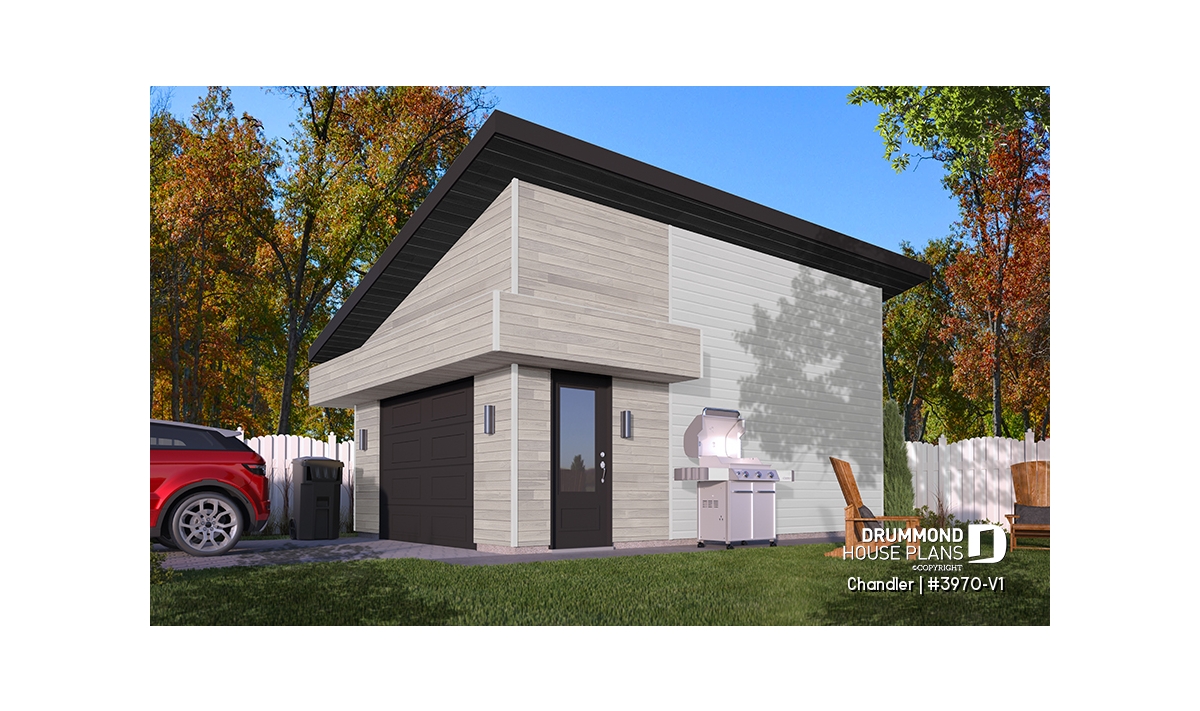 Contemporary style one-car garage plan.