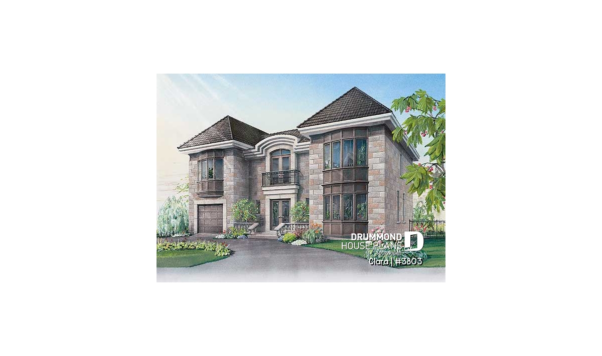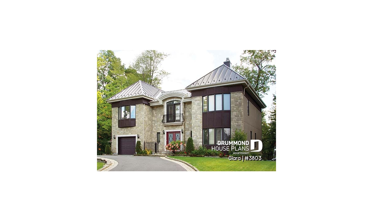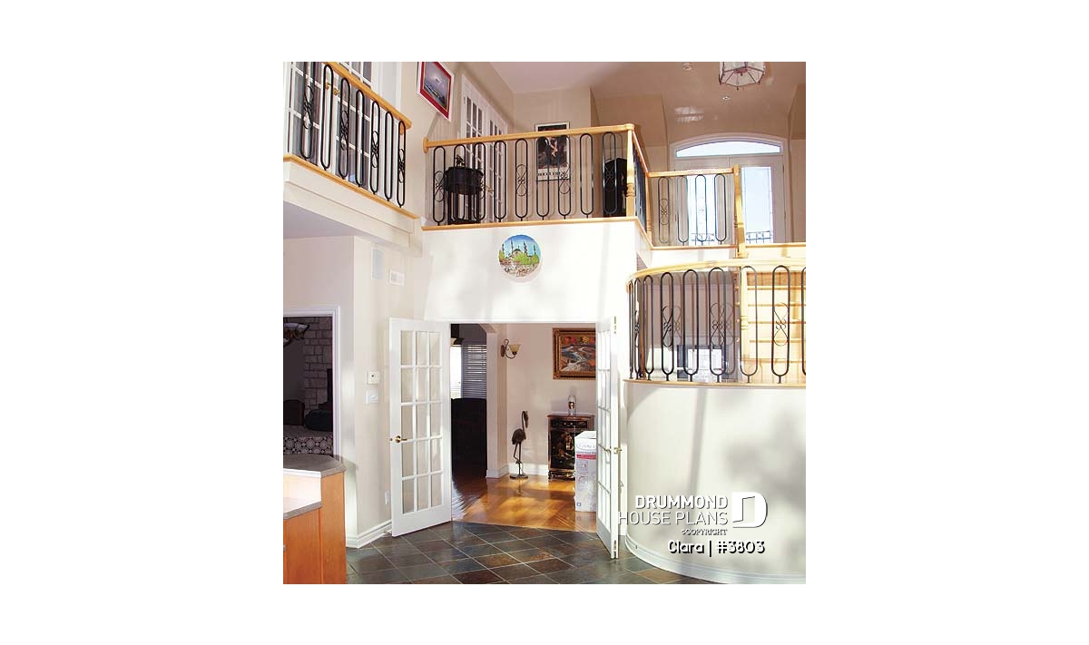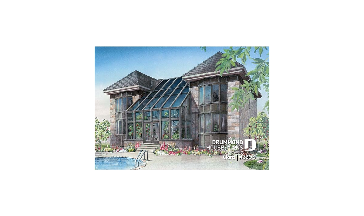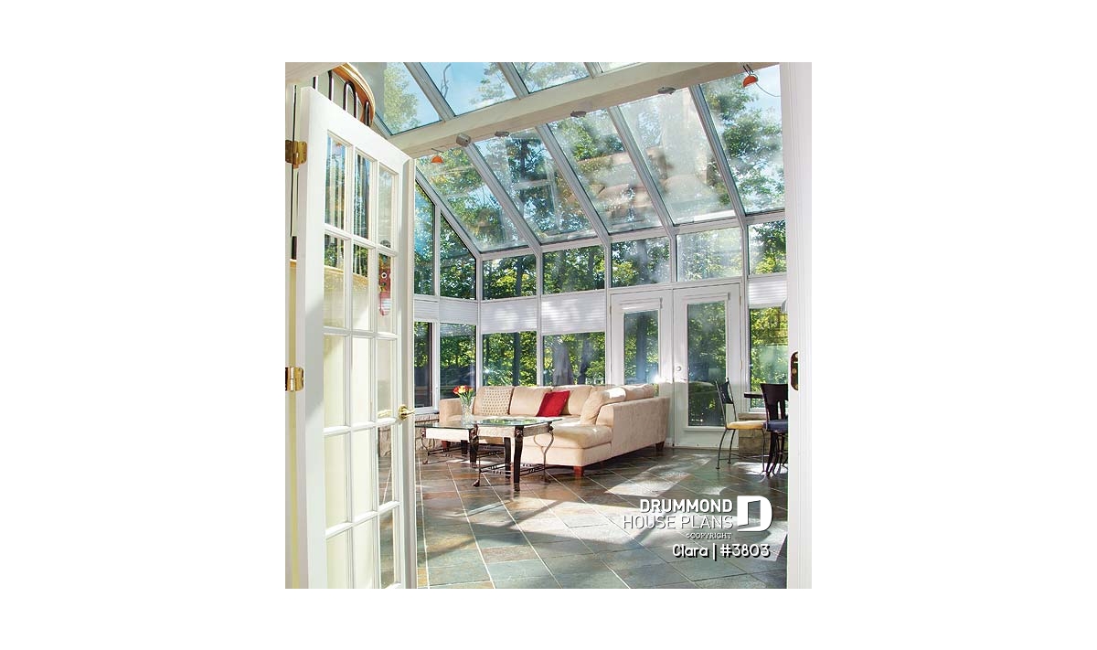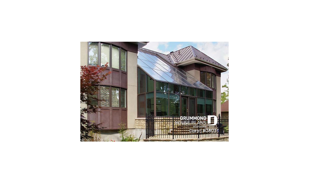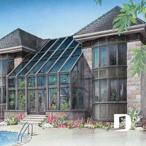 On the main level of the original plan, we find an adequate entrance foyer with very adequate closet, a living room linked to the dining room by a see-thru fireplace, a kitchen with lunch counter reaching into the greenhouse, an interior garden including a spa, a home theatre room, a laundry area independent from a half-bath, and a one-car garage.