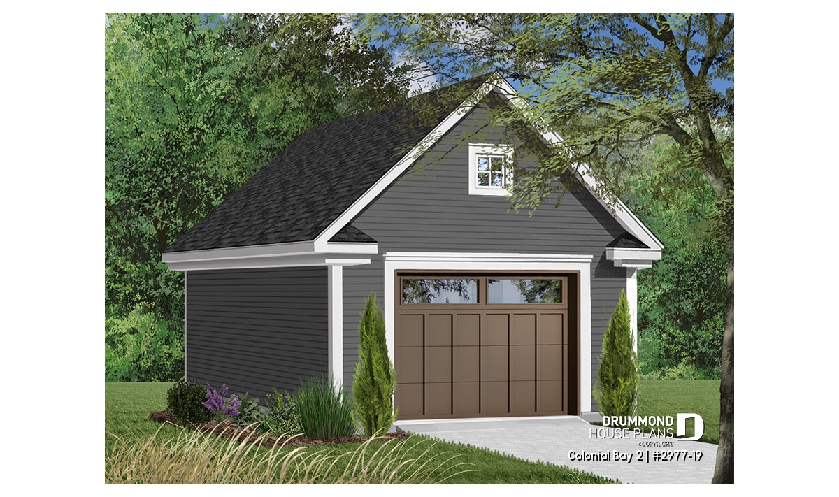 This single car garage is simple, yet functional with the added bonus of storage space above. Decorative moldings add charm and windows on both ends allow daylight into the storage area.