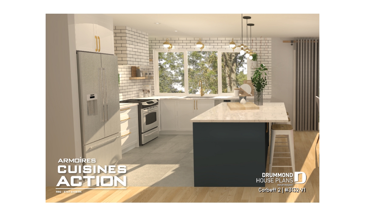 A generous covered porch with a trio of pillar sets welcomes visitors to this open plan bungalow. While open, the activities areas have very distinct spaces thanks to a bumpout for the dining area. An L-shaped kitchen with generous island provides great storage and work areas as well as a social space.
