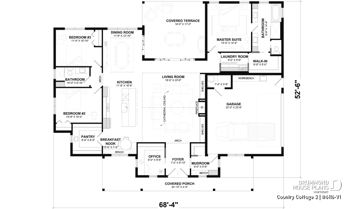 Side entry garage, Side load garage, Split bedrooms, Master suite on main, Warparound, Island, Pantry, Shelves, Bench seat(s), Arch, Cathedral ceiling, Ceiling over 8', Separate bath and shower, Fireplace, Built-ins, Breakfast nook