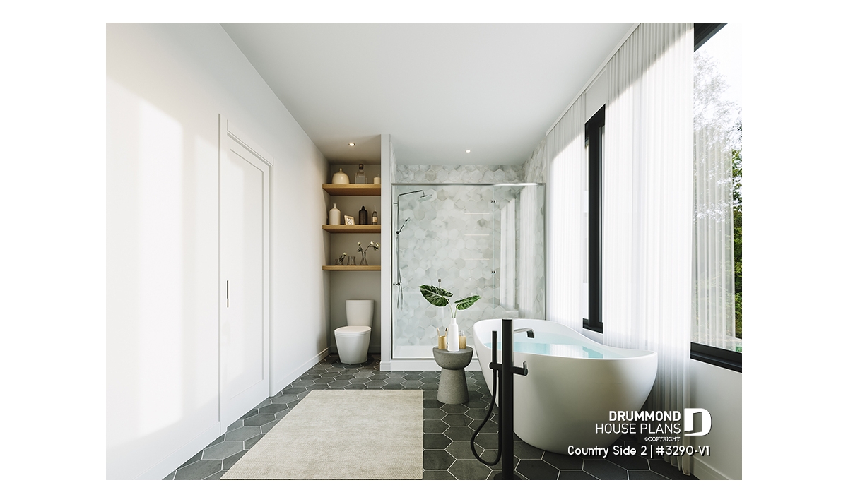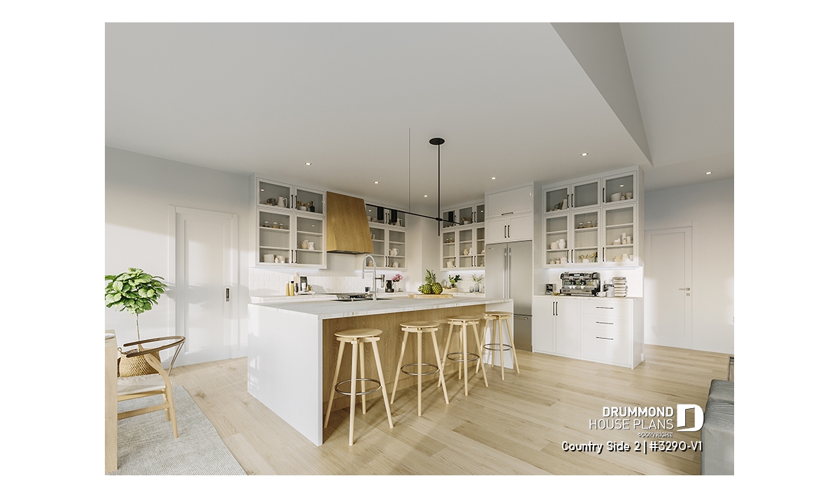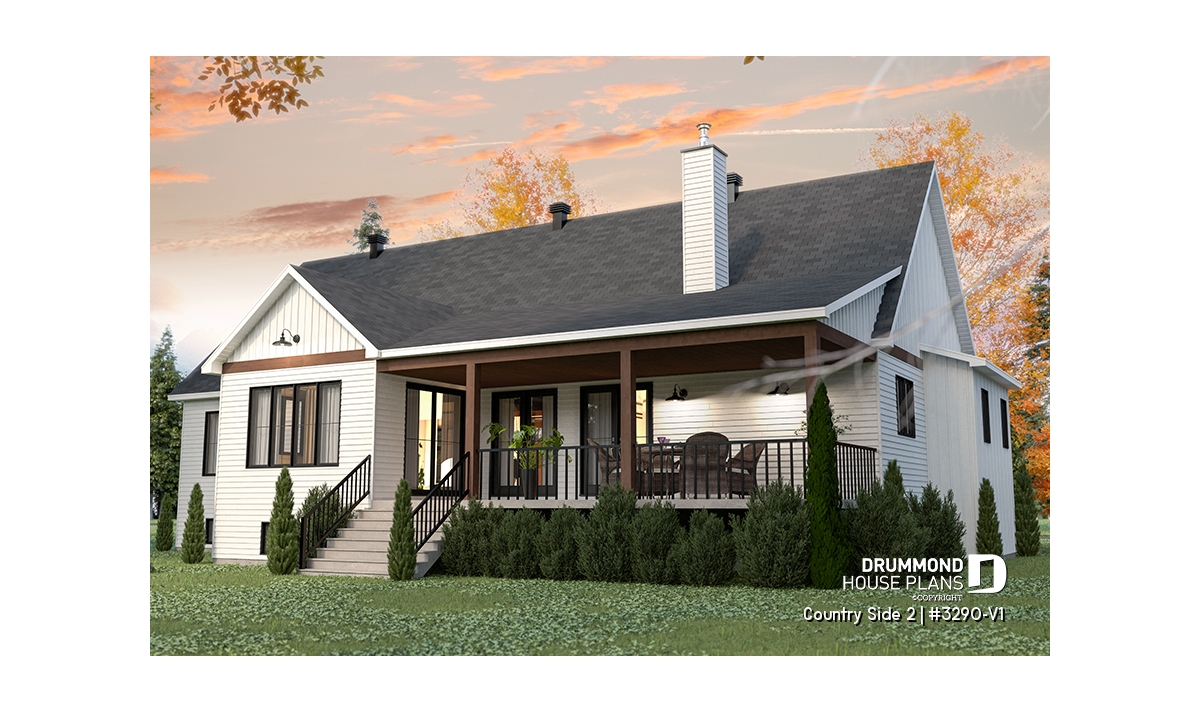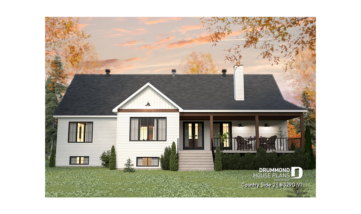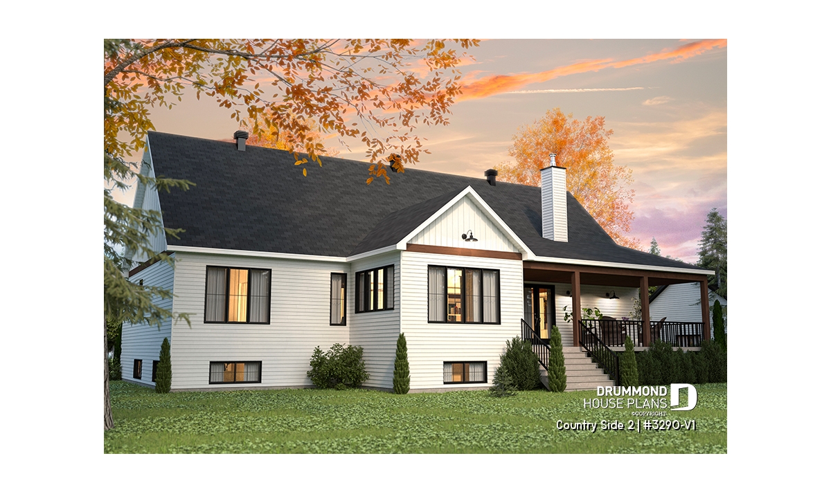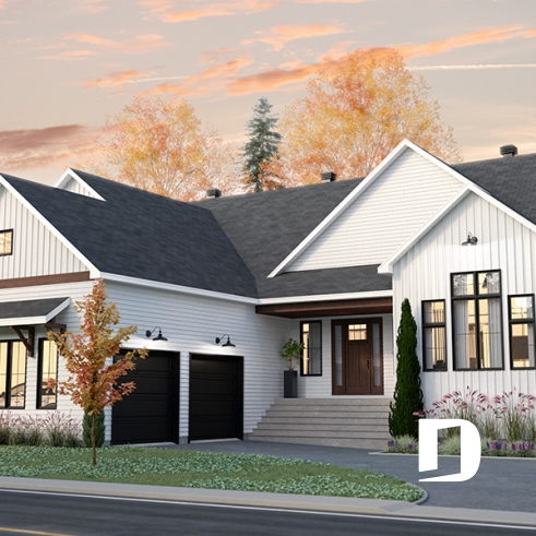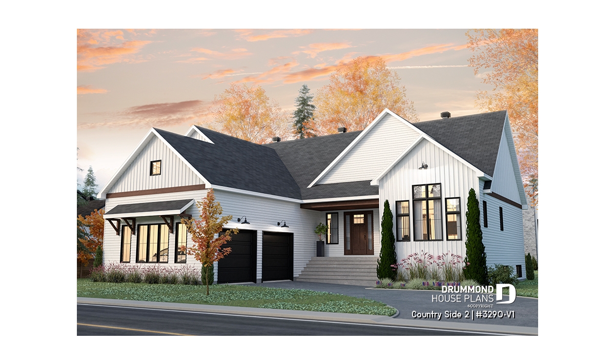 Modern Farmhouse style COUNTRY SIDE 2 (#3290-V1) is an enlarged and modified version of its original plan, Country Side (#3290) . In this new version, the area has been increased by just over 200 sq.ft. on the ground floor, the double garage has been relocated (and now has a side entrance) and the sheltered terrace at the back is a lot more spacious.