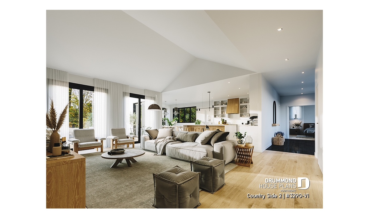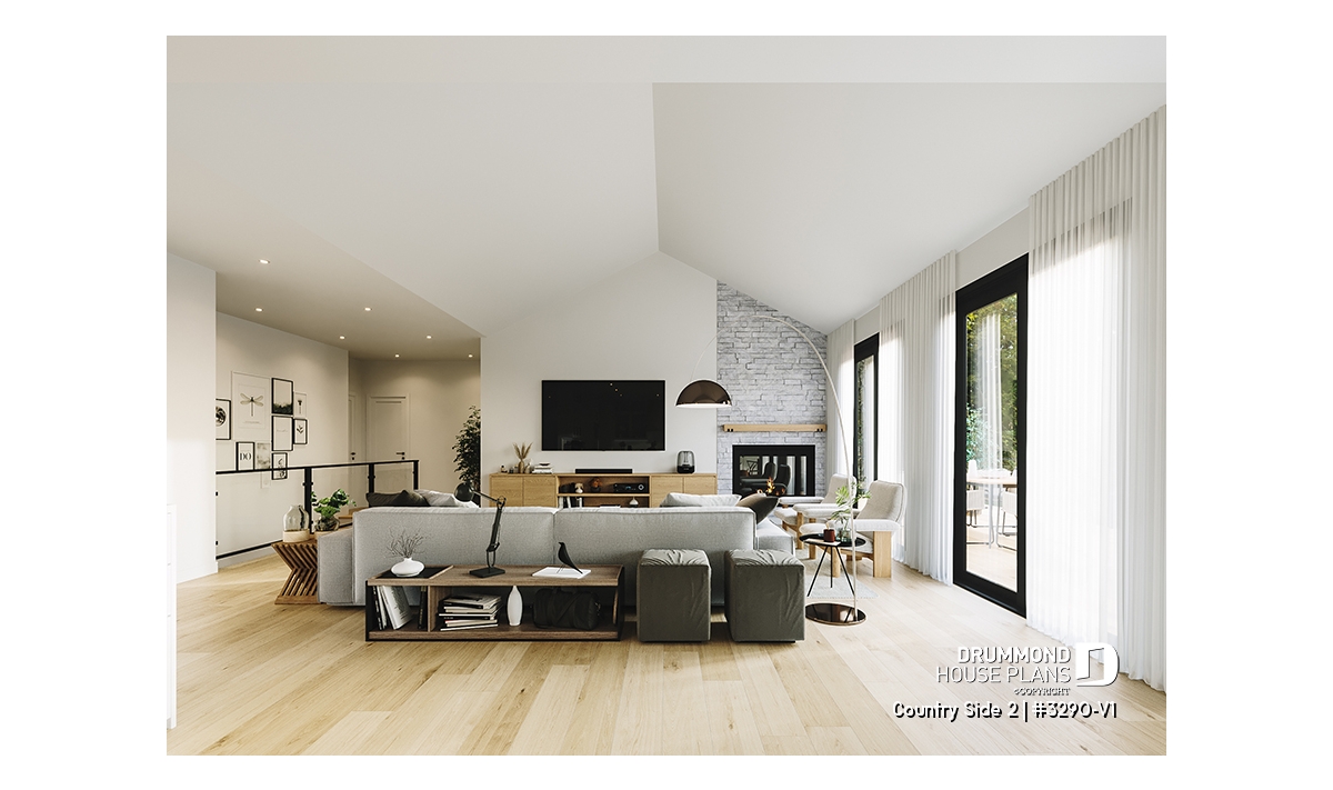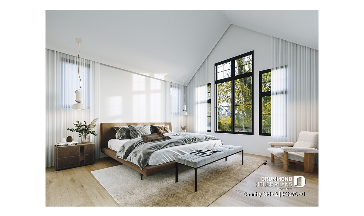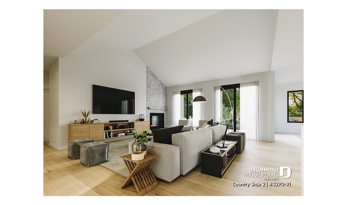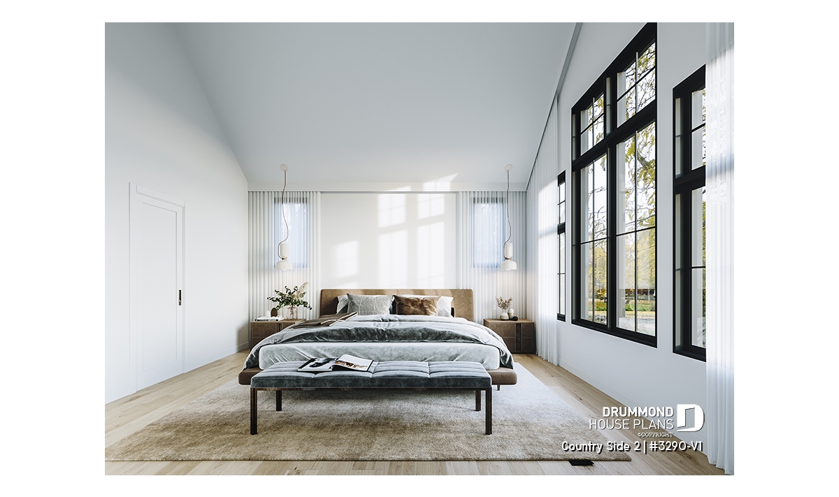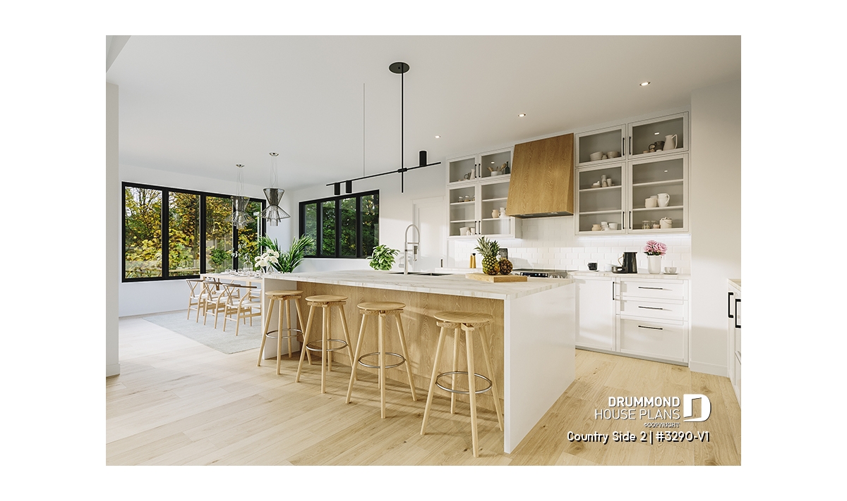 Modern Farmhouse style COUNTRY SIDE 2 (#3290-V1) is an enlarged and modified version of its original plan, Country Side (#3290) . In this new version, the area has been increased by just over 200 sq.ft. on the ground floor, the double garage has been relocated (and now has a side entrance) and the sheltered terrace at the back is a lot more spacious.