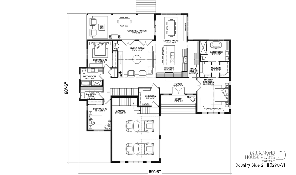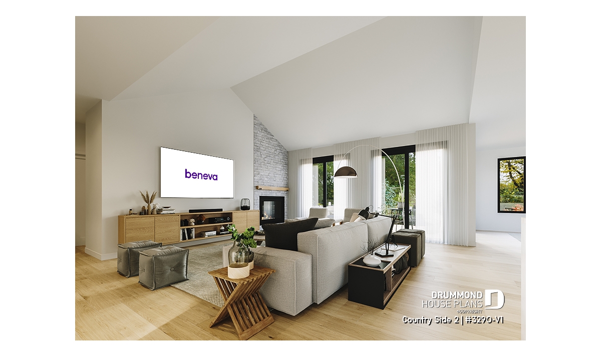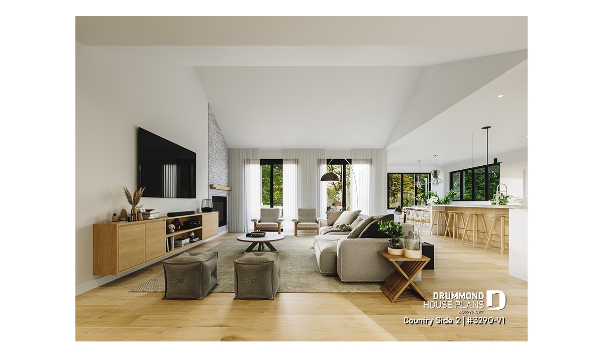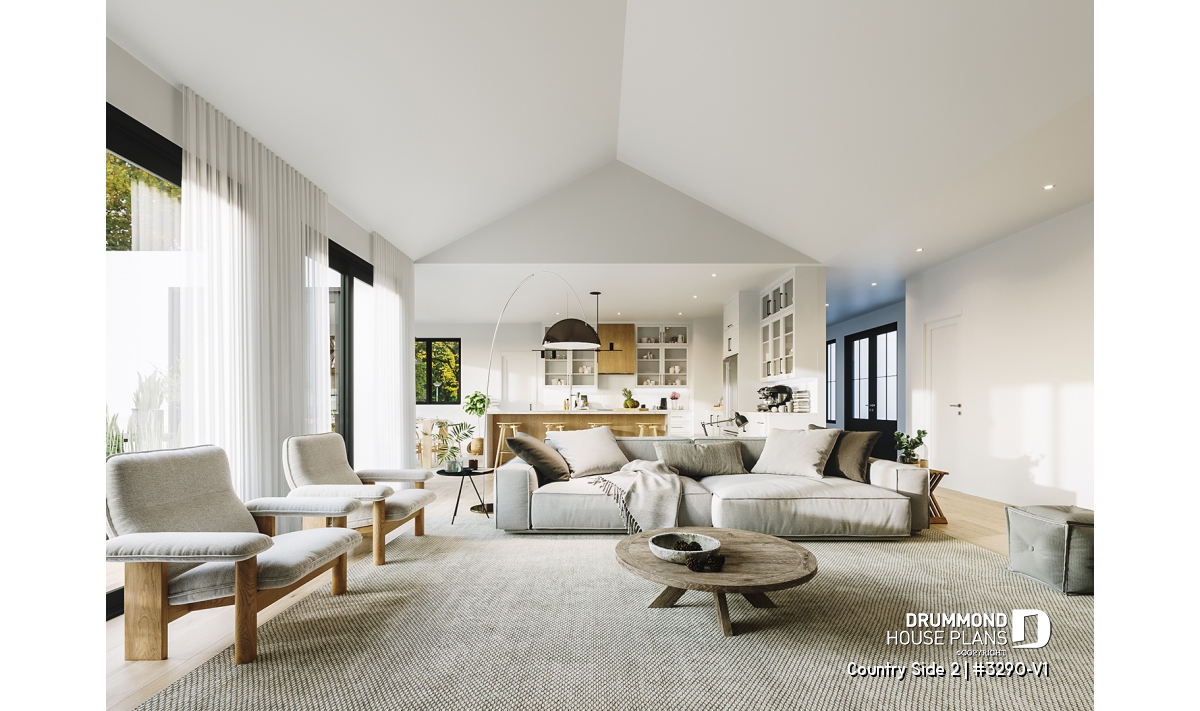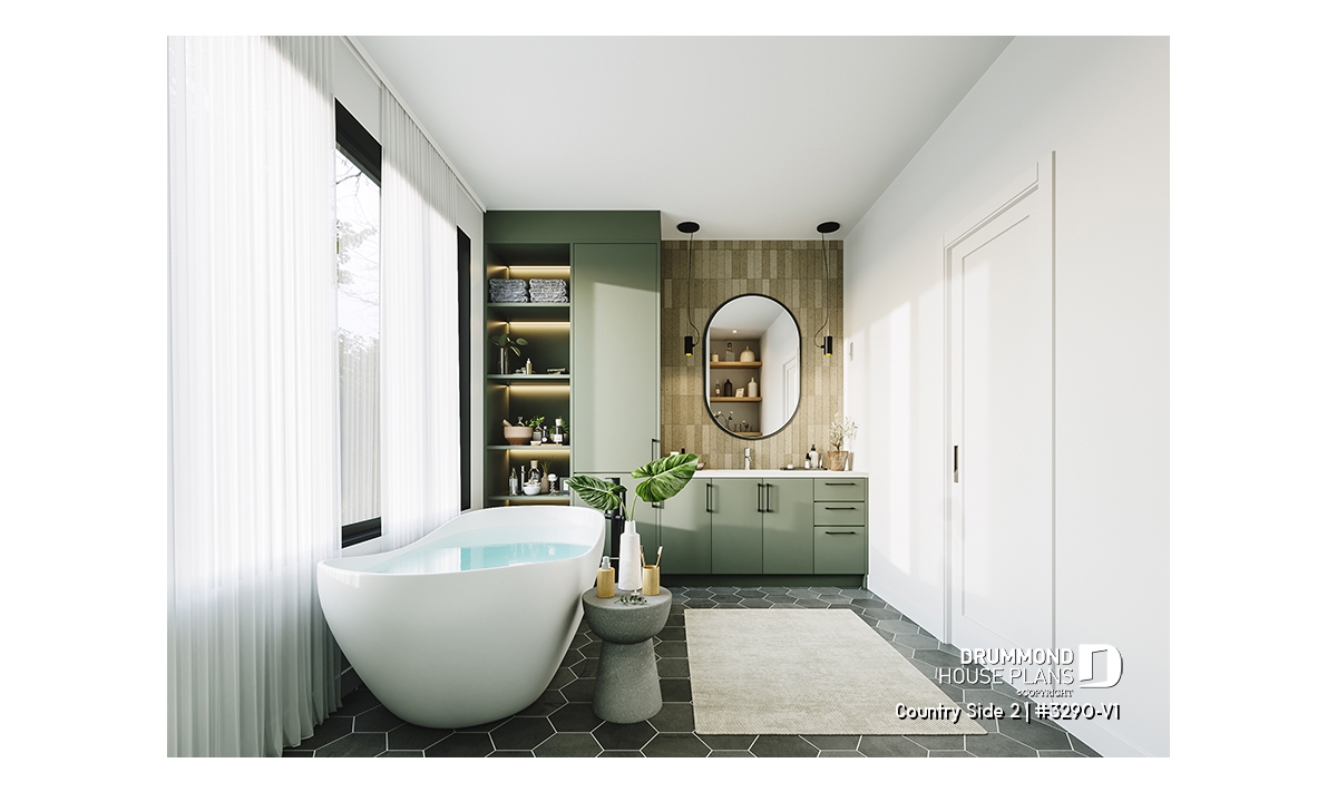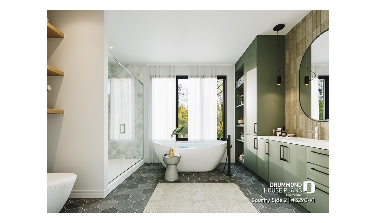 Modern Farmhouse style COUNTRY SIDE 2 (#3290-V1) is an enlarged and modified version of its original plan, Country Side (#3290) . In this new version, the area has been increased by just over 200 sq.ft. on the ground floor, the double garage has been relocated (and now has a side entrance) and the sheltered terrace at the back is a lot more spacious.