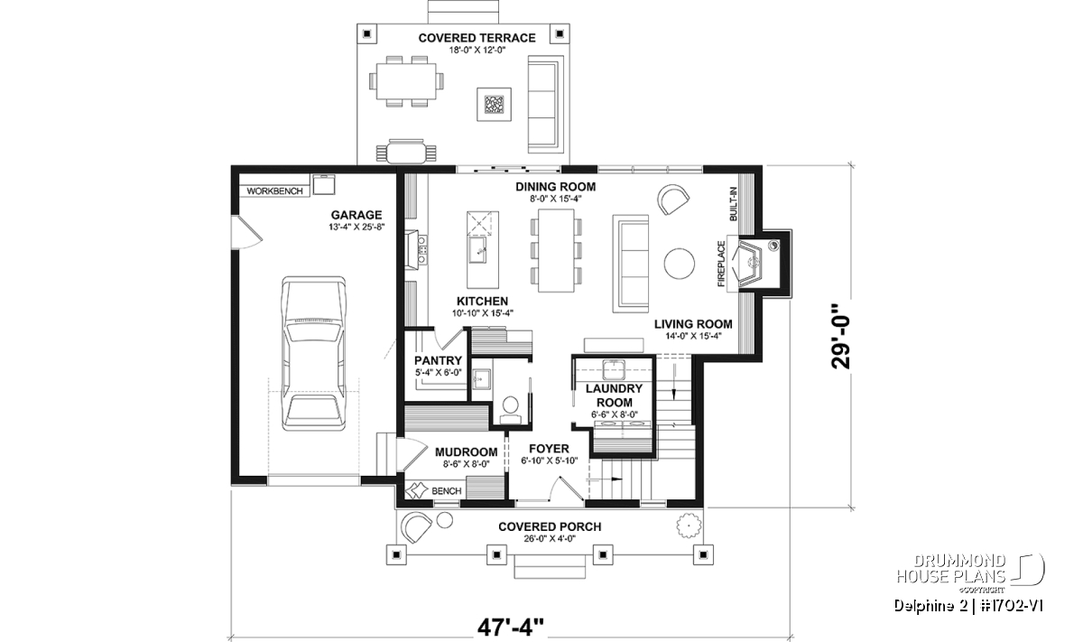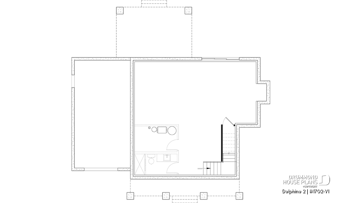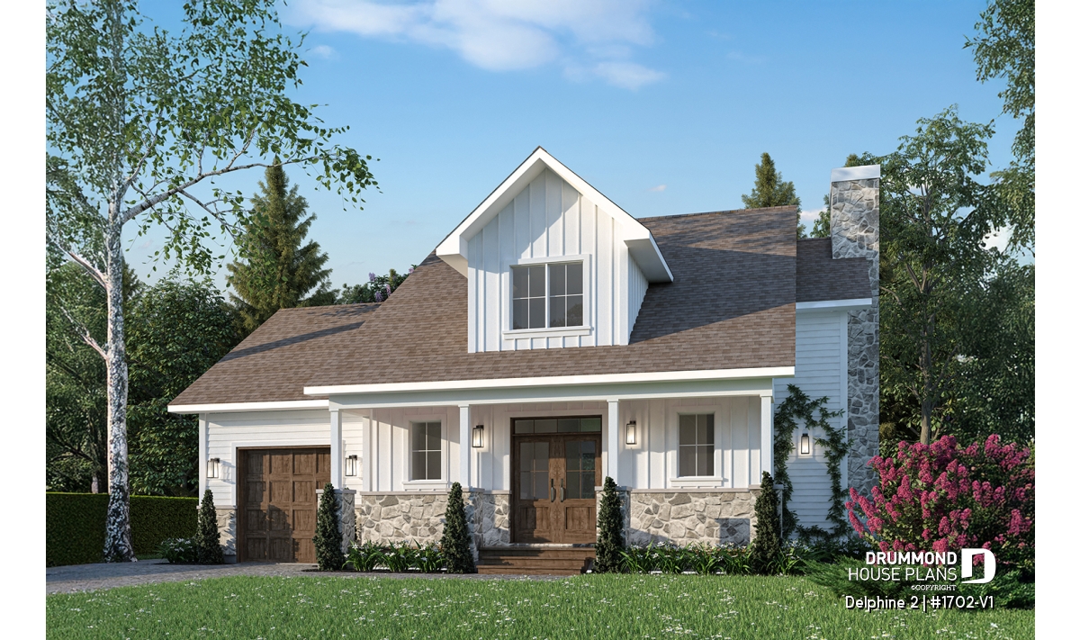 The Delphine 2 house plan (#1702-V1) offers 1622 sq. ft. on two floors. The basic foundation included in the plan is an unfinished basement of 850 sq. ft. Note that several other types of foundations are available ($). In addition, a single garage of 396 sq. ft. is large enough to set up a workbench, which will be perfect for DIY enthusiasts!