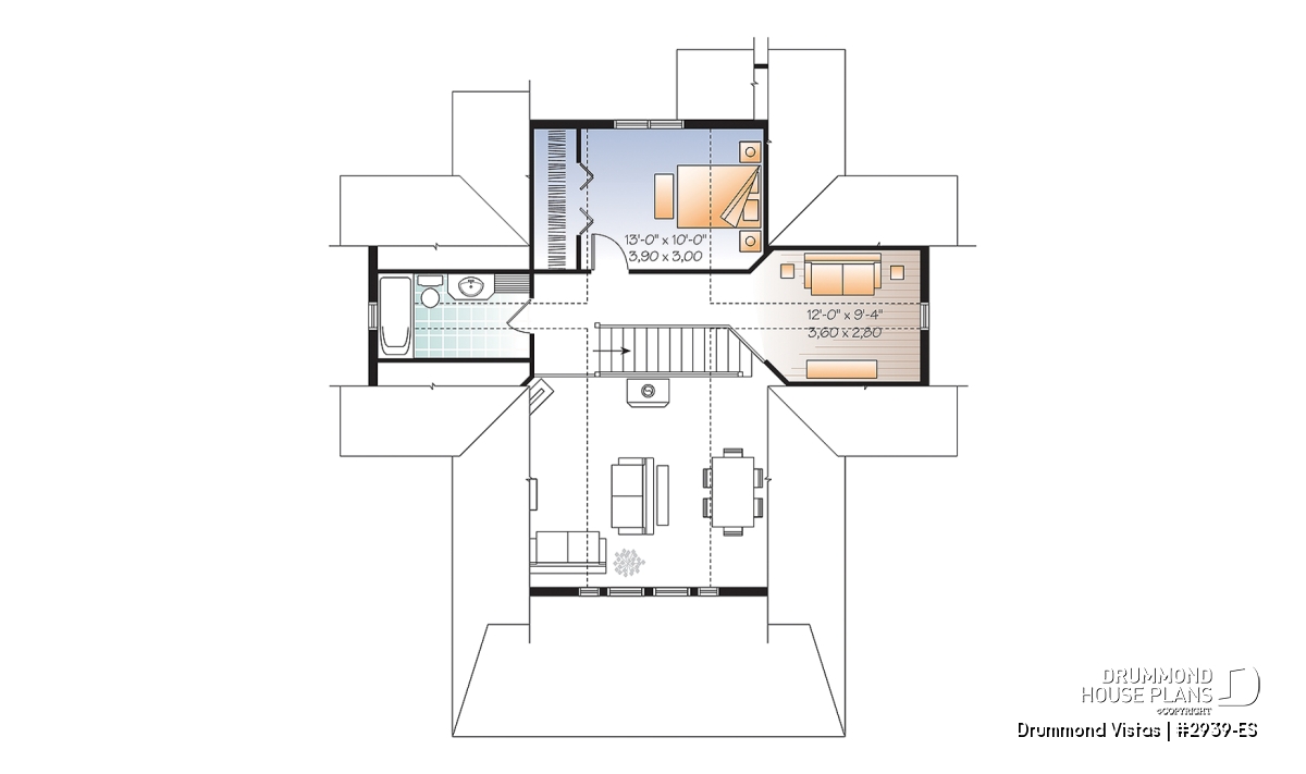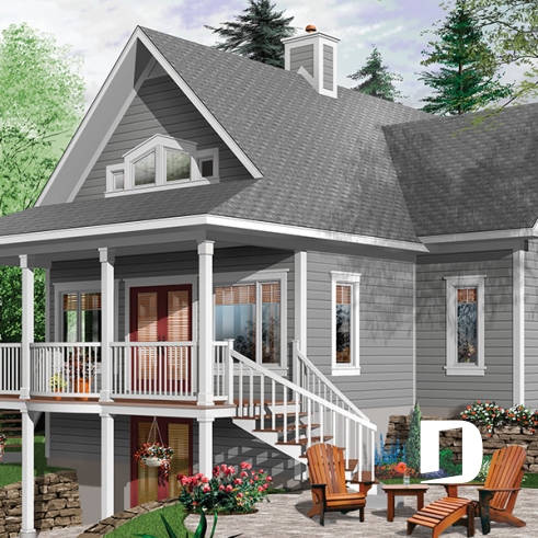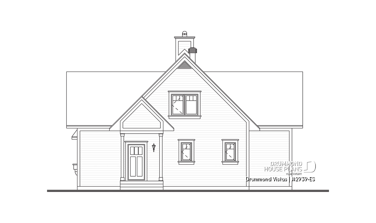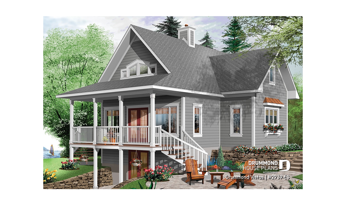 In order to allow you to age well with your cottage, this plan 2939-ES (Drummond Vistas) is designed for daily living on the main level. Thus, you will enjoy a mudroom at the front entrance, a kitchen with island, a dining room paired with a living room with cathedral ceiling and space for a stove or fireplace. Not to mention a master suite with private shower room and a washer-dryer area nearby. A small full powder room, practical for guests, perfectly completes this floor.