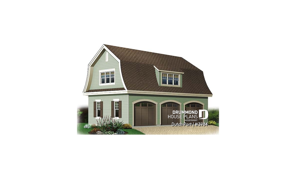 The gambrel roof of this 3-bay garage make it a popular model when a country feeling is being sought. Three bays with graceful arched doors are balanced by a shed dormer. 804 sq ft of garage and 594 sq. ft. of bonus space can be developed as desired.