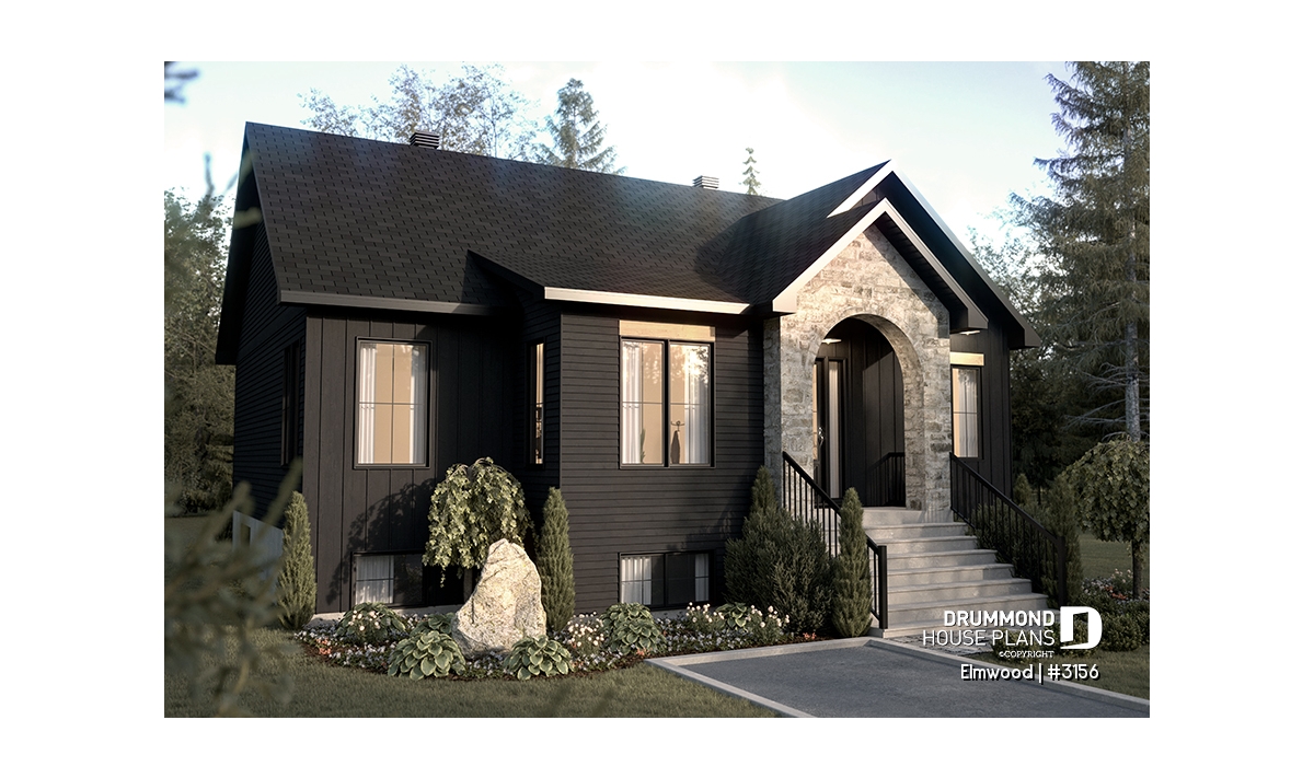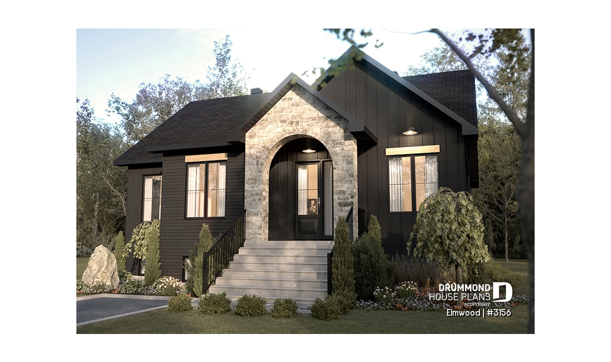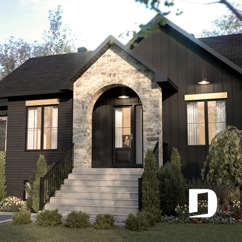 A charming house with a modern design and arched shaped stone facade.