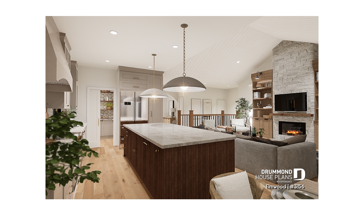 The kitchen is equipped with a pantry, an island, and opens onto both the dining room and the living room.