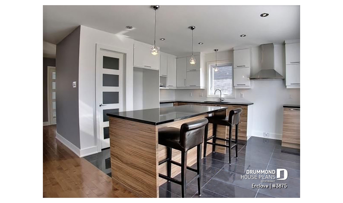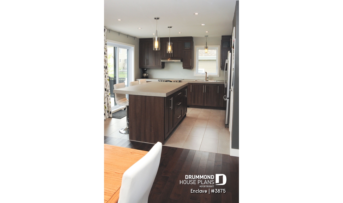The large vestibule has ample storage with nearly 8 ft of closet space. The living room is oriented forward and the back of the house is commanded by a generous open kitchen with walk-in pantry and dining area. The kitchen is normally the heart of the home, so we’ve positioned the hearth there as well. The island seats are sure to be the most coveted in the house.