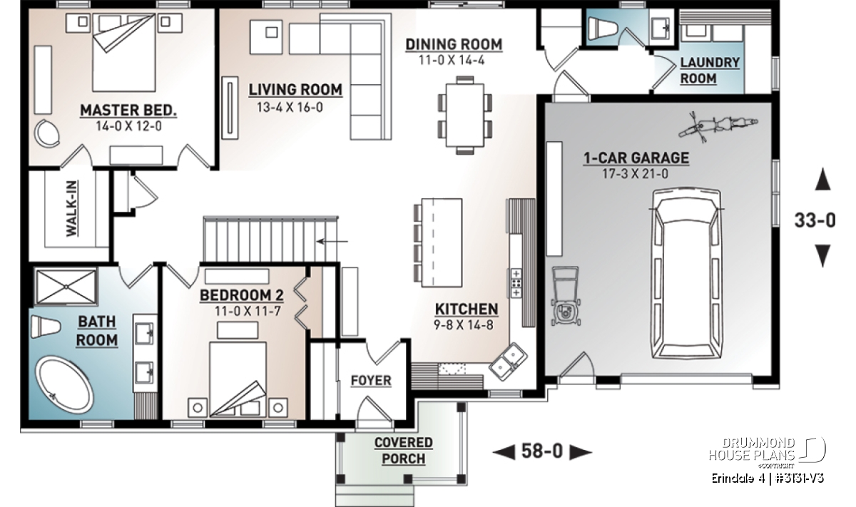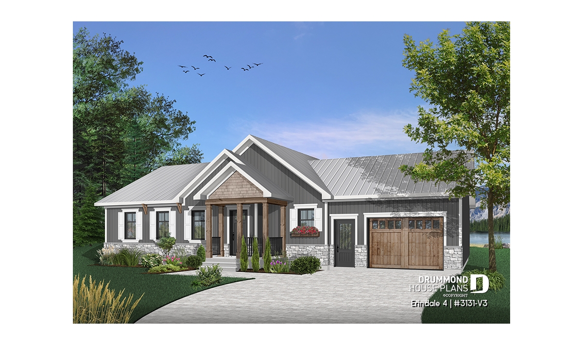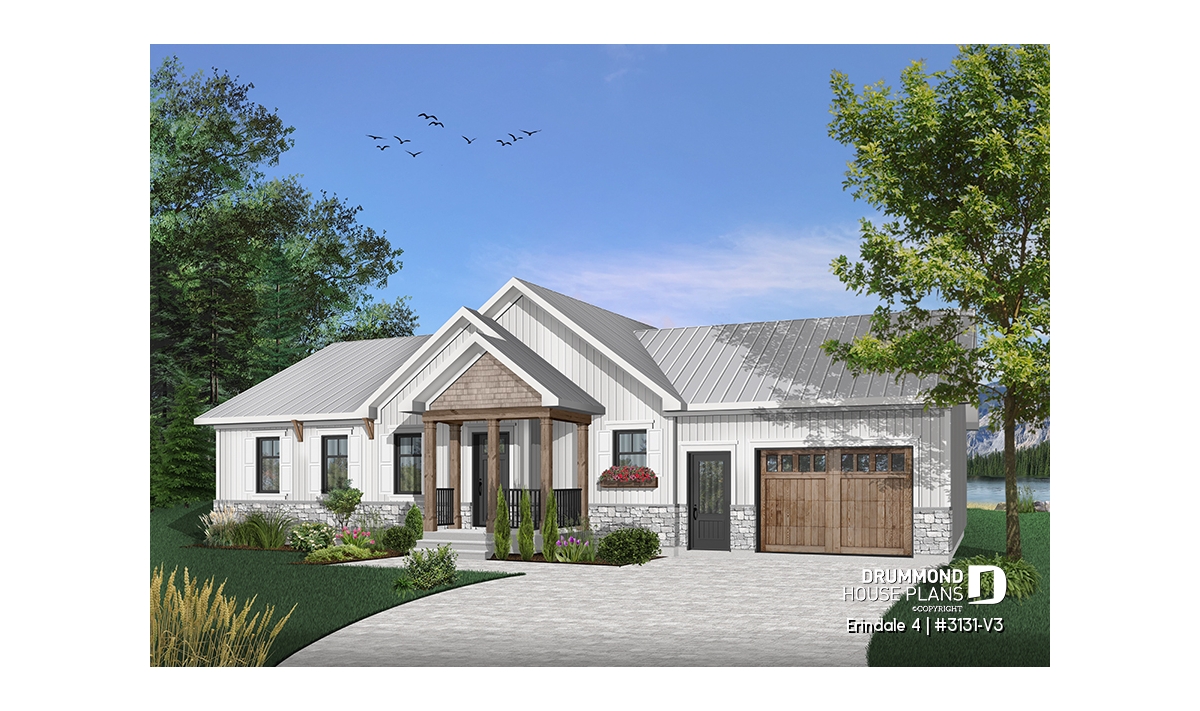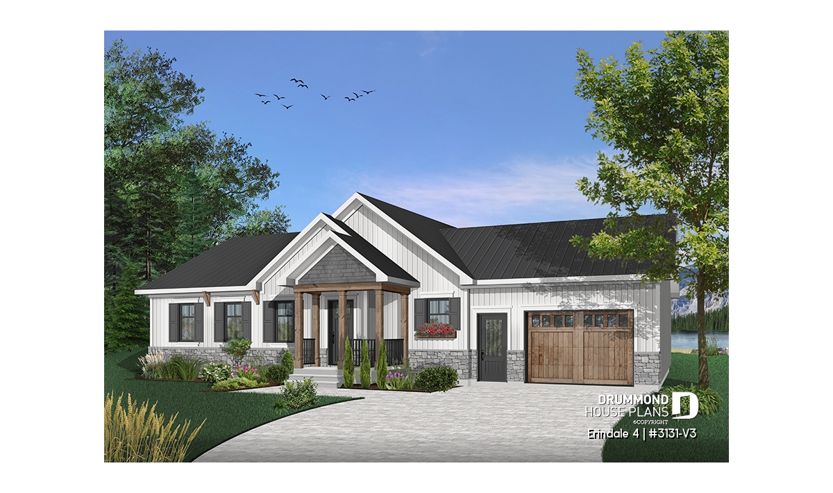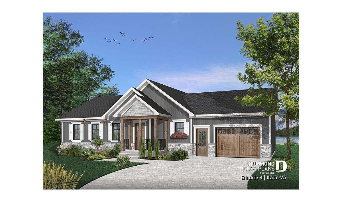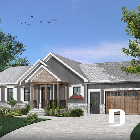 Affordable Ranch Bungalow house plan with an open floor plans and a one-car garage.