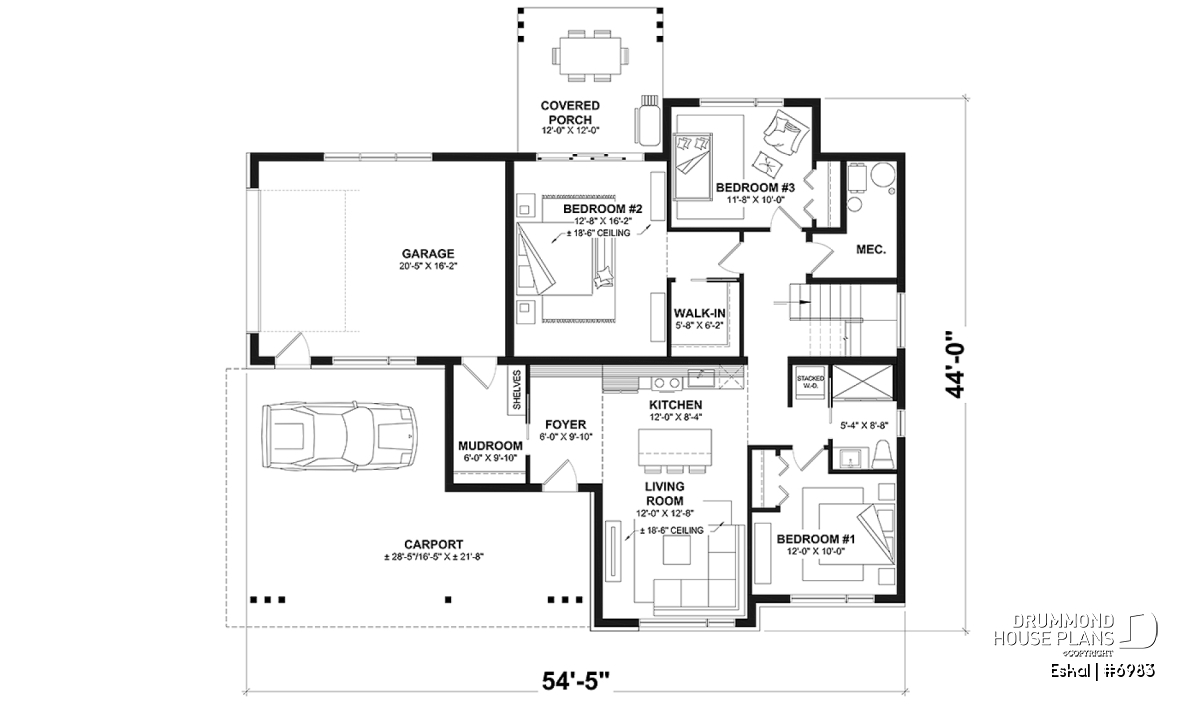 A carport that can accommodate 2+ cars is present in all options.