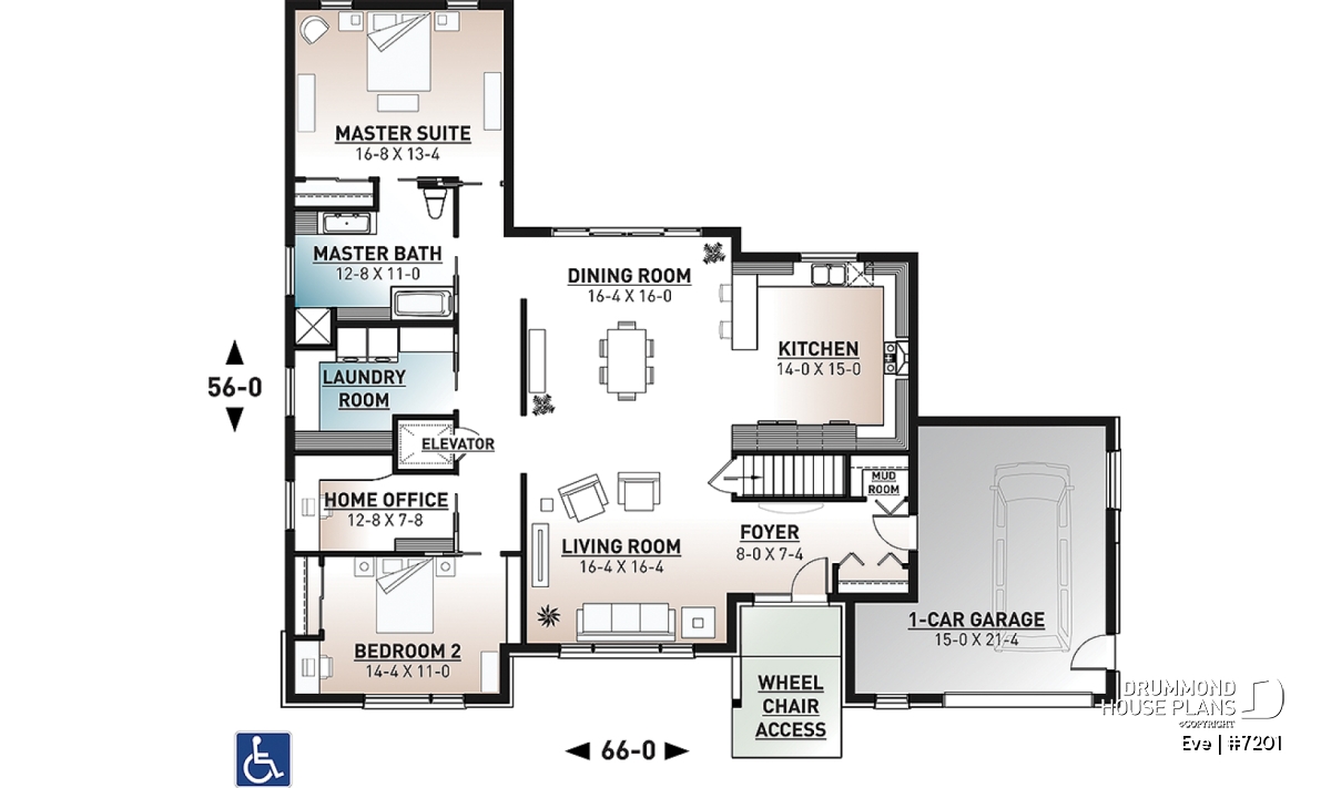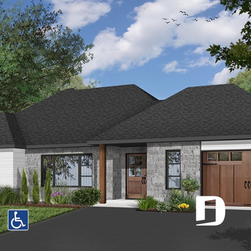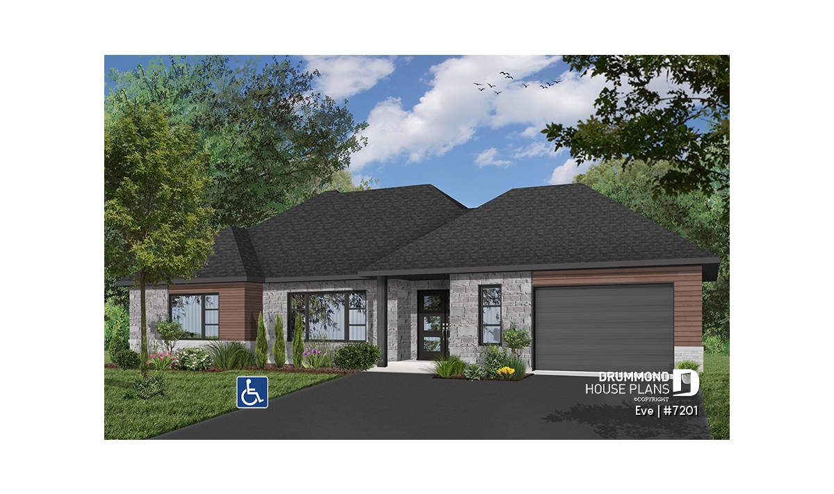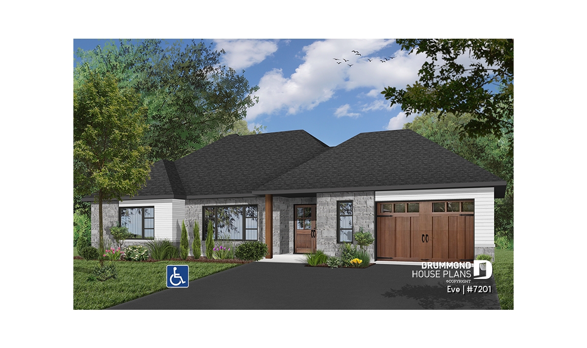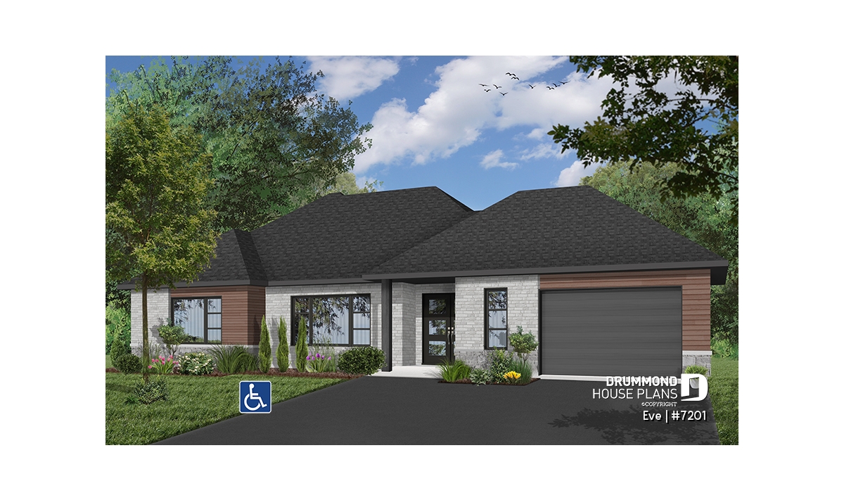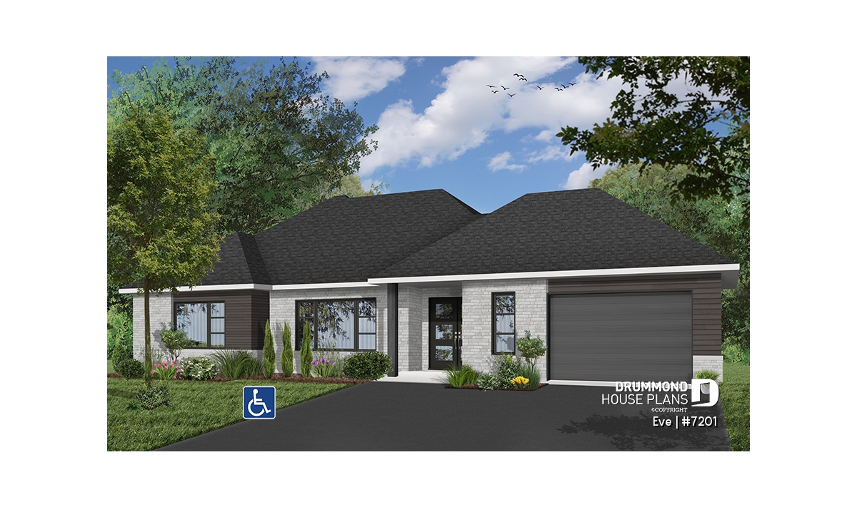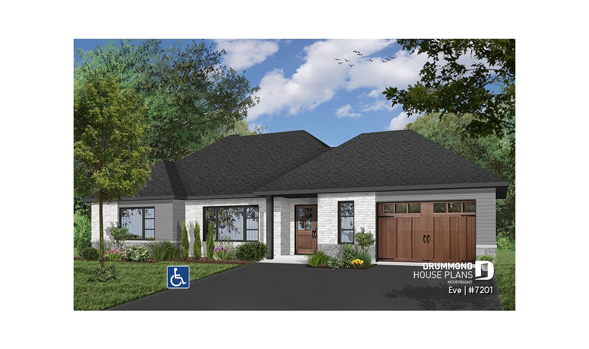 The Eve (#7201) house plan is a contemporary single-story ranch home carefully designed to provide full wheelchair accessibility without sacrificing comfort, style or functionality. This modern bungalow with an integrated garage features a completely barrier-free main floor, allowing smooth and safe circulation throughout the living spaces.