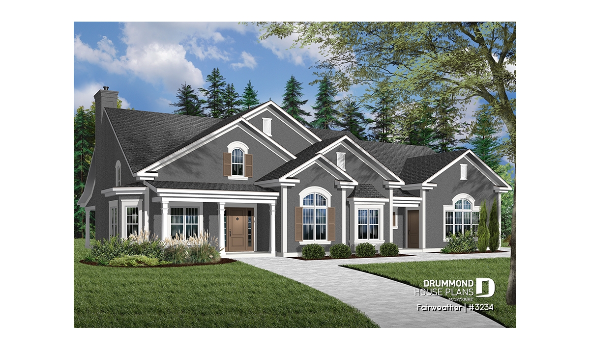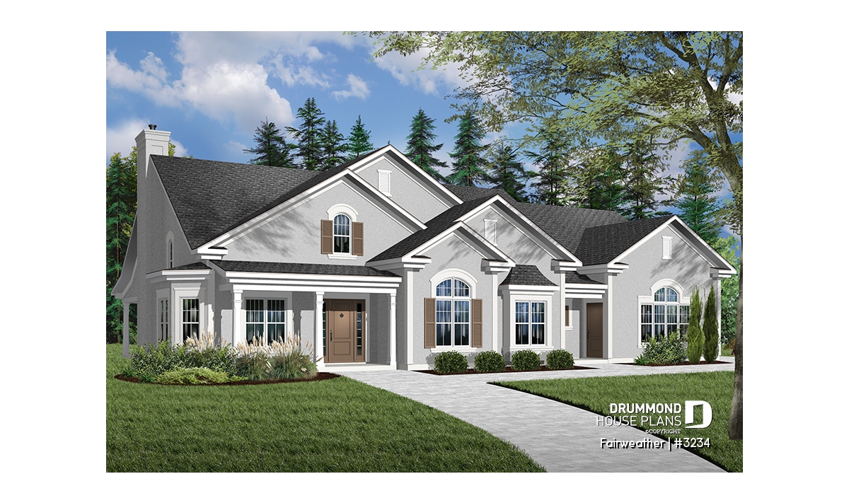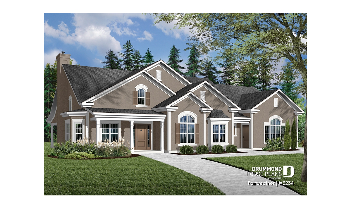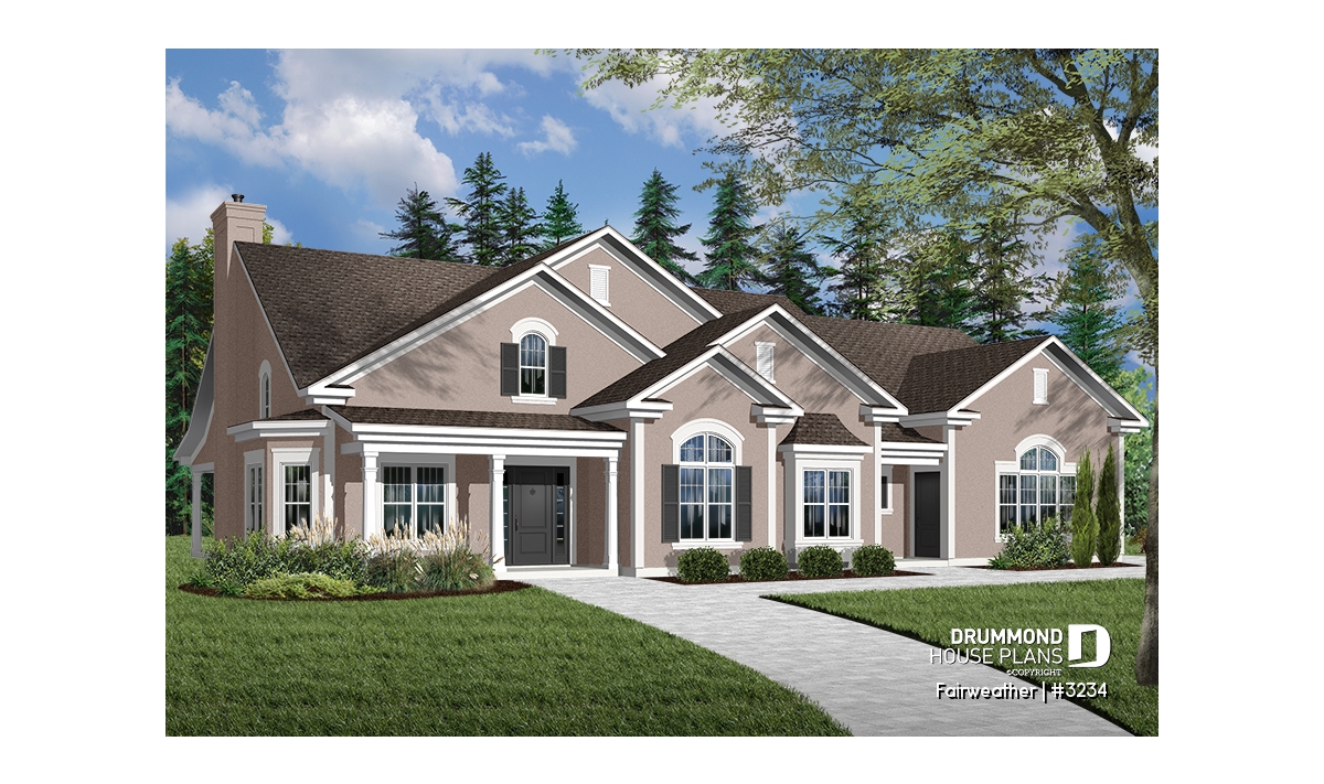 A roomy 2-car garage includes golf cart bay or a great work/storage area. While designed as a warm-climate house plan, this model has proved popular right across the country.