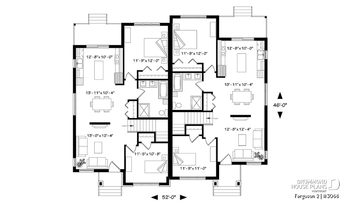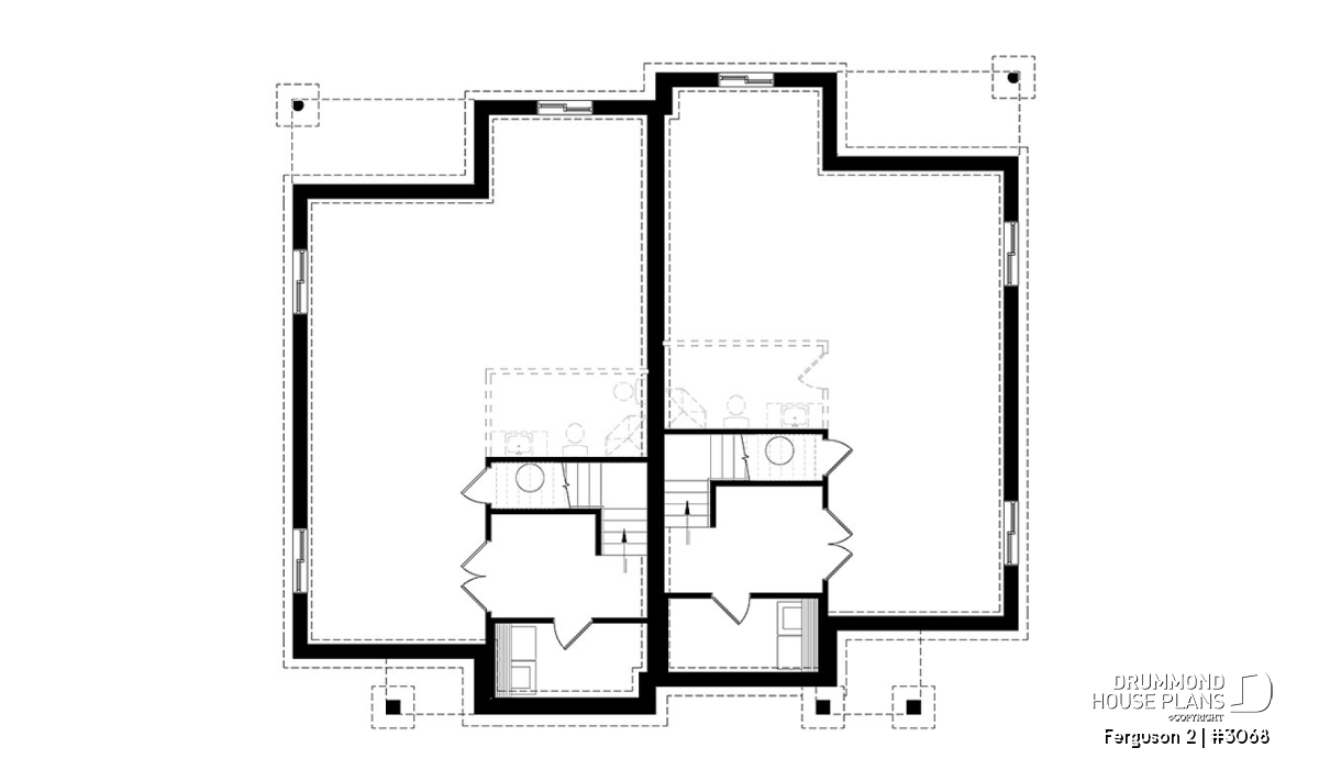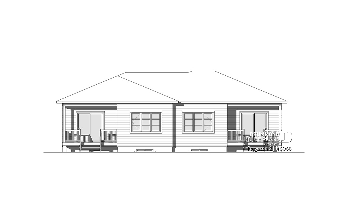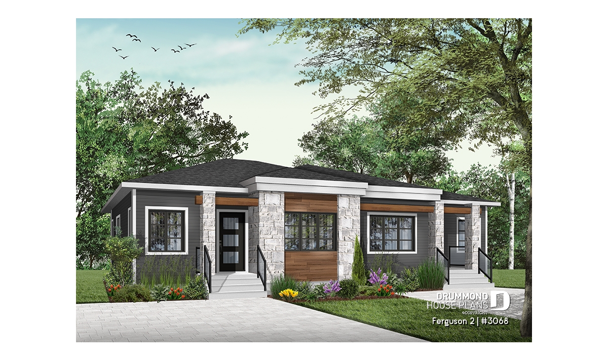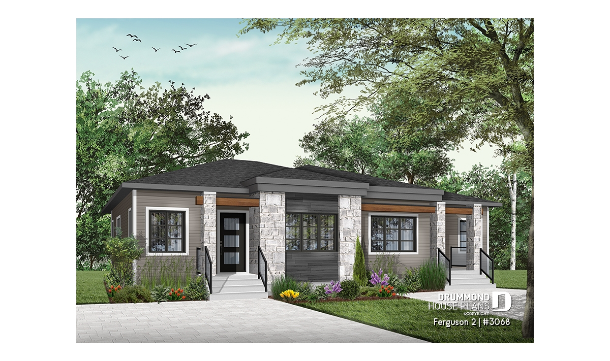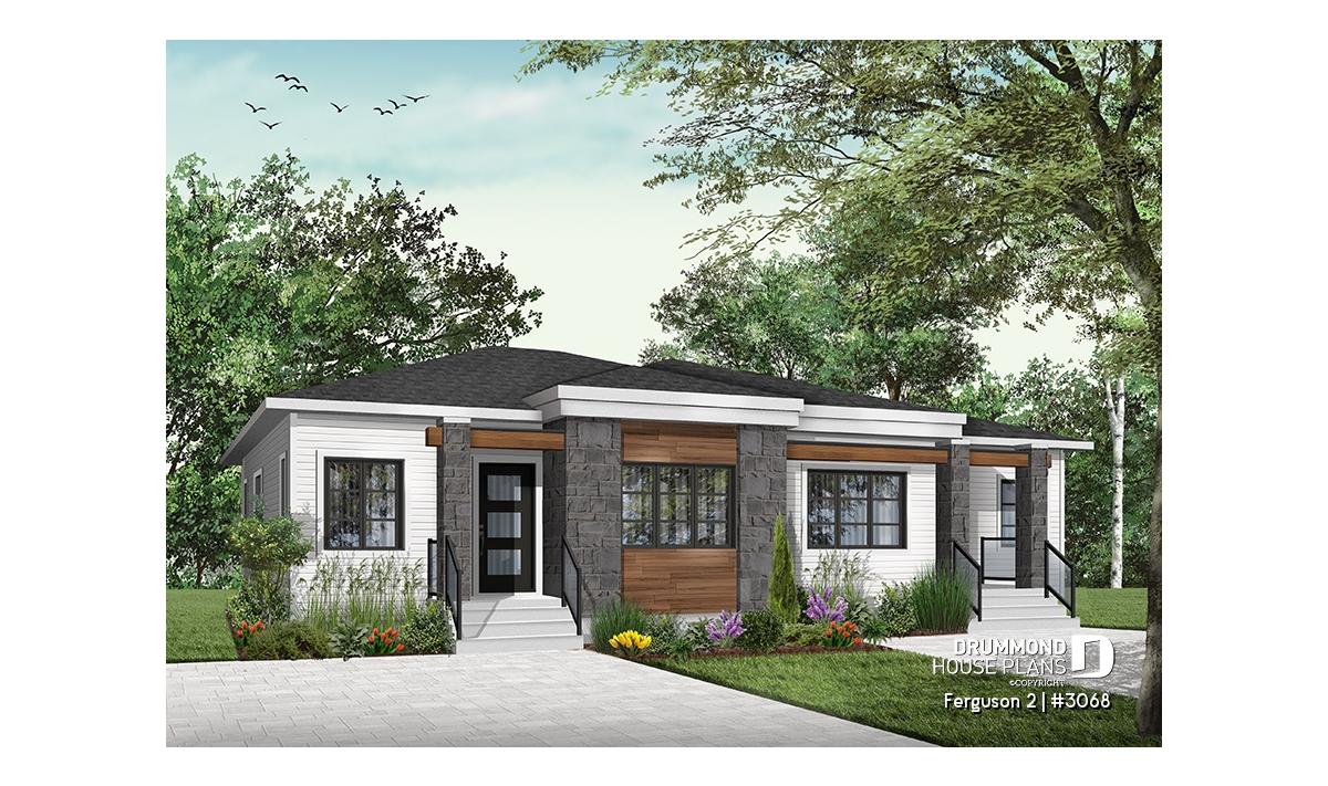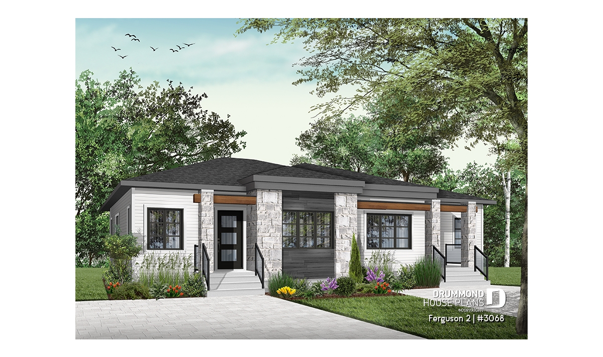 Here is our new contemporary style duplex house plan, the new Plan # 3068 from Drummond House Plans, offering you beautiful spaces and potential in the basement for the future! The Ferguson 2 duplex model, which is a derivative of plan # 3067, offers an unfinished daylight basement to finished as you desire, and a single large family bathroom on the ground floor instead of two as its basic model. This version # 3068 of the basic model was designed for couples or families wishing to use the basement space to add bedrooms or a family room, a low costs. It should be noted that the ceiling of the ground floor is 9 feet everywhere, which gives significant amplitude to the rooms.