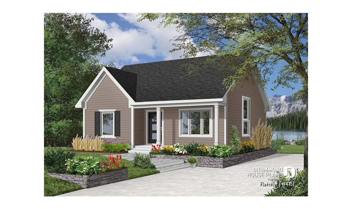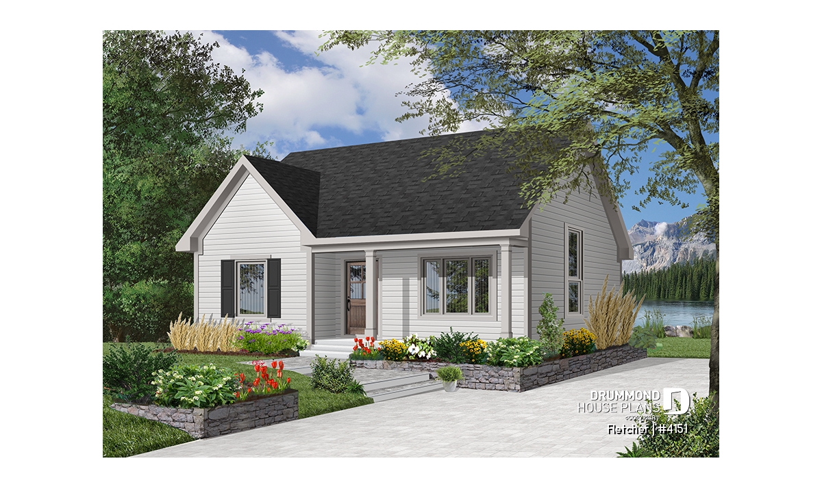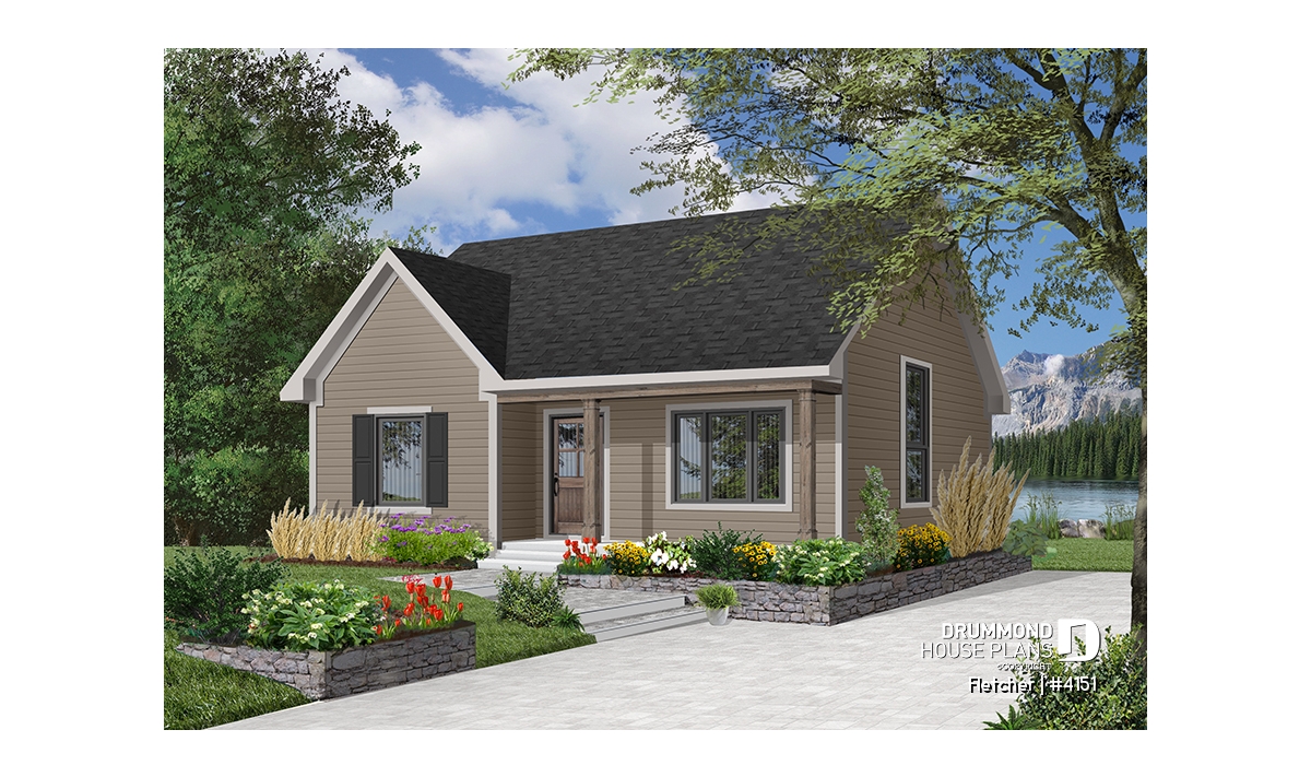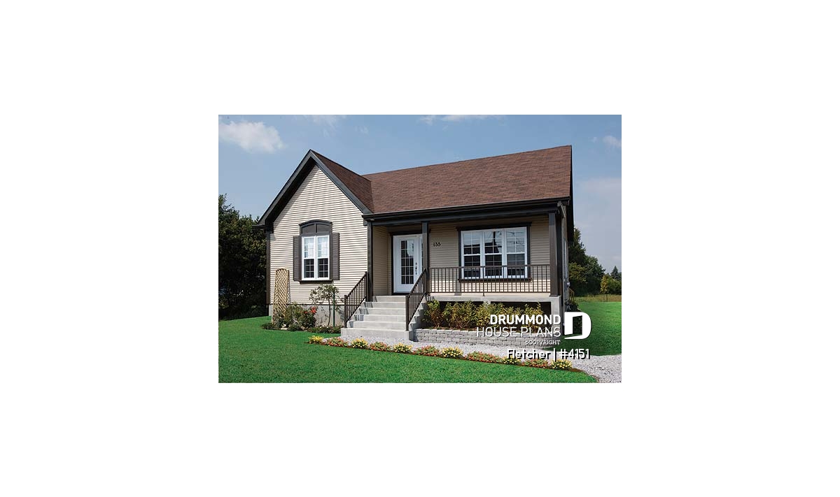 Small and affordable bungalow house plan, 2 bedrooms, cathedral ceiling, closed foyer