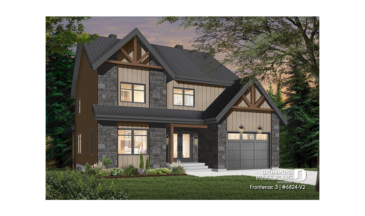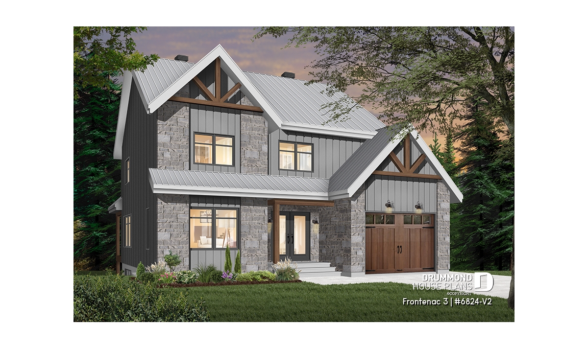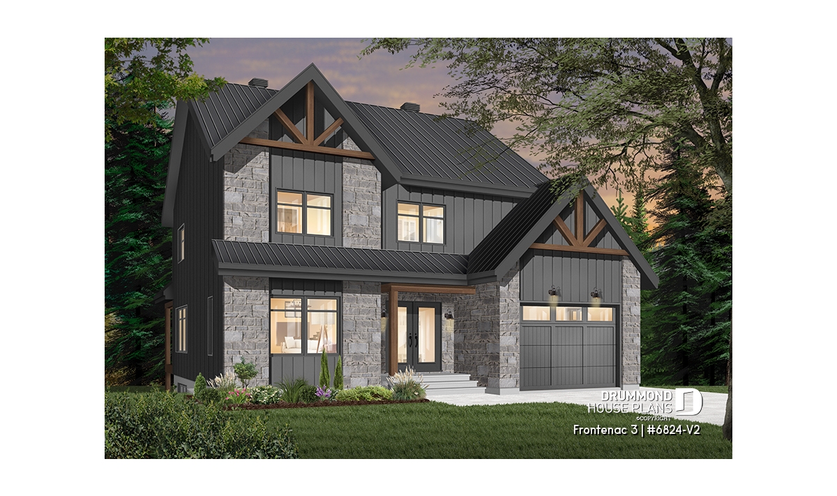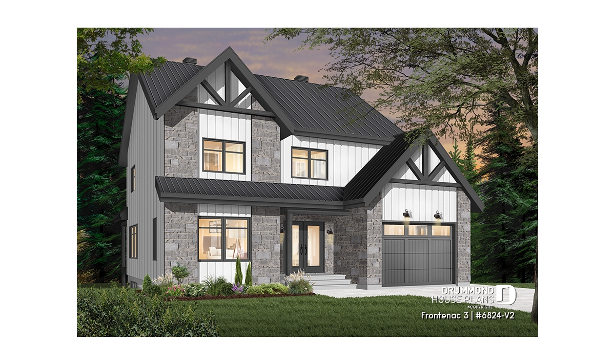 With its simple and rustic lines, its garage, its main elevation, an excellent layout of the gables, and well mixed colors, this house is a real family classic. Let's discover its very interesting interior. In main entrance, there is a large coat closet in the foyer, and once passed that, we notice a confortable living room with abundant lighting and sharing a fireplace with the kitchen-dining room area. In that area, we again notice the natural lighting as well as a large kitchen island in the kitchen and a genuine walk-in pantry. Also, a half-bath on main floor.