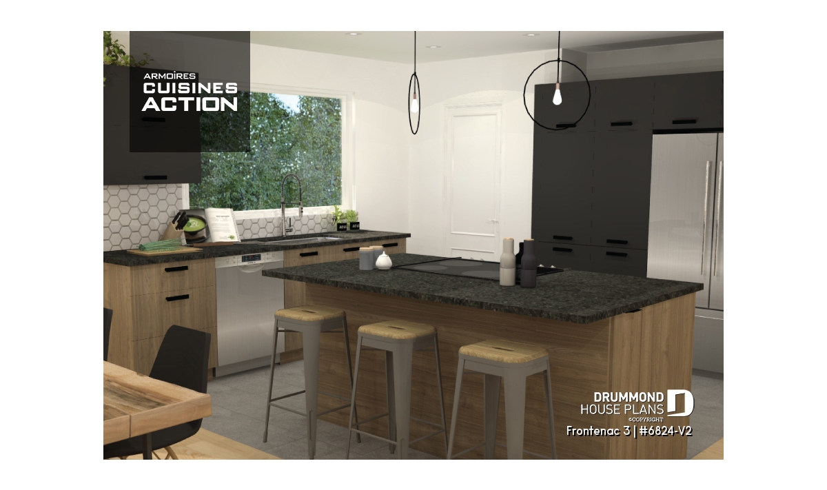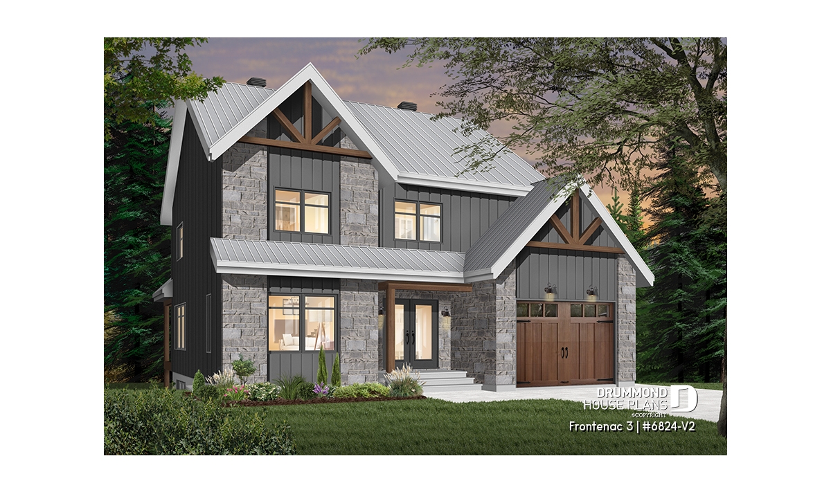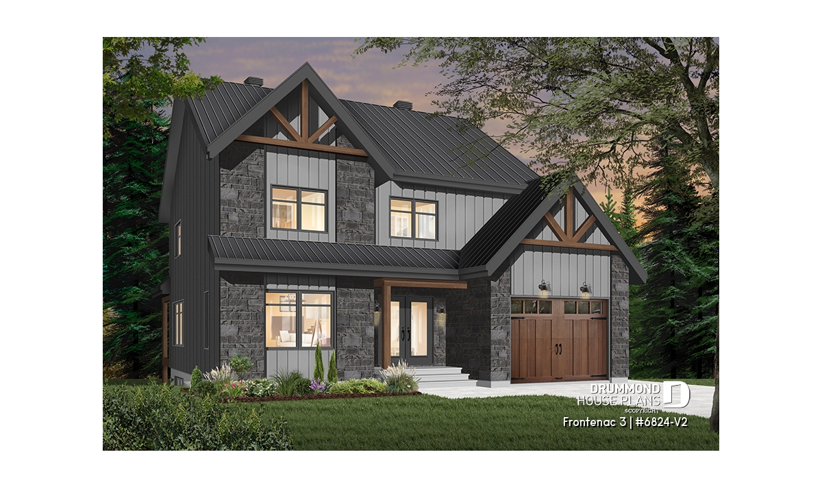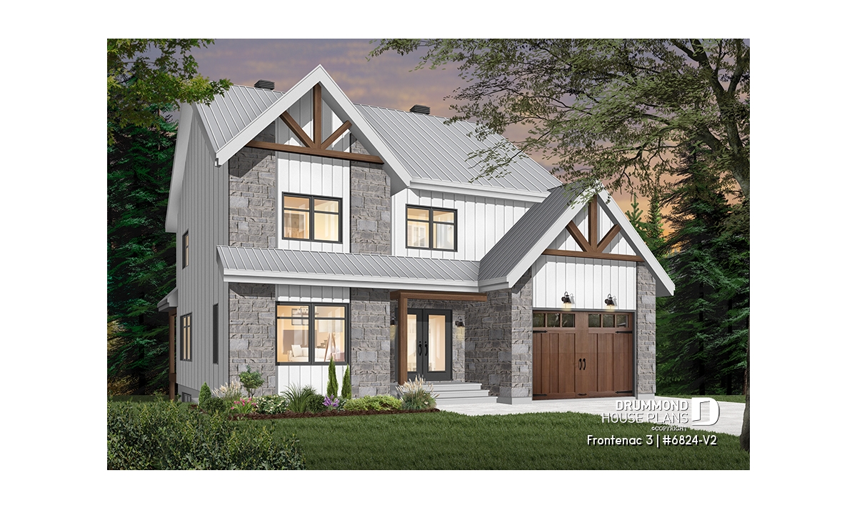 With its simple and rustic lines, its garage, its main elevation, an excellent layout of the gables, and well mixed colors, this house is a real family classic. Let's discover its very interesting interior. In main entrance, there is a large coat closet in the foyer, and once passed that, we notice a confortable living room with abundant lighting and sharing a fireplace with the kitchen-dining room area. In that area, we again notice the natural lighting as well as a large kitchen island in the kitchen and a genuine walk-in pantry. Also, a half-bath on main floor.