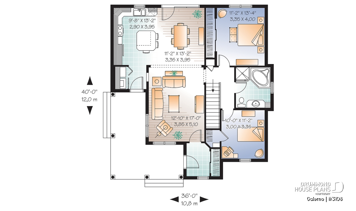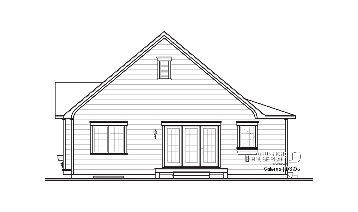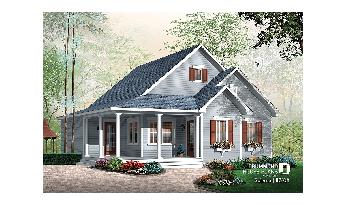With its sloping roof, shuttered windows and covered porch along two sides, this plan can easily be defined as “country”.
