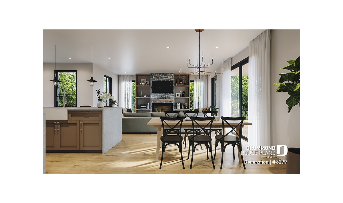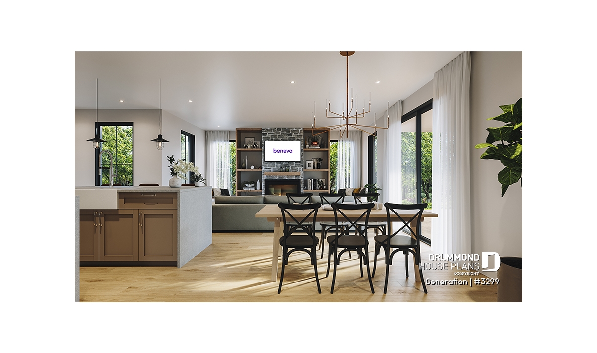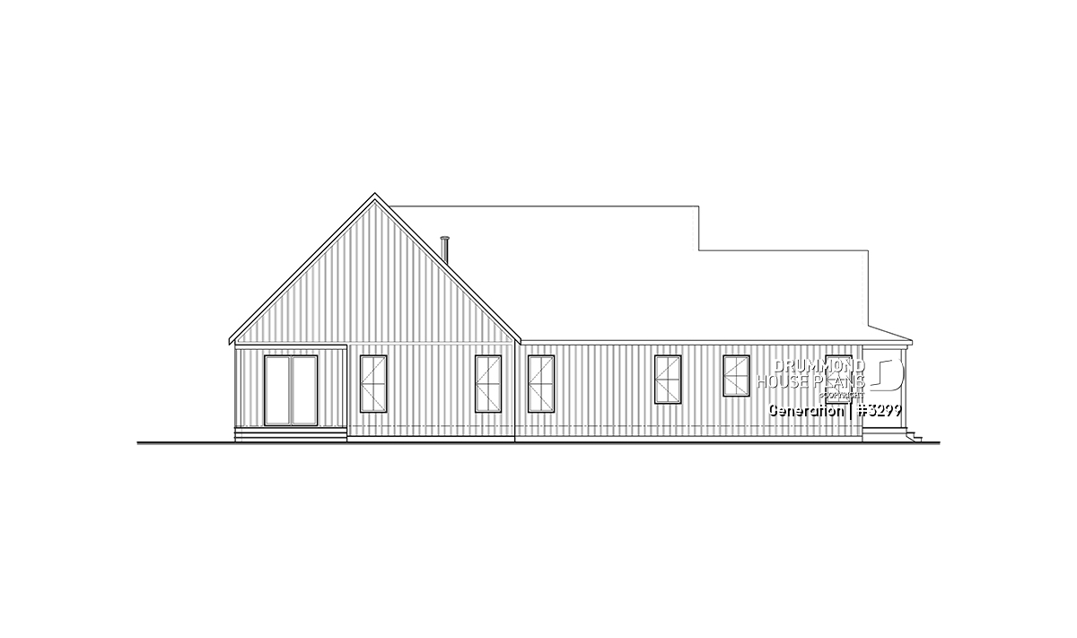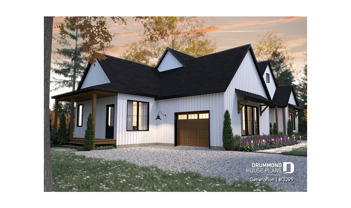 The intergenerational house plan GENERATION (# 3299) features 1306 sq.ft. in the main unit (on the right) and 680 sq.ft. on unit #2 (left). The exterior spaces of the two dwellings are opposite one another, thus allowing the occupants to experience daily privacy.