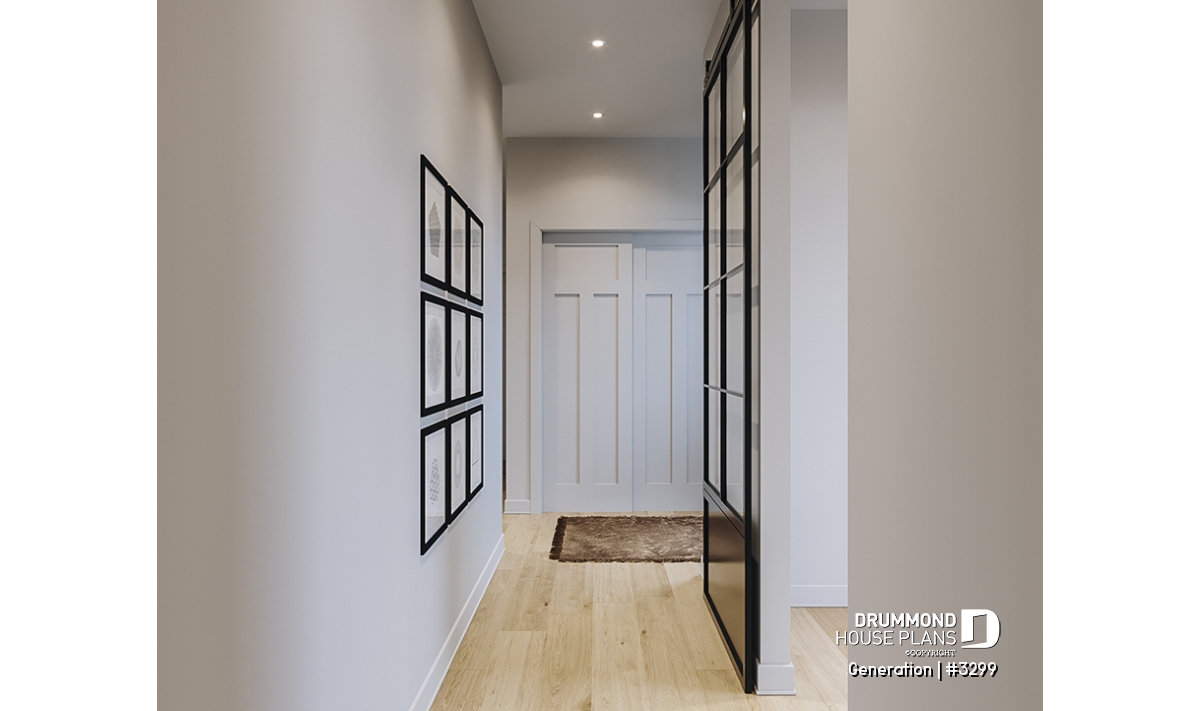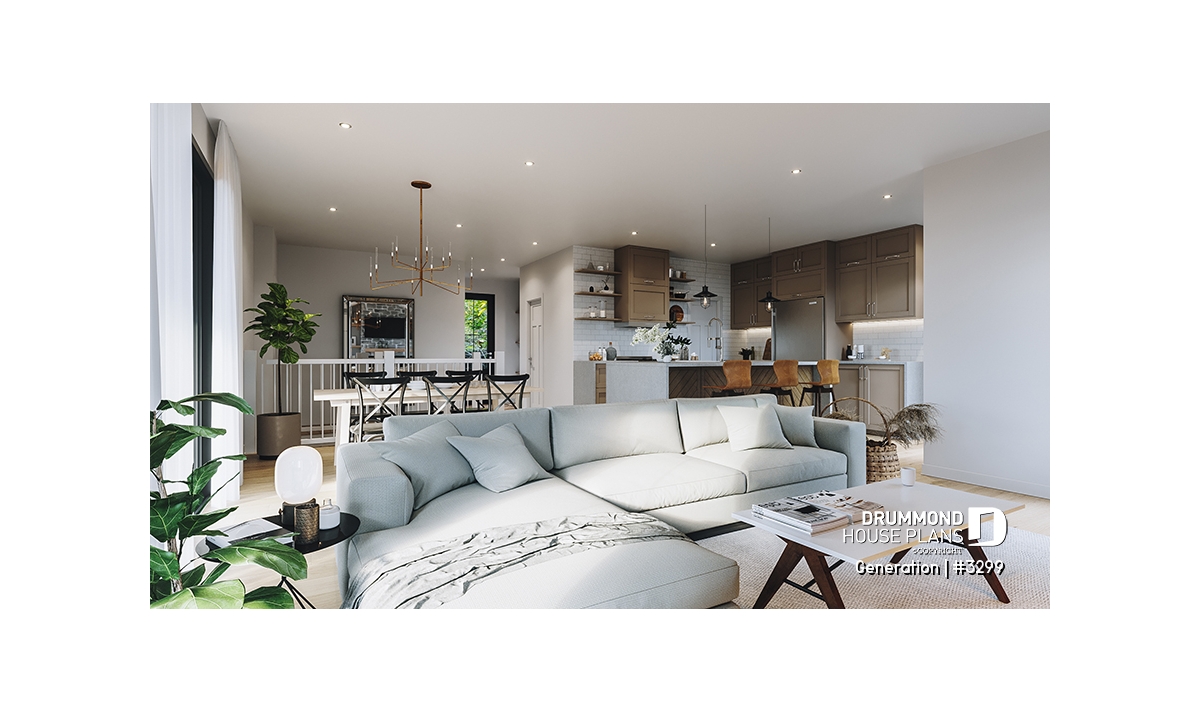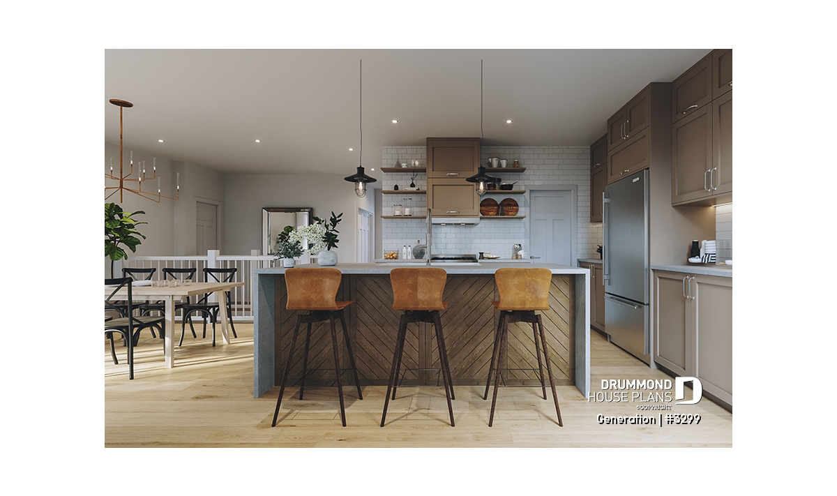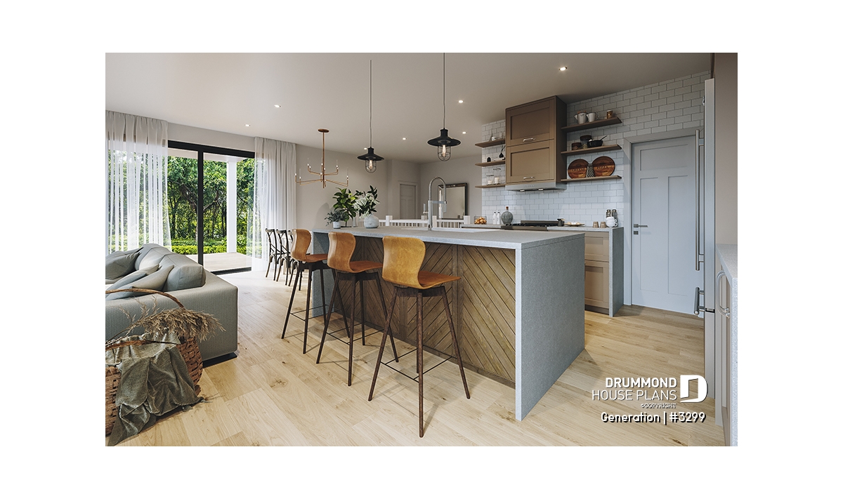 The grandparents 'accommodation is open concept, offers 9' ceilings throughout and is private thanks to its recessed access to the left. It offers a bedroom, a bathroom with stack washer and dryer. In addition the kitchen has an island, a pantry and is open to the living room and dining room. A wardrobe is also positioned not far from the side entrance to store coats, umbrellas and boots. Finally, a large side gallery is covered and large enough to accommodate a few chairs.