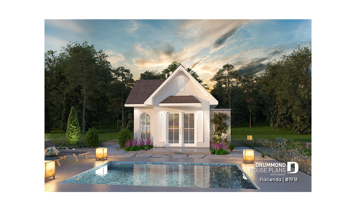 The HACIENDA pool house plan (#1918) offers a warm, rustic-inspired design that blends comfort and practicality for everyday outdoor living. With a compact yet efficient 16' x 16' footprint, this cabana is thoughtfully designed to complement a backyard pool area without overwhelming the landscape.