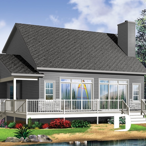 Rear view - BASE MODEL - Scandinavian family vacation house plan, 3 bedrooms, 2 storey chalet with mezzanine, wood frames - Harbor