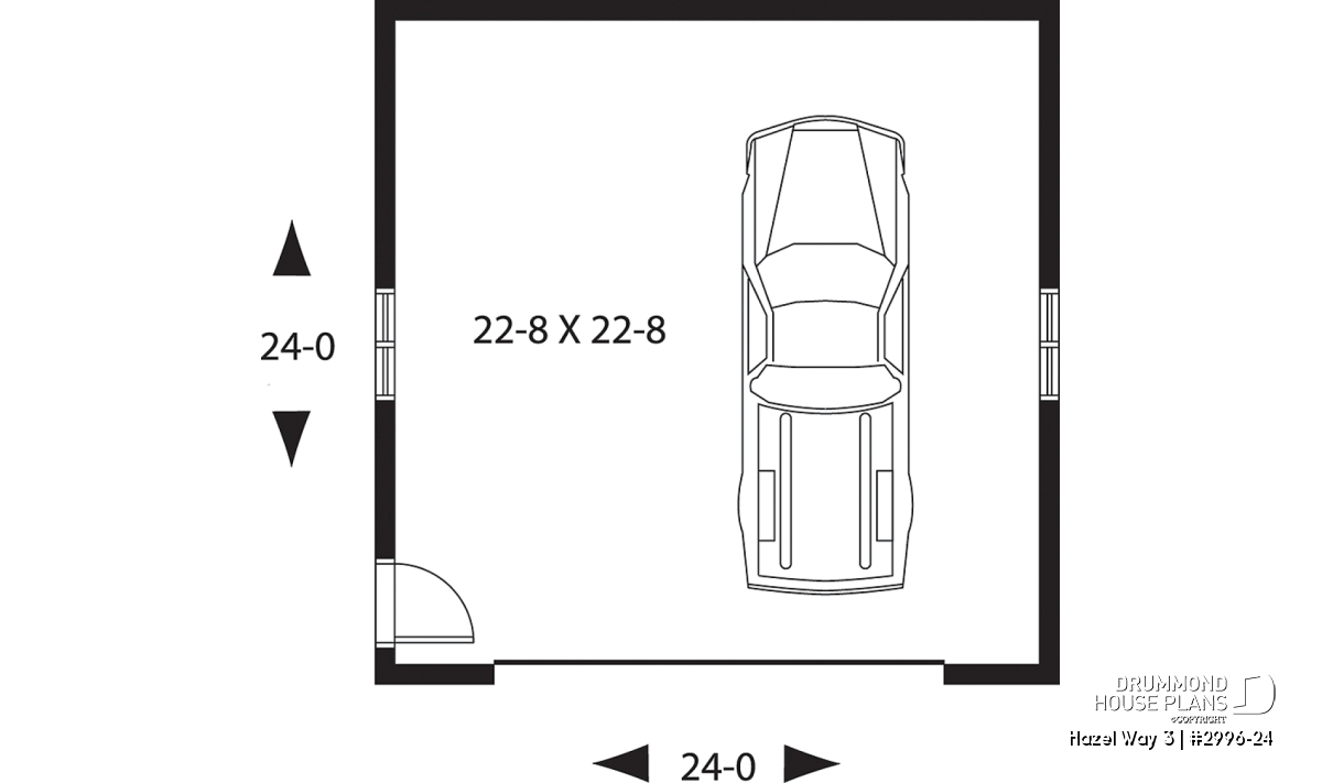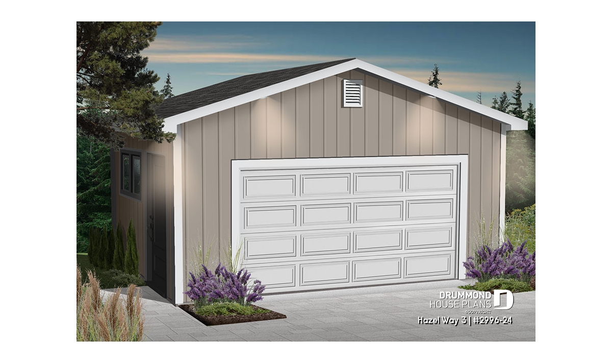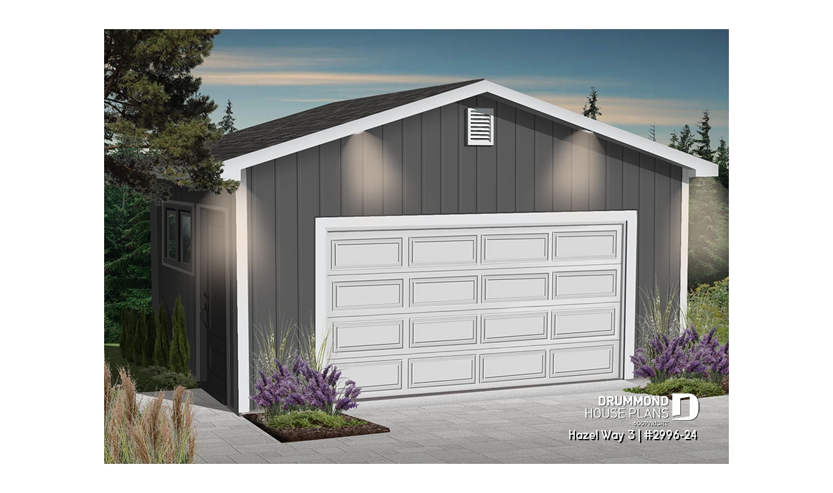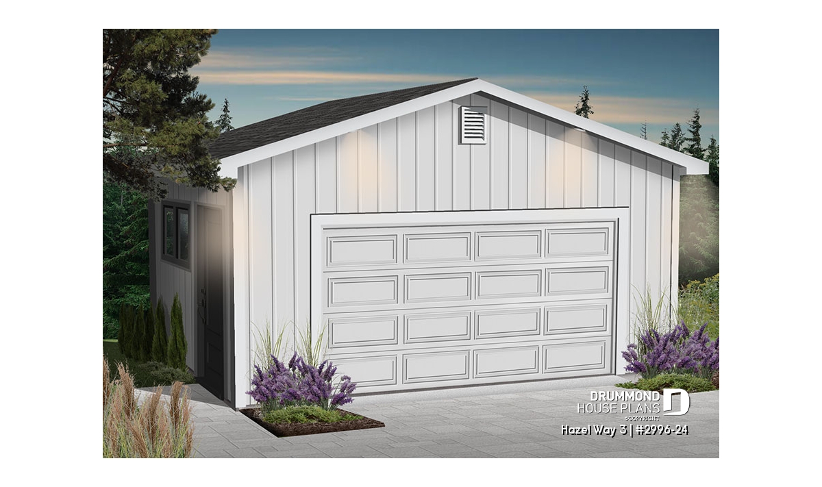 Double garage plan with one garage door. Total of 576 sq.ft. Size: 24' x 24' Foundation: floating slab. Insulated walls. One door and two side windows.