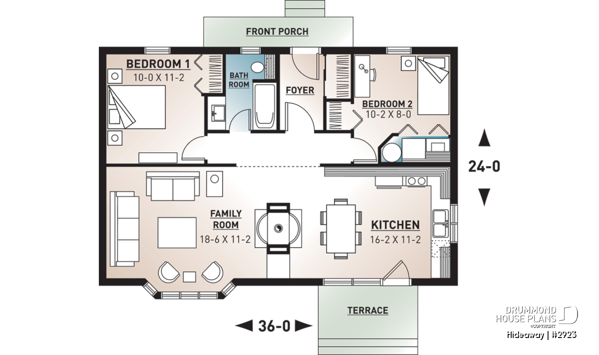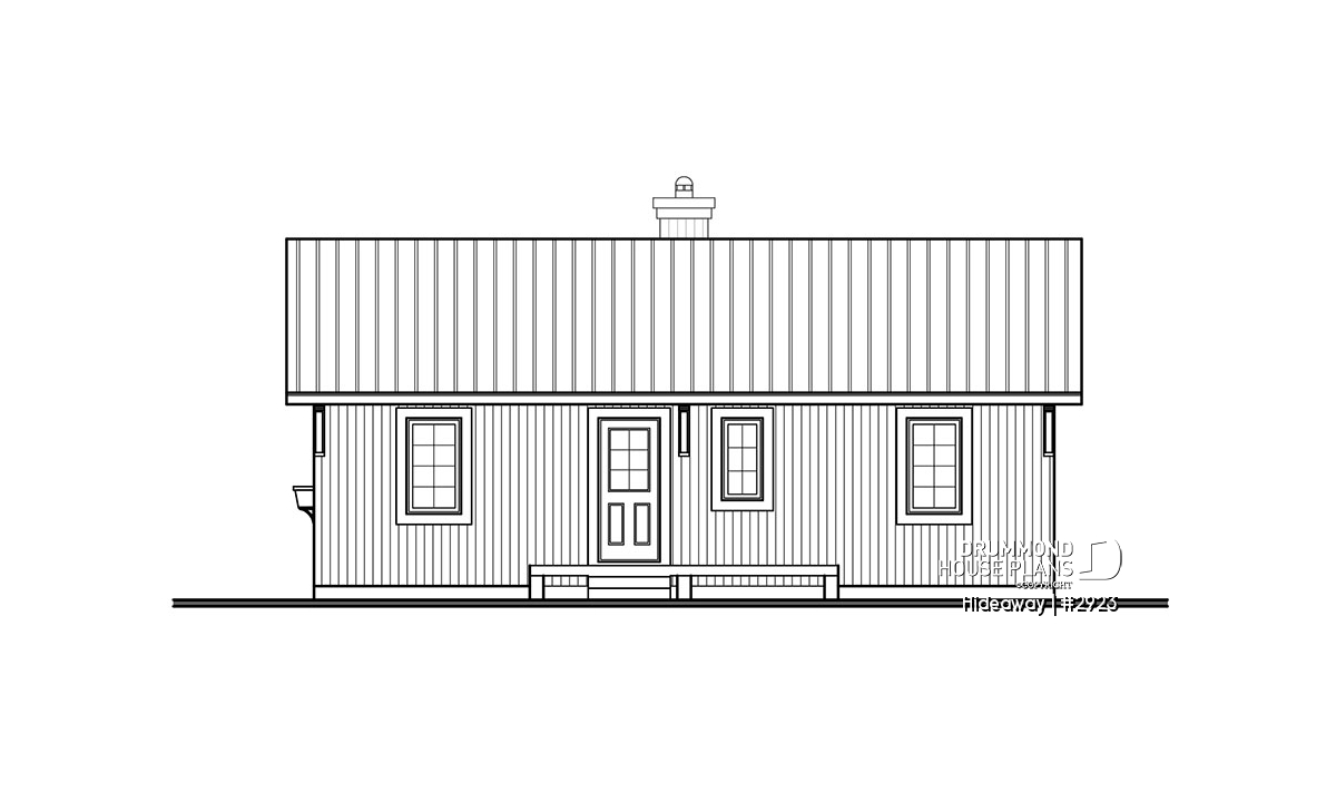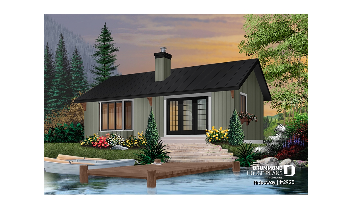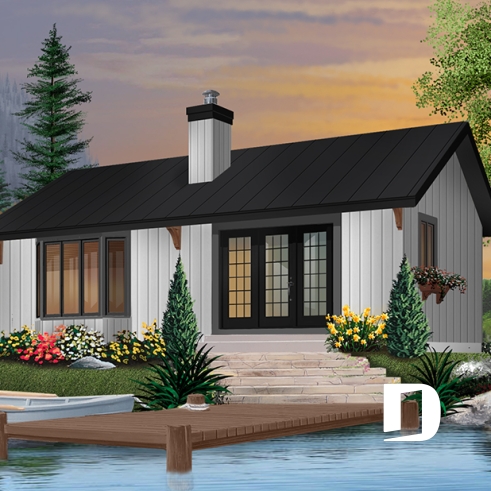 A simple two-bedroom cabin with open living area, divided only by a two-sided fireplace is sure to be your recreation haven. Simple construction with timber accents will make this little cabin right at home in the woods or along a stream.