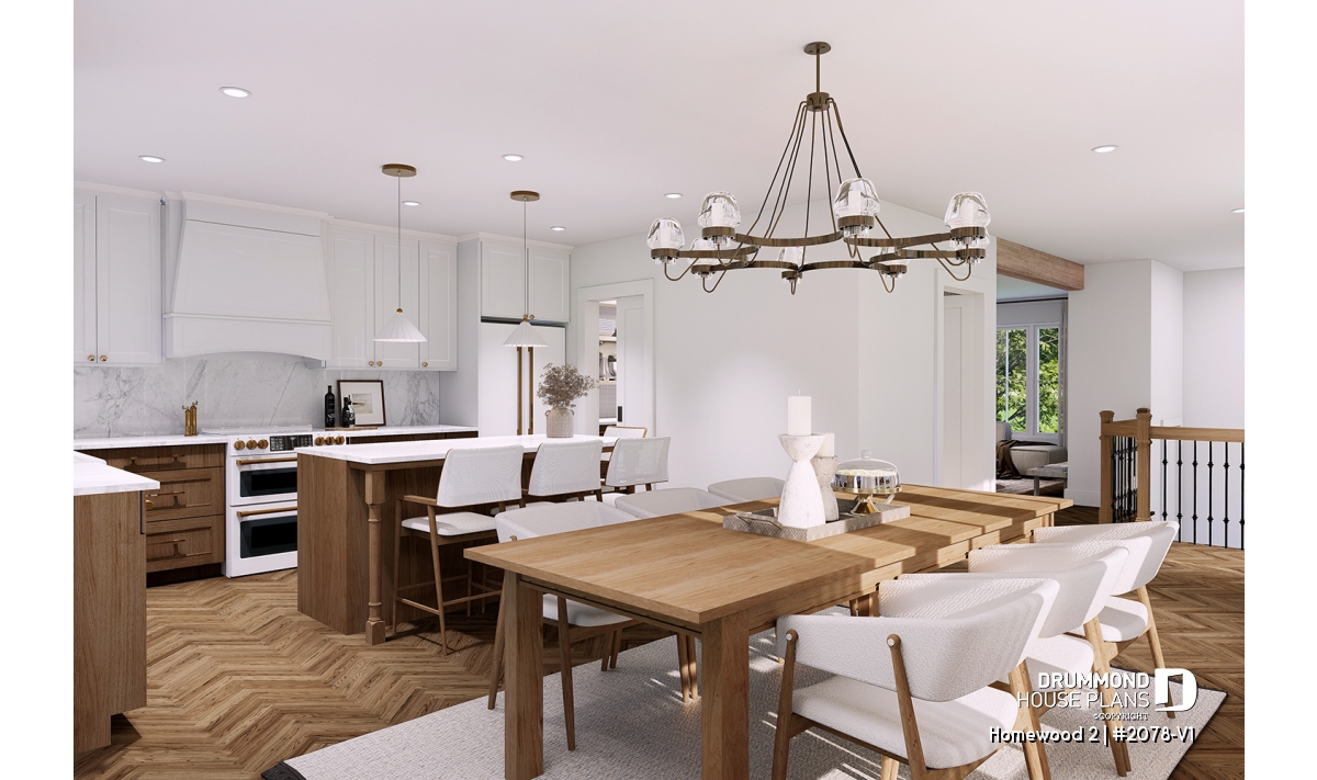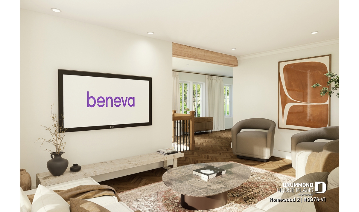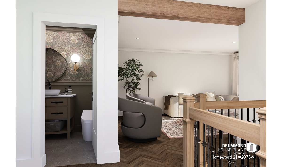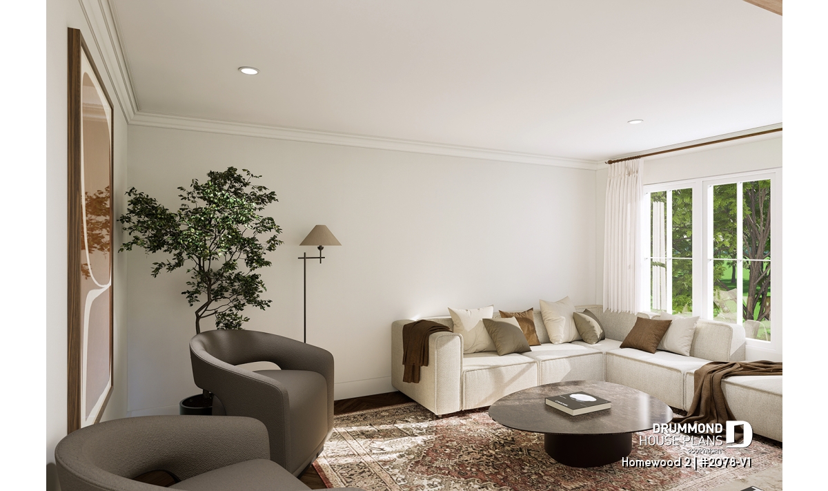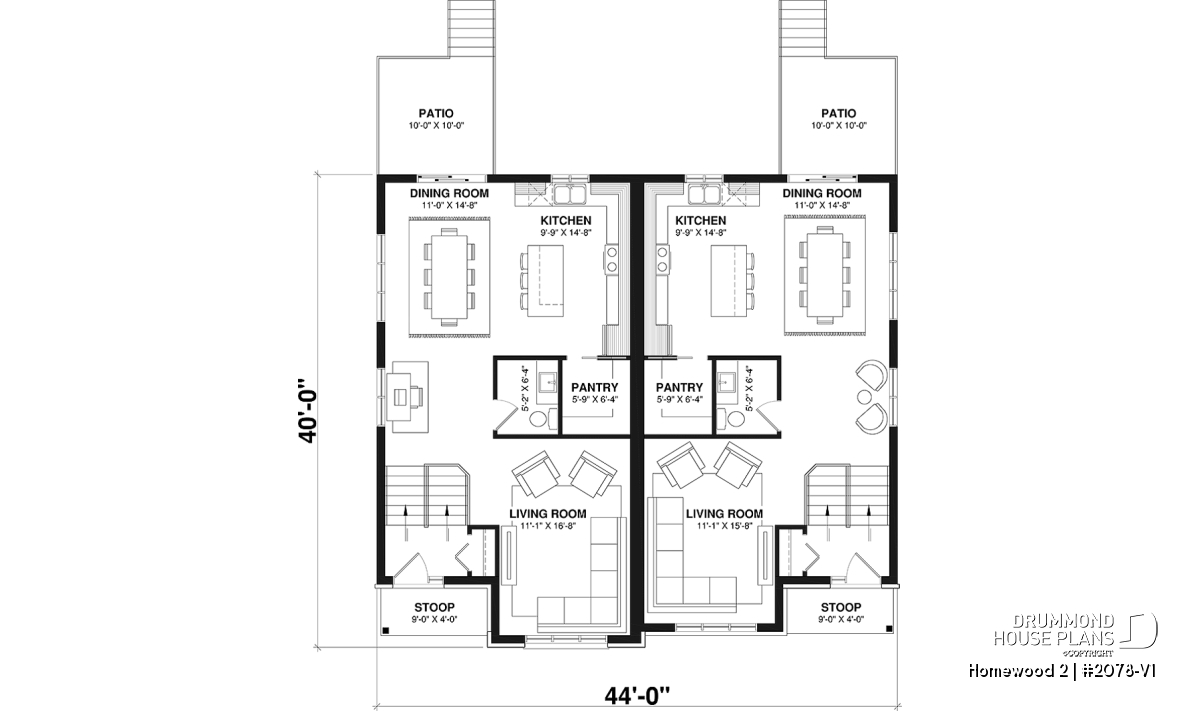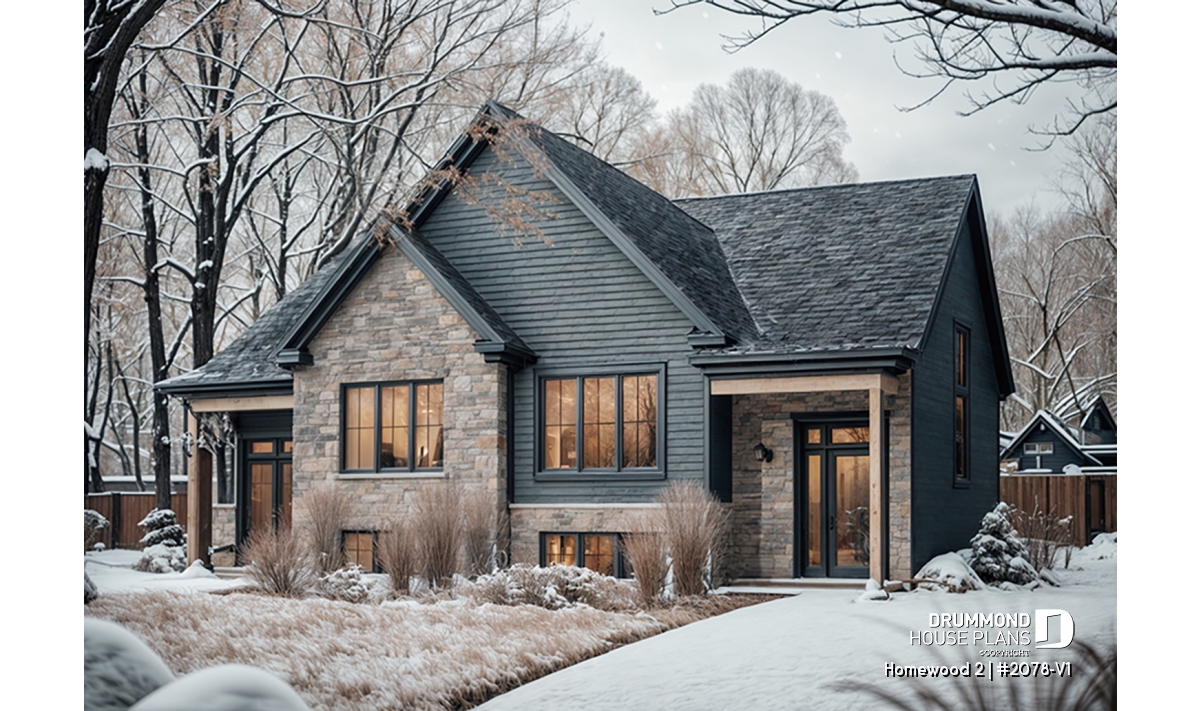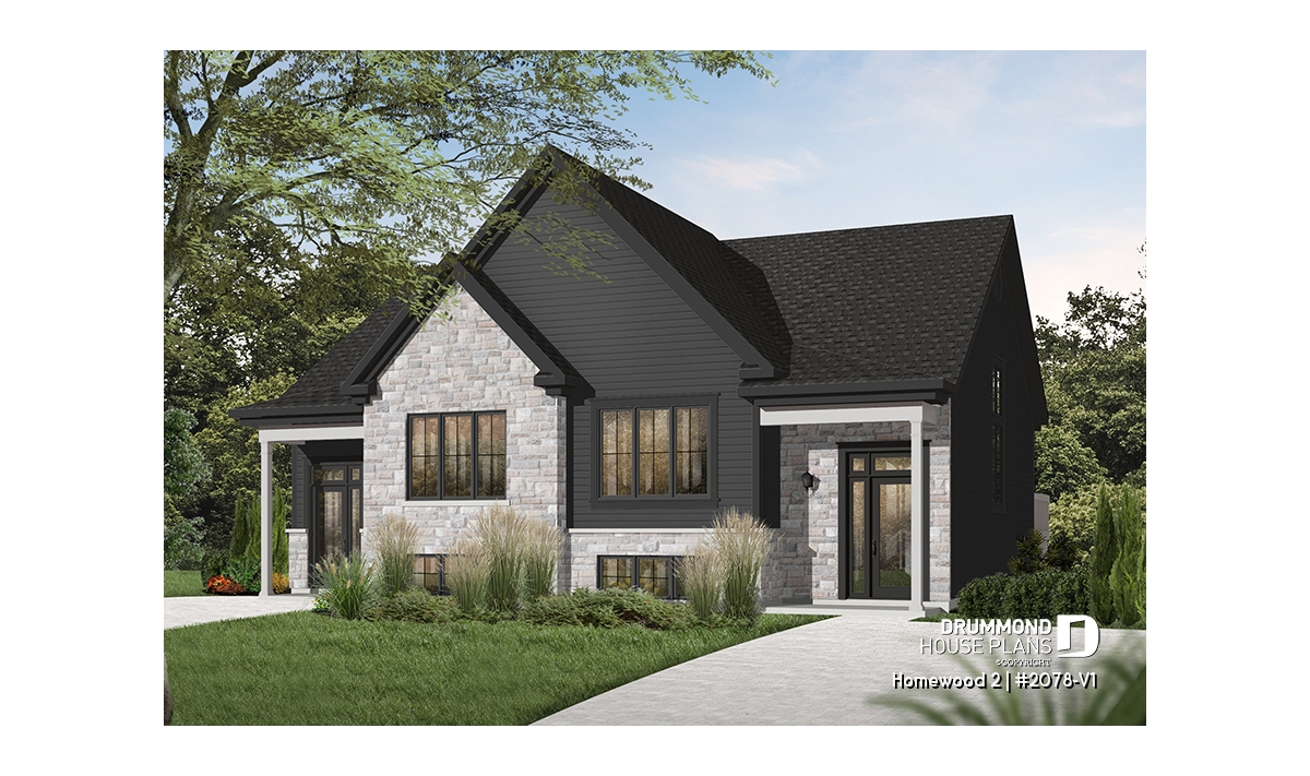 Thanks to discreet placement of entrances, this semi-detached home assures privacy. Handsome stone cladding and pleasing gable details further enhance this home’s charm. The units are close to mirror images of one another.
