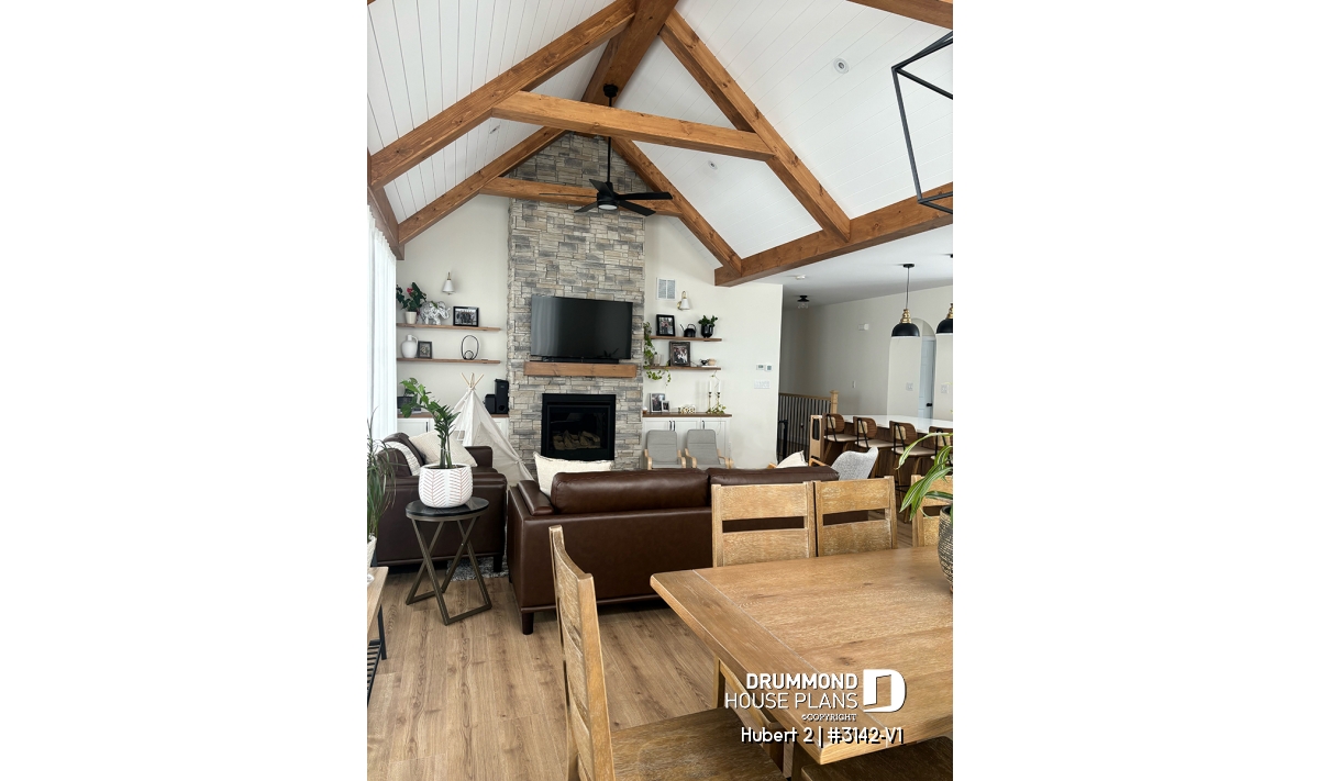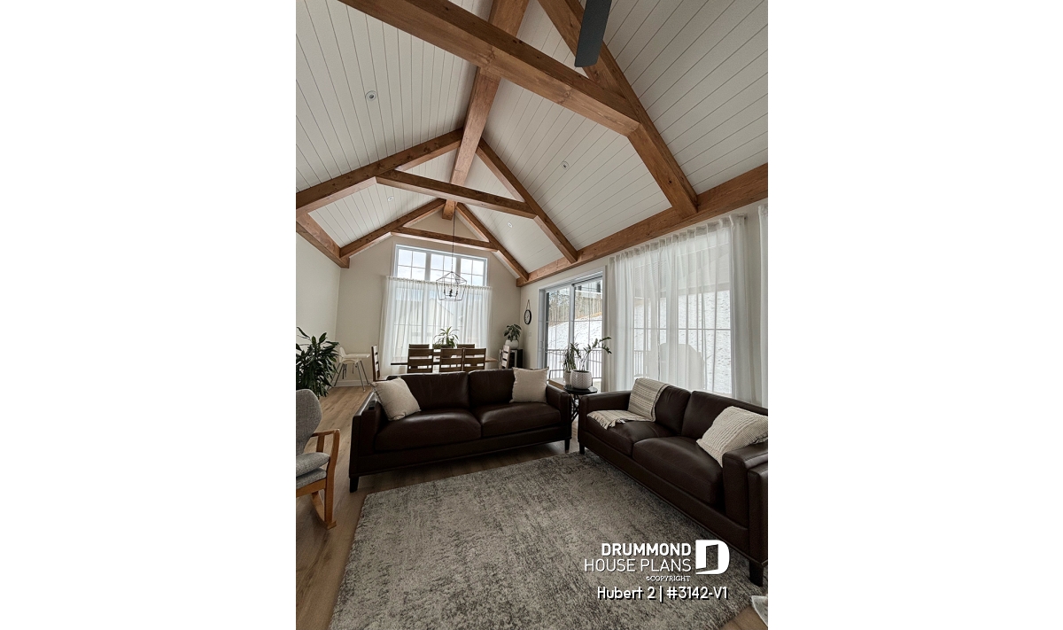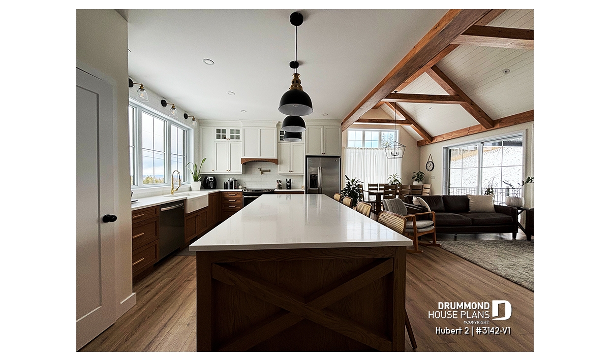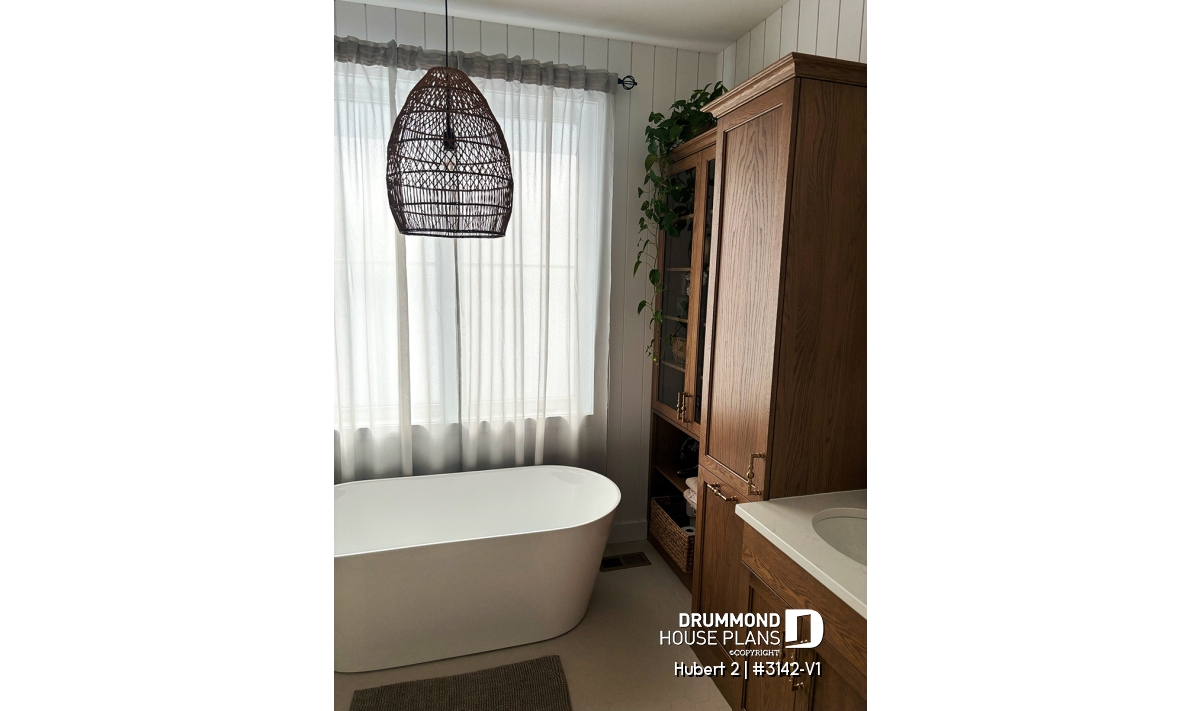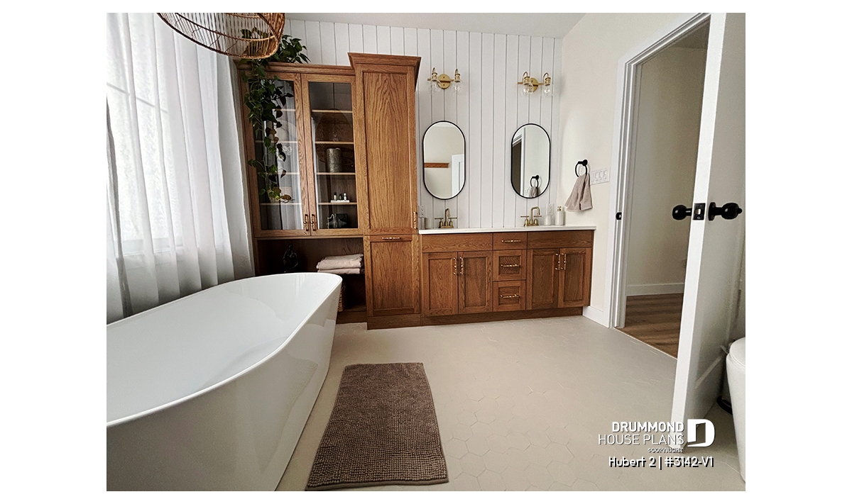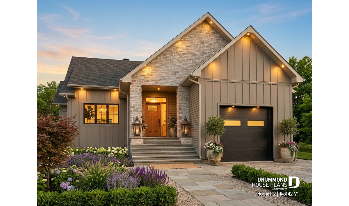 This stunning classic-style bungalow offers a perfect balance of timeless charm, comfort, and functionality. A smaller version of the HUBERT plan (#3142), this model has been thoughtfully redesigned to include an attached garage while maintaining the elegance and efficiency that make it so appealing.