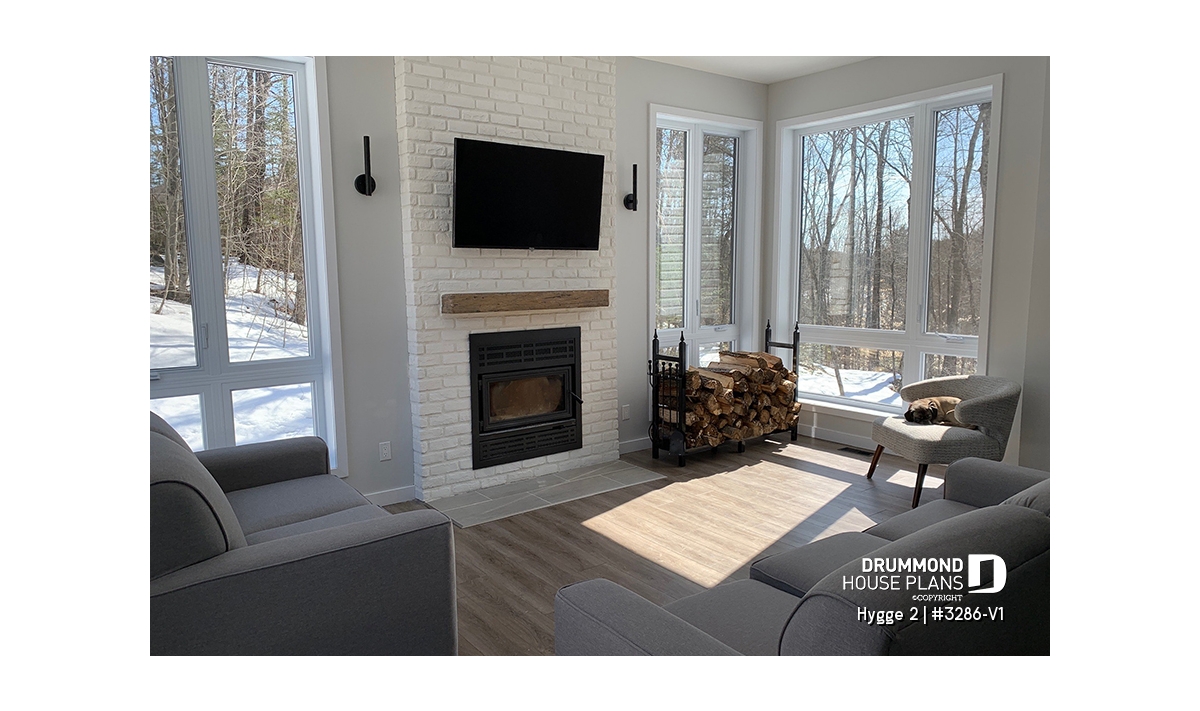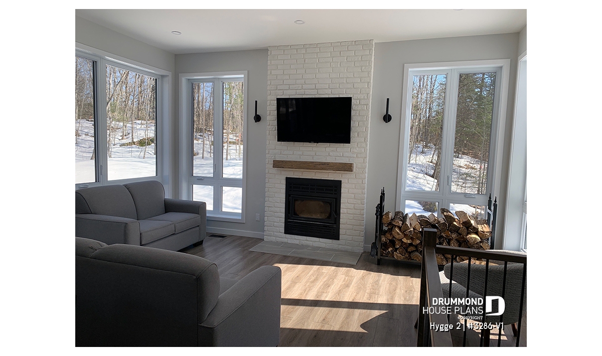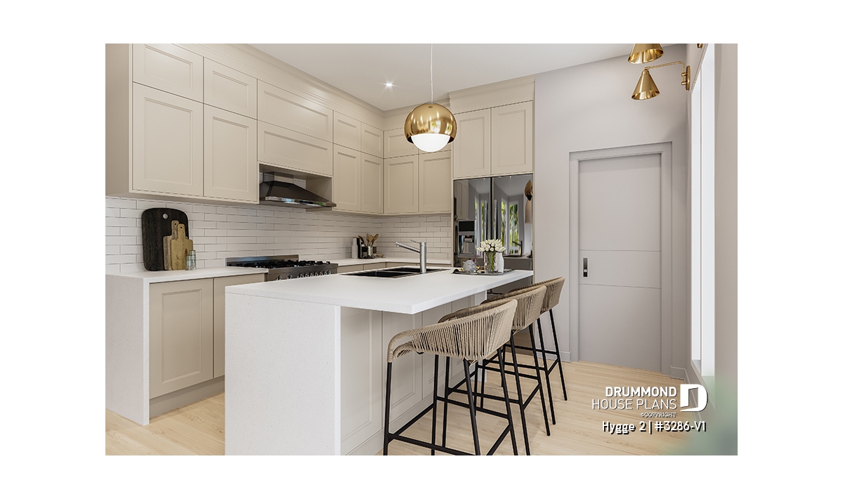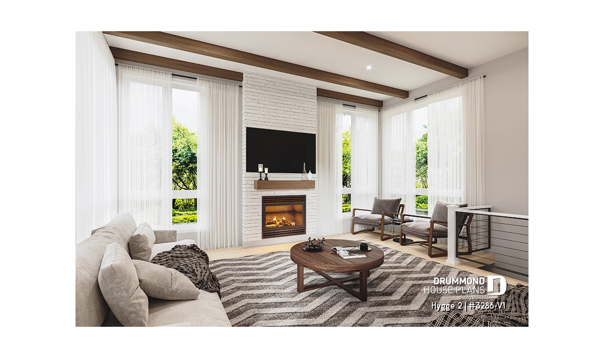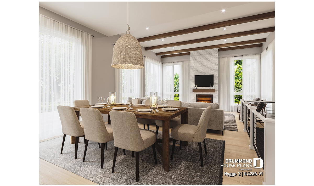The heart of the home is the rear living area, beautifully illuminated by abundant natural light. The kitchen, featuring a large central island and generous pantry, opens fully to the dining area, creating a warm and welcoming environment typical of Scandinavian homes. The adjacent living room, complete with a cozy fireplace and a 10' ceiling, adds comfort and sophistication to this shared space, making it the perfect gathering spot for family time and entertaining.