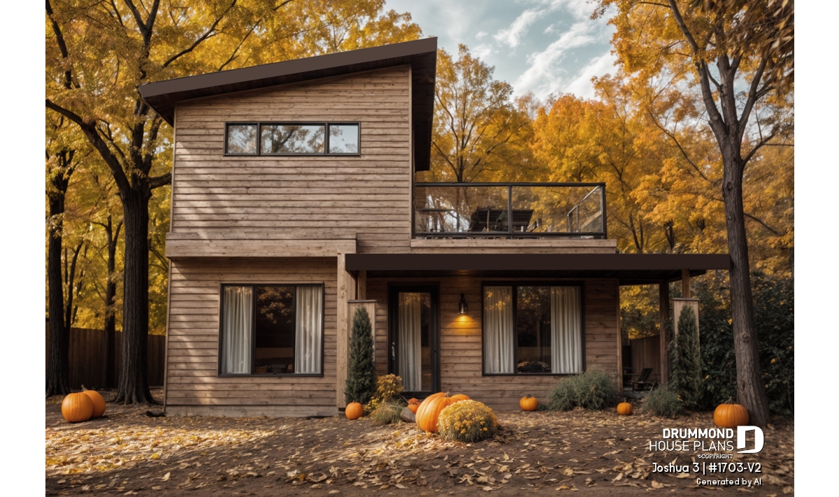 The front balcony is covered, and the side balcony on the right is partially sheltered as well. Depending on the orientation of your house, plan this portion to the south, in order to take advantage of the maximum amount of sunlight in the kitchen, dining room and living room.