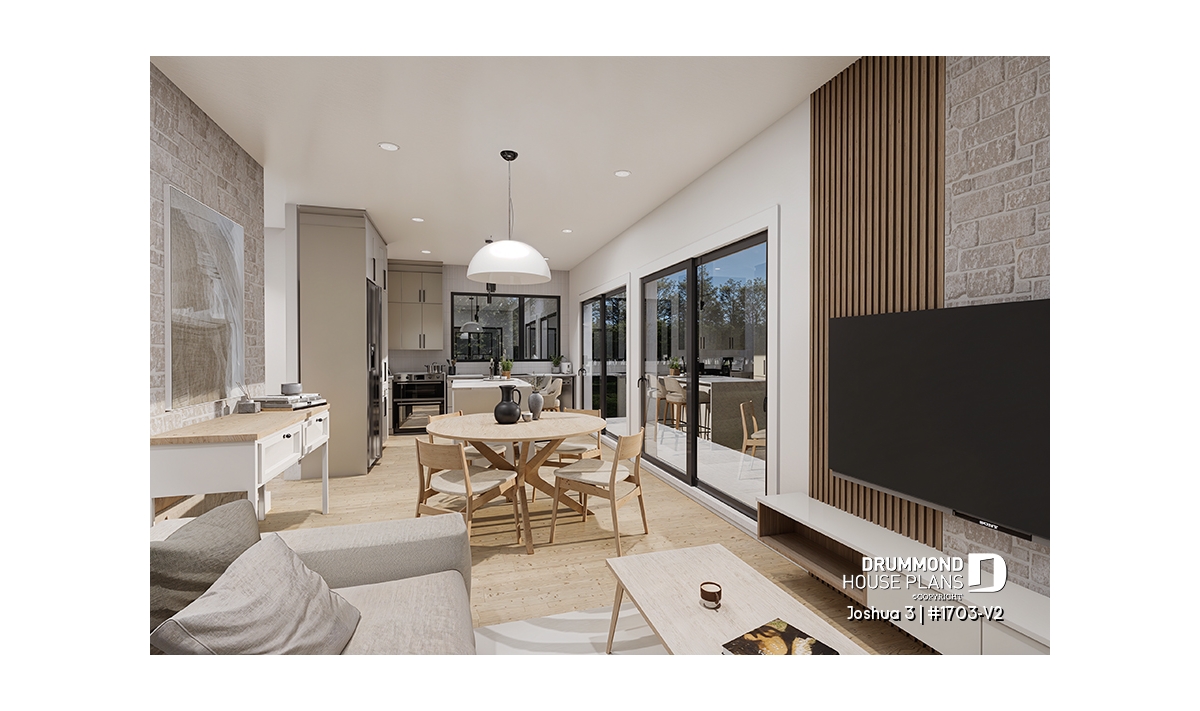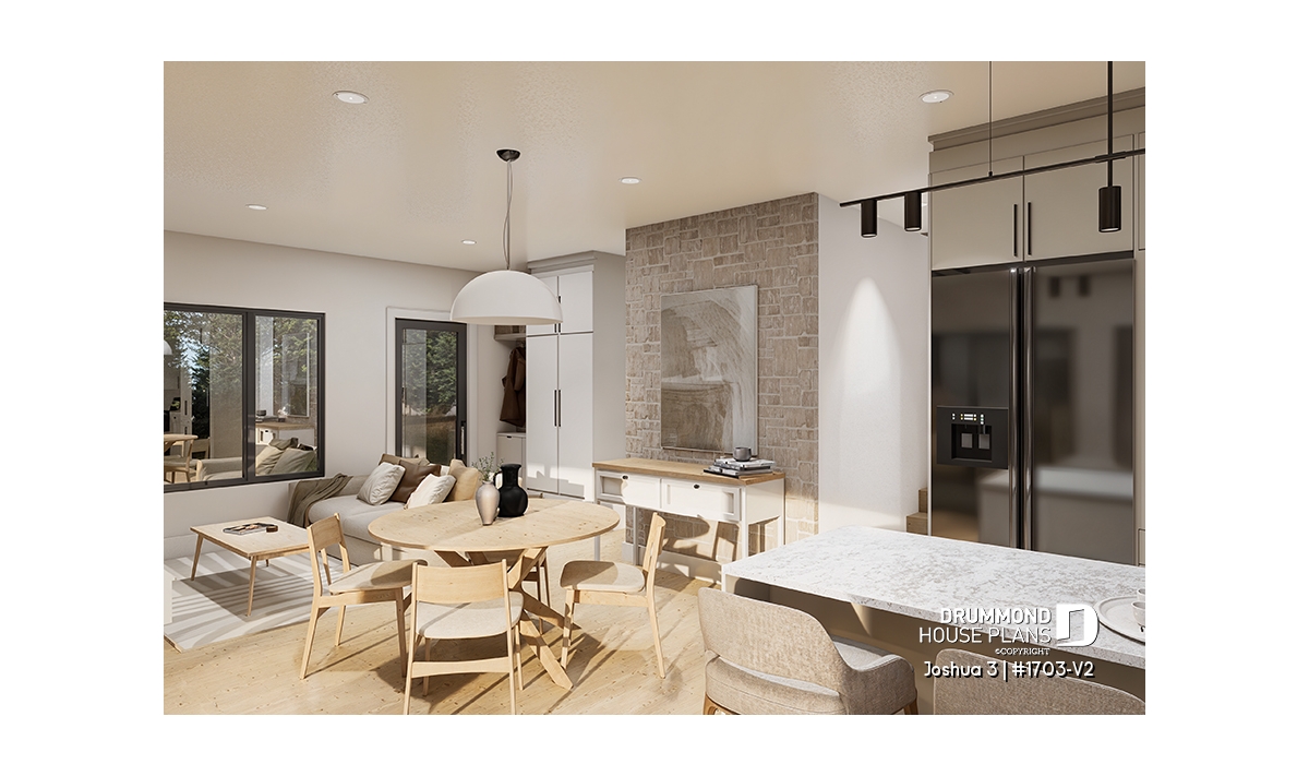 When entering this modern house, a seating area and a dresser are on the left. On the right we see the living room, the kitchen and the dining room which are open concept. This area receives ample natural light via 2 separate patio doors.