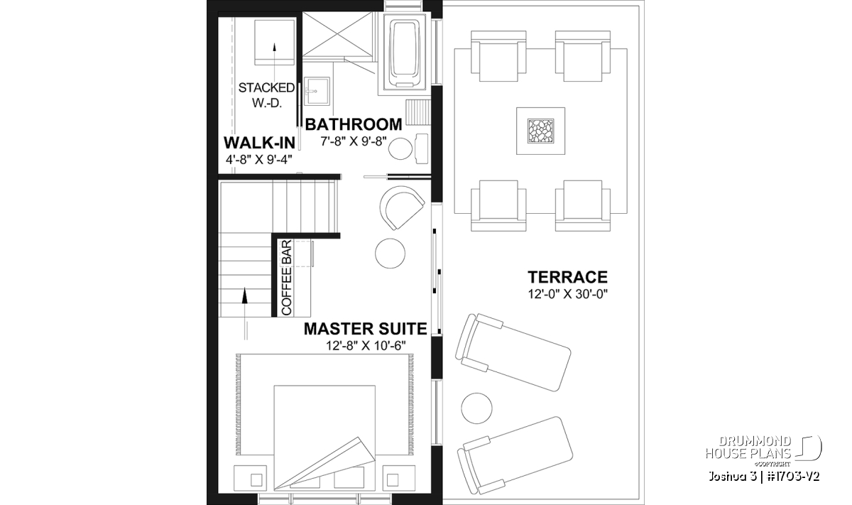 Upstairs is the main bedroom suite. It was designed to ensure good moments of relaxation, with its coffee bar and reading area, as well as private access to the beautiful and large 360 sq. ft. terrace (12' x 30'). In addition, it has a private bathroom with separate bath and shower, and a walk-in closet with stacked washer and dryer.