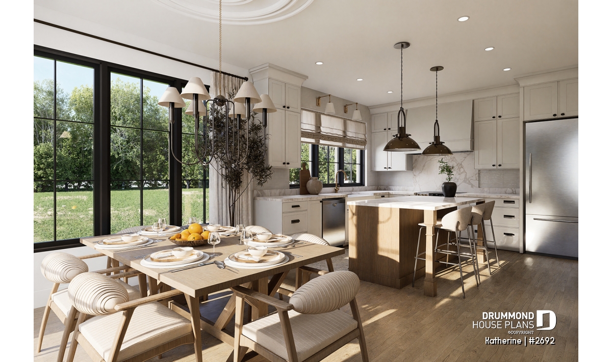 Oversized windows bringing abundant light into the kitchen and dining room.