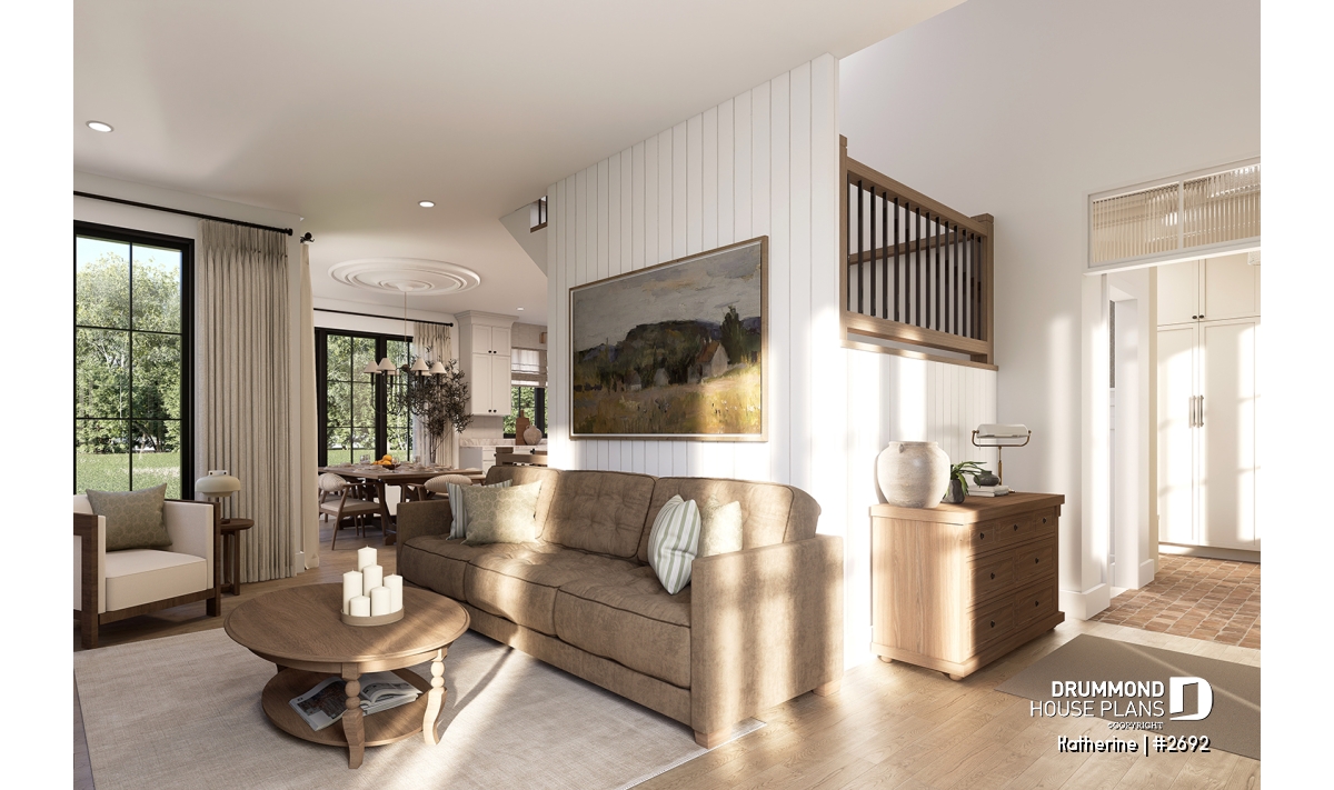 From the moment you arrive, the covered front porch welcomes guests and provides practical protection in all weather. The main entry, open to the second floor, features an impressive 11’10’’ ceiling that amplifies the sense of space and light. The rest of the main floor enjoys 9’ ceilings, enhancing the home’s fluid layout. A mudroom accessible from both the foyer and garage adds convenience, while the powder room is ideally located at the front. Direct access from the garage to the kitchen makes daily life easier, especially when carrying in groceries.
