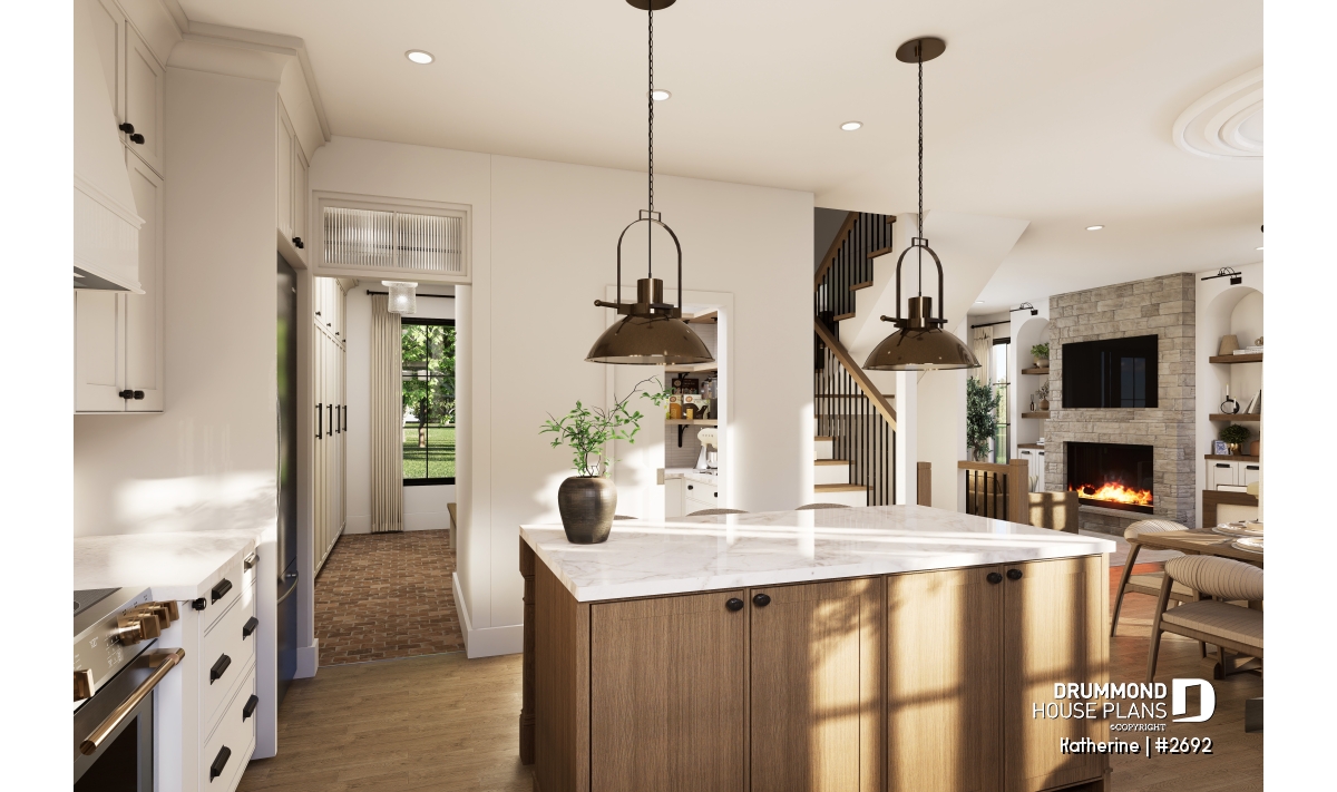 Bright kitchen with large island and spacious pantry, open to the dining area.