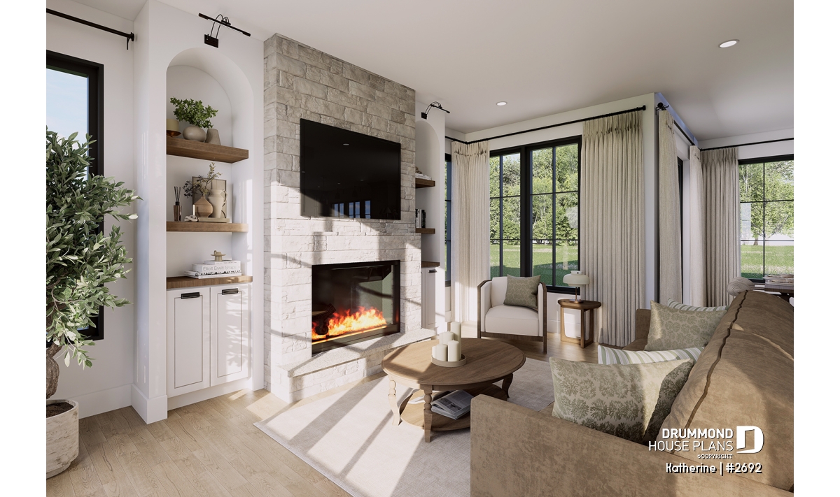 Elegant fireplace at the heart of the living space, framed by two built-ins with arches and storage.