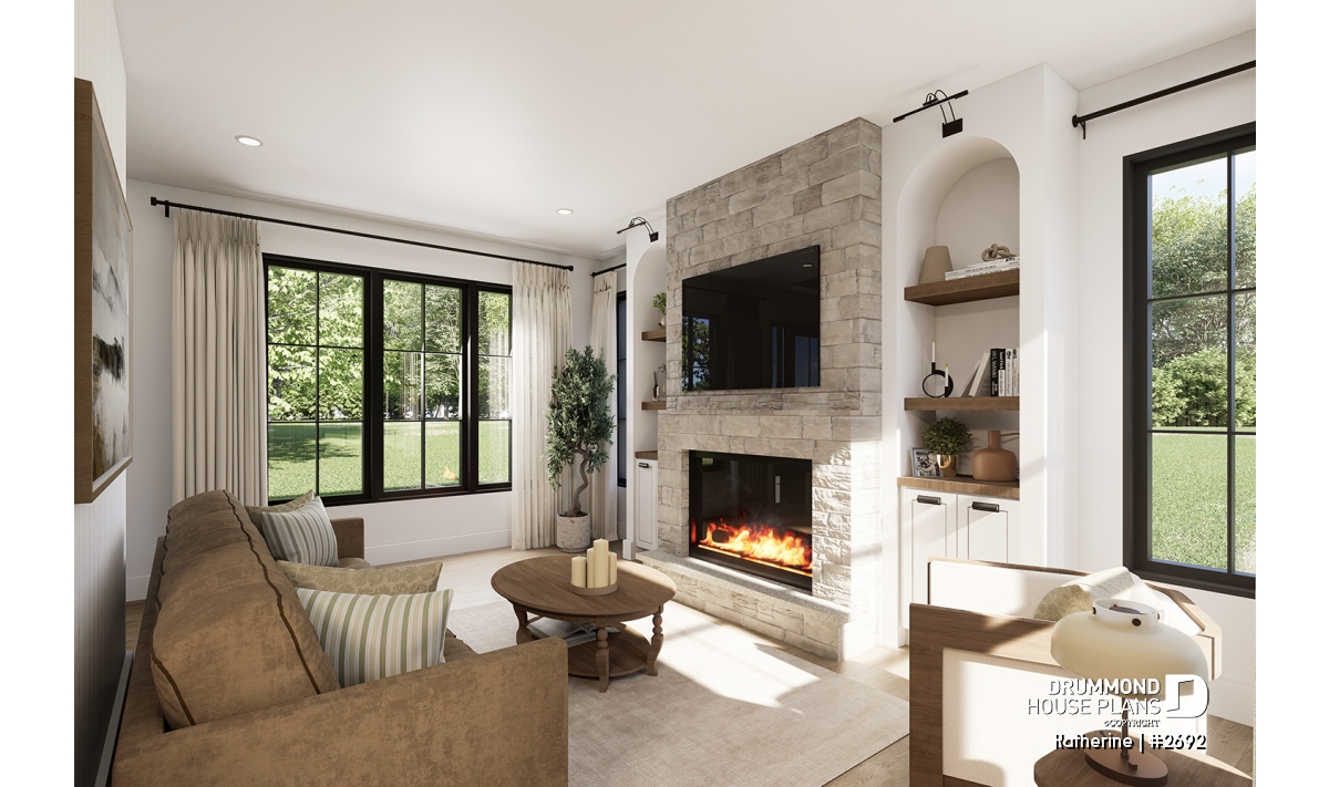 At the heart of the home, the bright kitchen offers a spacious island and generous pantry. It opens onto a dining area filled with natural light from large windows and a patio door leading directly to the covered terrace. This refined and practical outdoor space extends moments of relaxation and gathering throughout the year. The inviting living room is highlighted by an elegant fireplace framed with two built-in units featuring arches and storage, blending style and function beautifully.