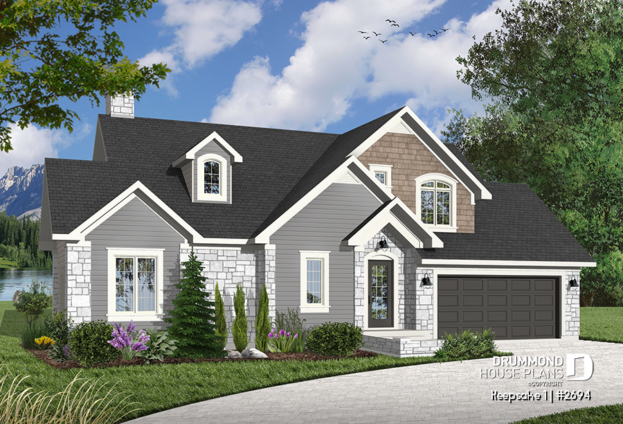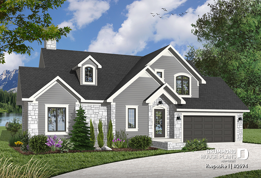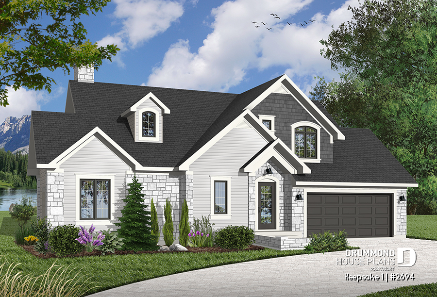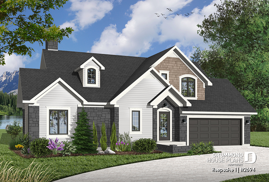 Panoramic view cottage plan, master on main floor, 2-car garage, 4 bedrooms, laundry room